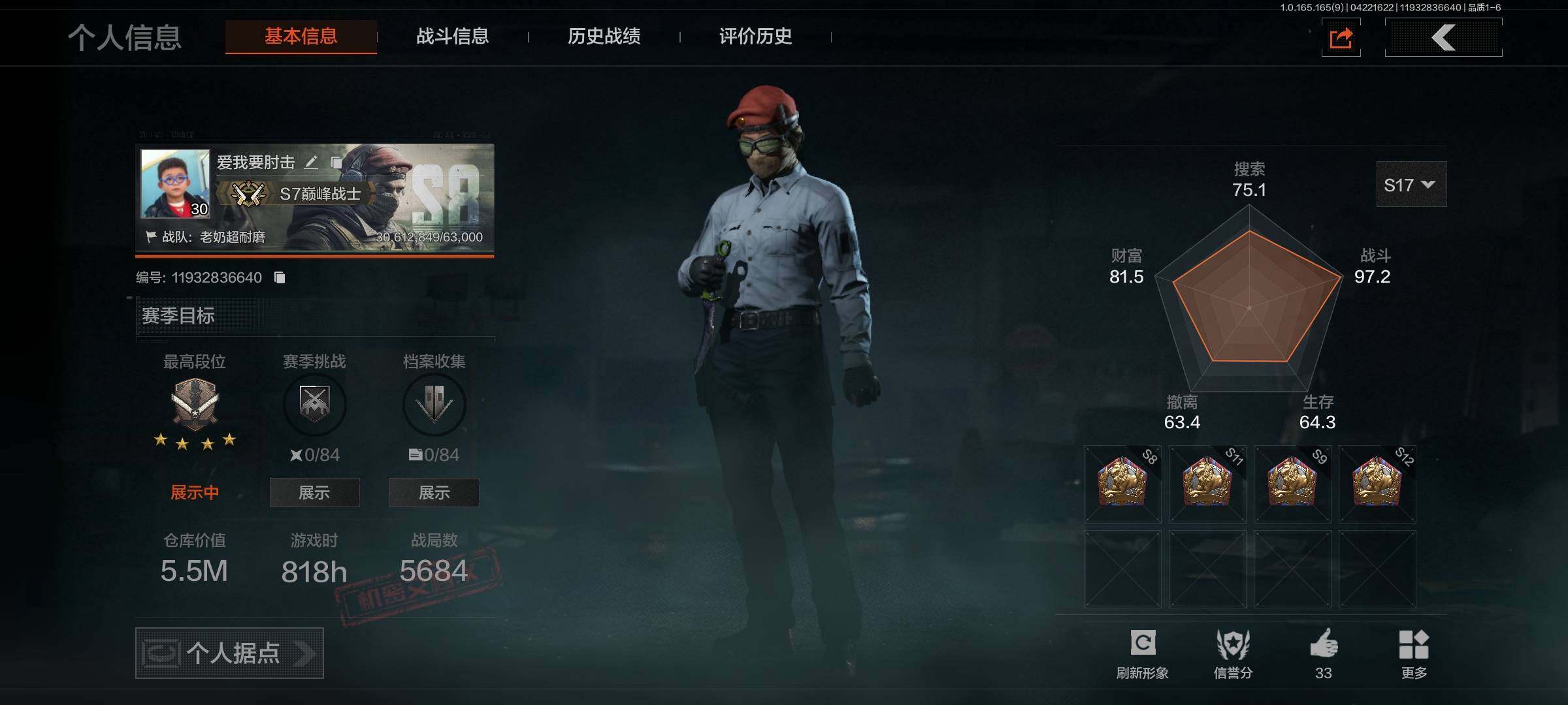 【AQZG2322】等级:30/段位:专家/仓库价值(百万):5.5/柯恩币:521444/野战折刀/工兵铲/来战开山刀/急袭弯刀/精英指虎/热能武器补牢/不败坚守作战服/冰河碎影MK14