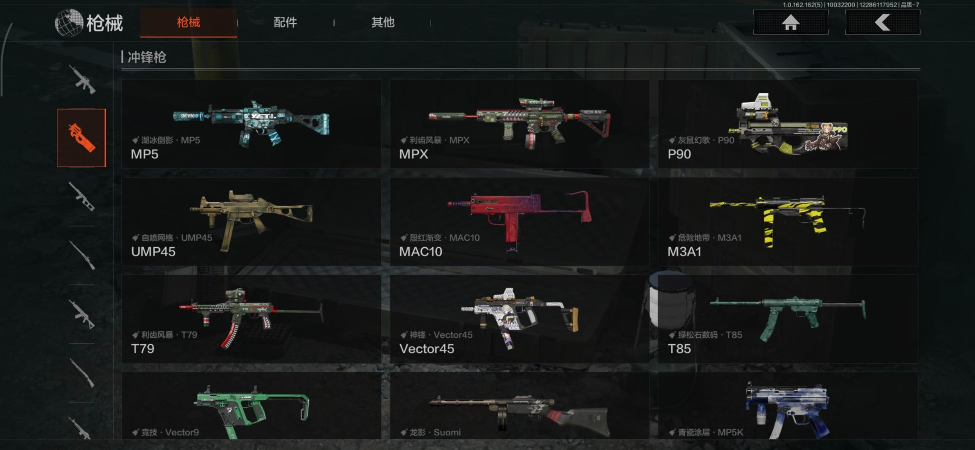 【紫色枪皮】:赢家·F2000,棱光裂变·AK74N,高塔之内·P90,骑士之剑·SJ16,骑士之剑·AKS74U,无畏·USAS12,伦琴计量·T951,竞技·MDR,利齿风暴·T03,德尔塔小队·M4A1,缟兵玄墨·M110,湖冰倒影·MP5,07式林地迷彩·QBZ191
