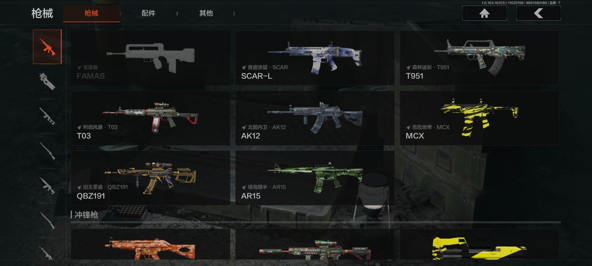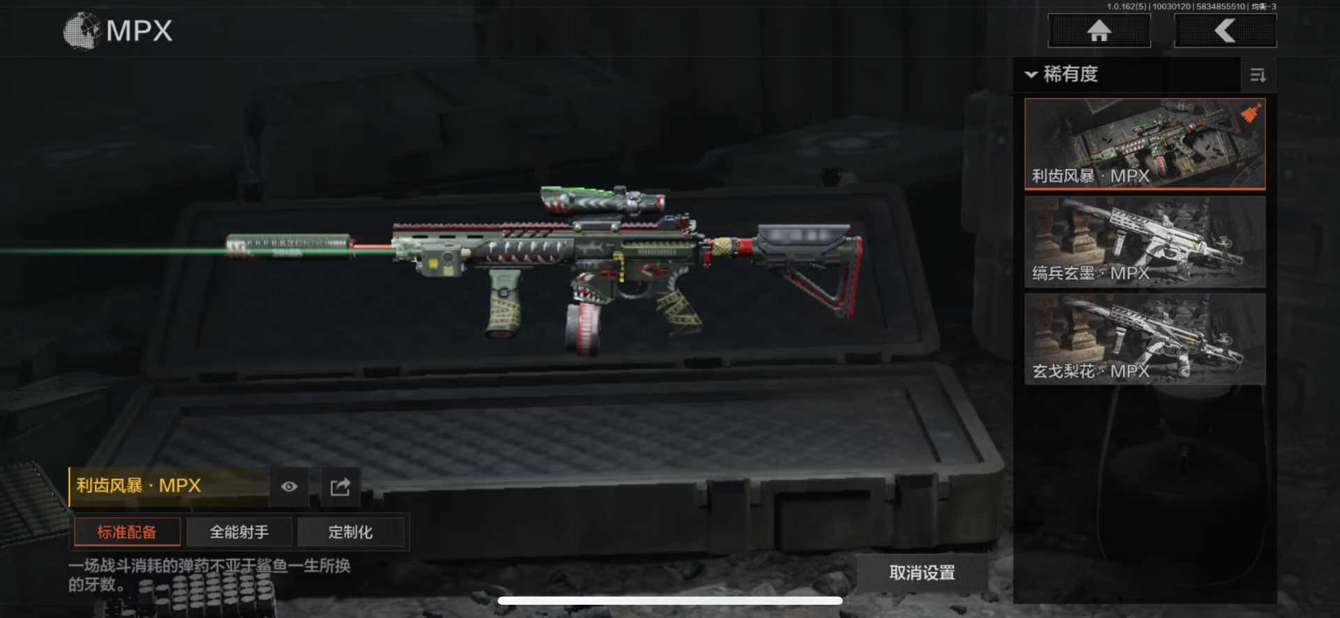 【紫色枪皮】:炎夏浪花·H416,快乐游戏·M110,快乐游戏·MPX,边缘矢量·MPX,伦琴计量·Vector45,骤羽尖啸·AK12,利齿风暴·T03,利齿风暴·T79,来战·AK74N,巅峰·M4A1,涂鸦·AK102,湖冰倒影·ACE31,湖冰倒影·MP5,涂绘猎人·AR57