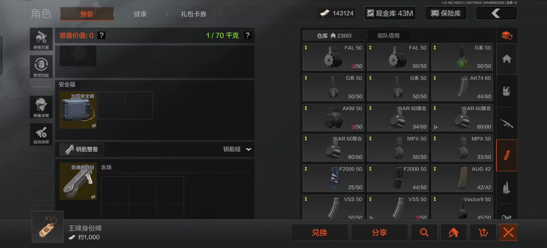 [13836506]库存价值143124 5近战武器 1金套装 1金枪皮 可修改实名 【柯恩币数量】:105.6【角色装扮(金)】:战术甲胄【近战武器】:来战·开山刀,寒牙手刺,工兵铲,明刀·绣春,冬日冰镐【金色枪皮】:旧王圣谕·QBZ191【紫色枪皮】:棱光裂变·AK102,火力倾泻·AUG,炎夏浪花·H416,神锋·Vector45,典礼武备·14,典礼武备·M249,典礼武备·MCX,武侍·SJ16,骤羽尖啸·AK12,鱼跃丹青·DT MDR,壁垒·AN94,林地数码·T03,来战·AK74N,黑金国际·M4A1,雪山之王·MPX,07式林地迷彩·QBZ191,湖冰倒影·MP5,雪山之王·F2000,娜迦·RPK16【角色装扮(紫)】:王国卫队礼装,都市夜影套装,台风II竞技运动服暗区突围 - 安卓 -