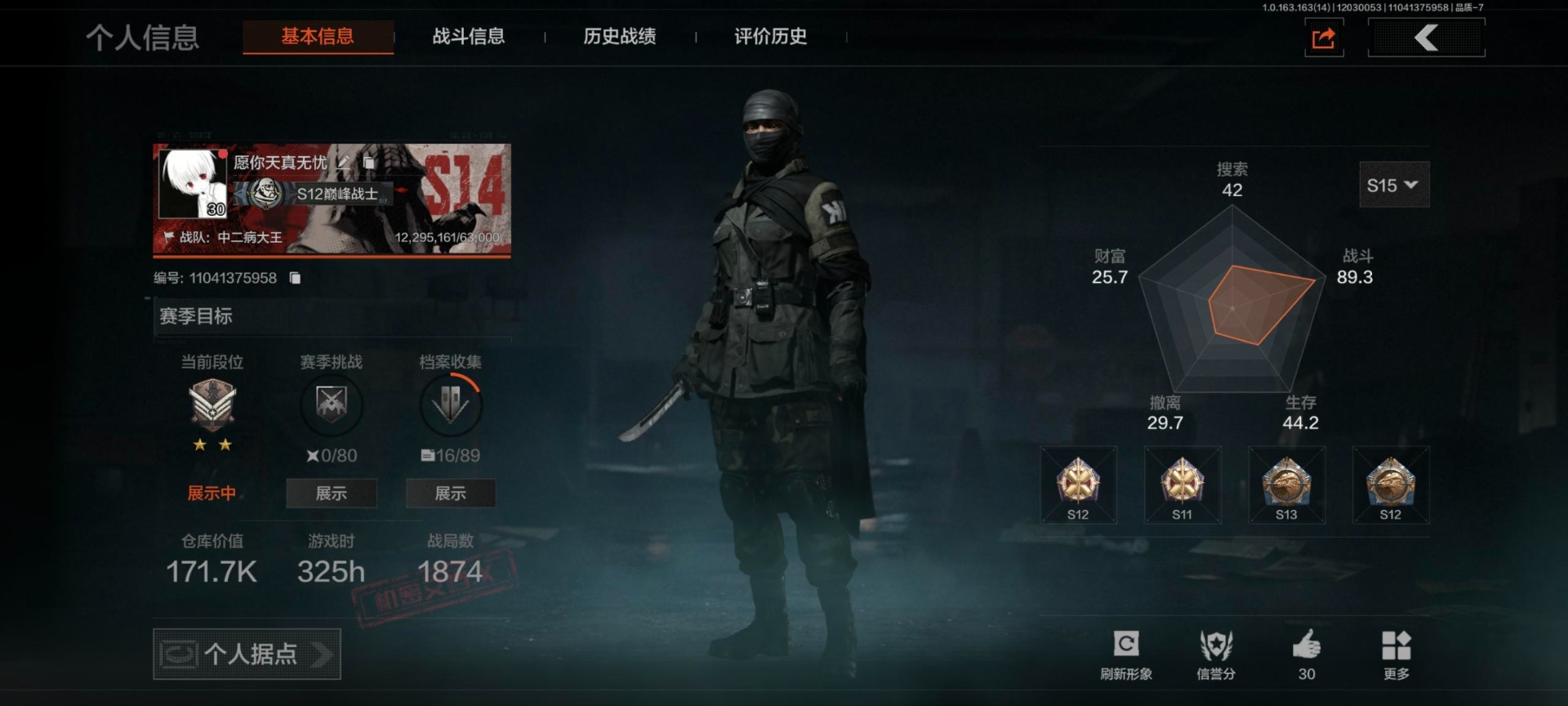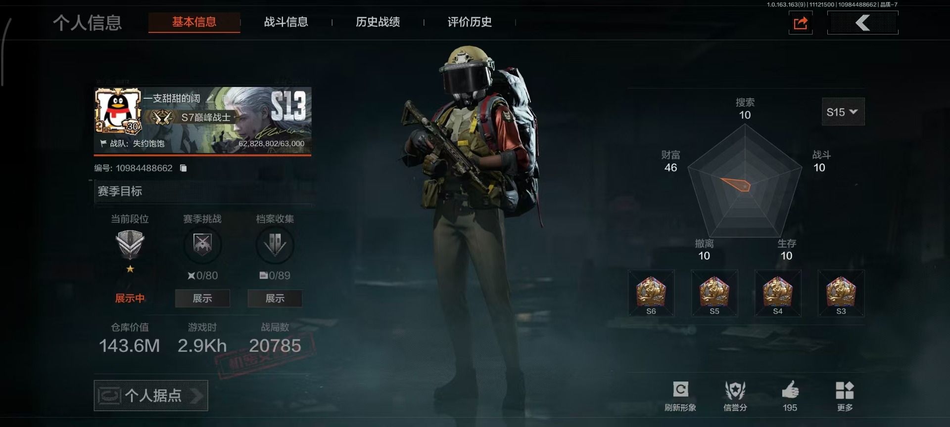 库存价值19.5 6近战武器 2金套装 4金枪皮 可修改 【柯恩币数量】:8921【角色装扮(金)】:火绒·塔莉娅,不败坚守作战服【近战武器】:S-07折刀,热能武器·补牢,赢家匕首,瀚星斩铁,工兵铲,胜利军刀【金色枪皮】:骑士之剑·VSS,旗帜·AEK,棱光裂变·QBU191,林中人·FAL【紫色枪皮】:赢家·F2000,火绒·AK12,最后防线·AKS74U,火力倾泻·AKM,棱光裂变·AK74N,棱光裂变·AK102,高塔之内·P90,骑士之剑·14,骑士之剑·ACE31,无畏·USAS12,百锻寒芒·T03,百锻寒芒·T951,高塔之内·VSS,伦琴计量·SVDS,猩红羽翼·VSS,壁垒·RPK16,黑金国际·M4A1,极恶·AUG,阴影·AN94,玄戈梨花·VSS,07式林地迷彩·QBZ191,光粒子·M110【角色装扮(紫)】:都市夜影套装,台风II竞技运动服