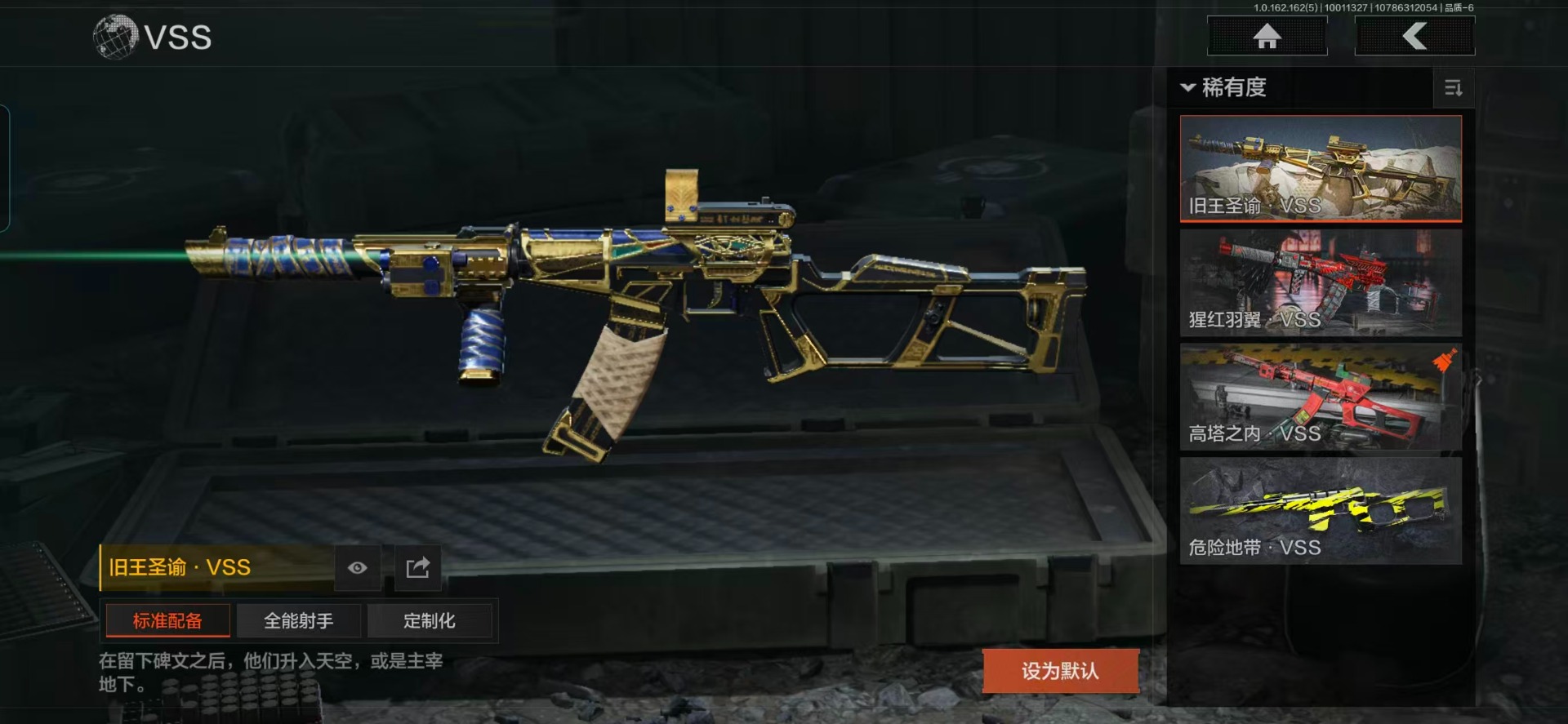 【金色枪皮】:利齿风暴·MPX,旧王圣谕·QBZ191,旧王圣谕·VSS