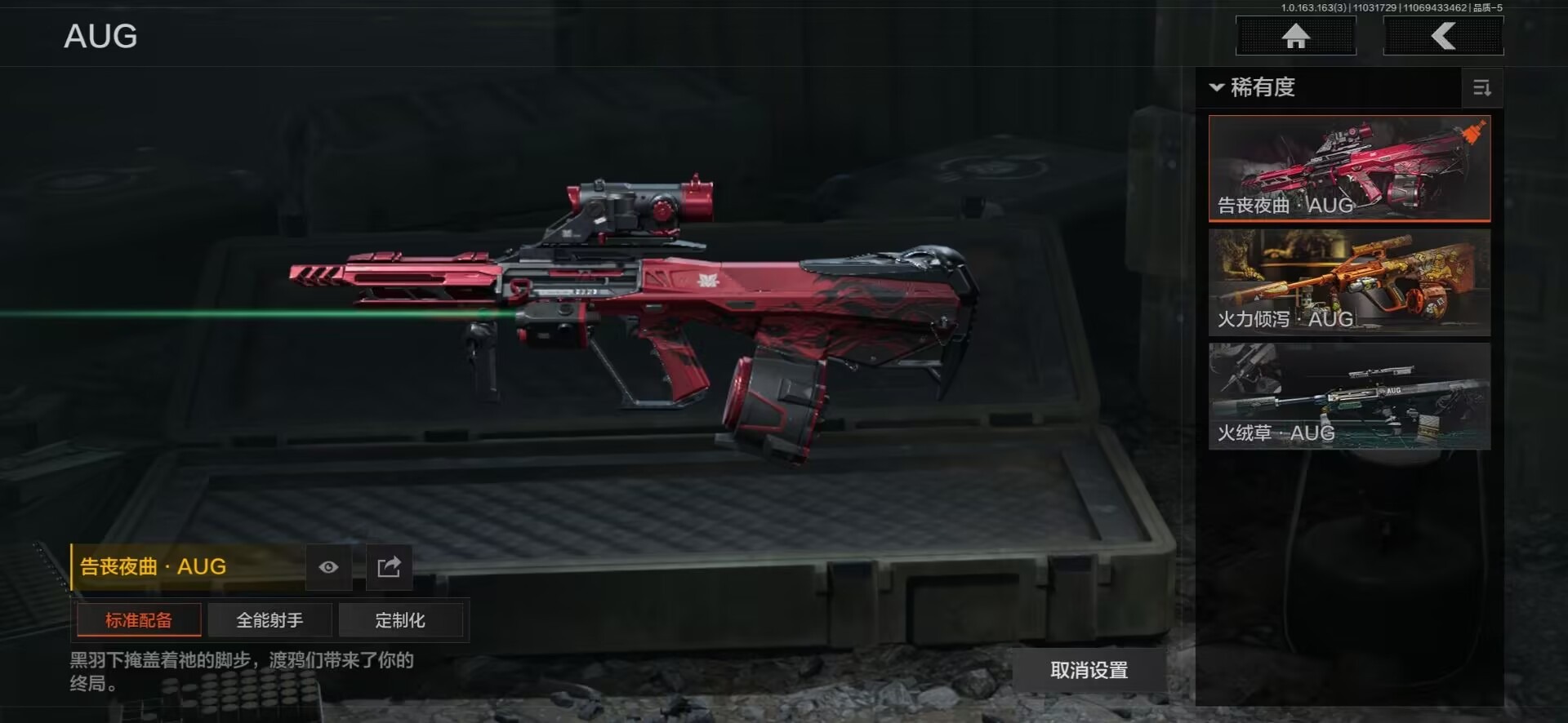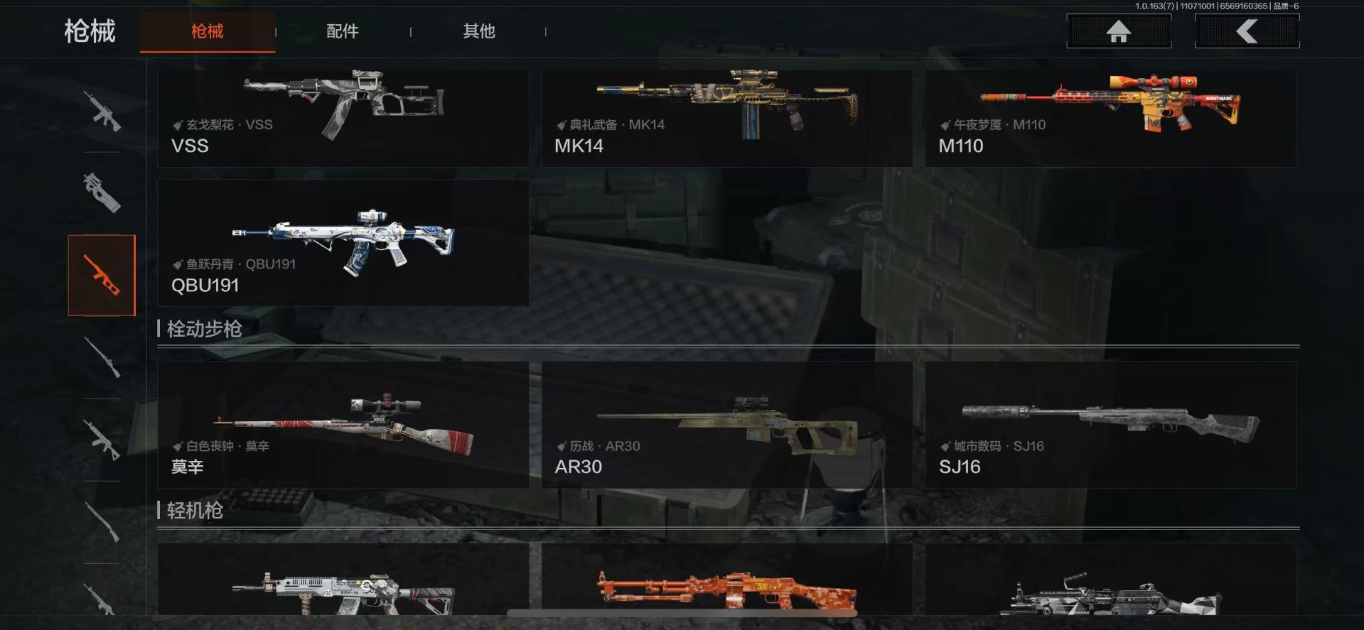 【金色枪皮】:旗帜·AEK,棱光裂变·QBU191,告丧夜曲·AUG,浮鳞影青·QBZ192,旧王圣谕·QBZ191,竞技·FAL,骑士之剑·VSS,蓝色咆哮·H416,冬夜·AK12