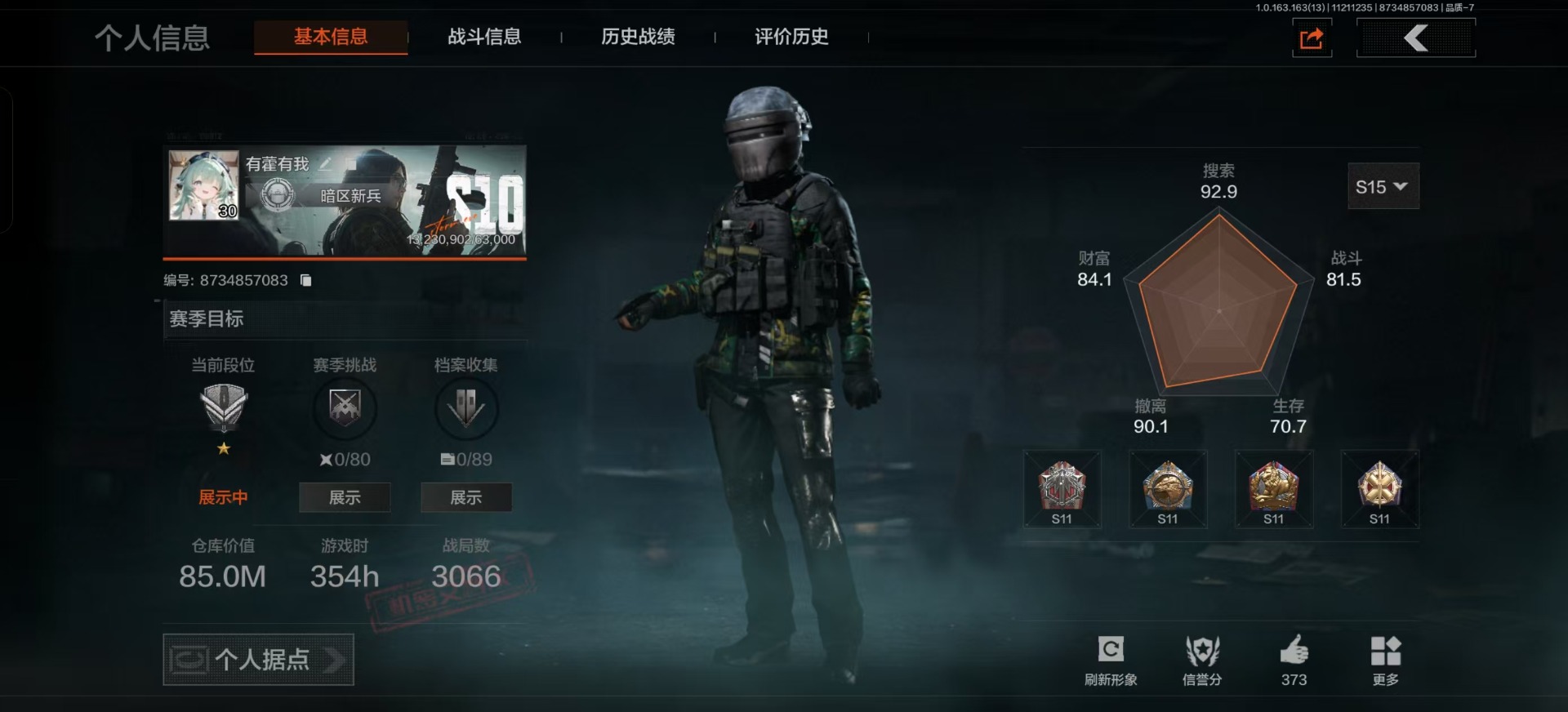 [13959083]库存价值85.0 3近战武器 2金枪皮 可修改实名 【柯恩币数量】:837106 【近战武器】:盘牙·彻甲短刃,工兵铲,野战折刀 【金色枪皮】:旗帜·AEK,蓝色咆哮·H416 【紫色枪皮】:竞技·M110,竞技·MDR,旗帜·SVDS,旗帜·RPK16,鱼跃丹青·MCX,鱼跃丹青·QBU191,07式林地迷彩·QBZ191,火绒草·AUG,和平之手·FAL,神锋·Vector45,灰鼠幻歌·P90,白色丧钟·莫辛,玄戈梨花·MPX,湖冰倒影·MP5 【角色装扮(紫)】:都市夜影套装,鎏金街头套装暗区突围 - 安卓 -
