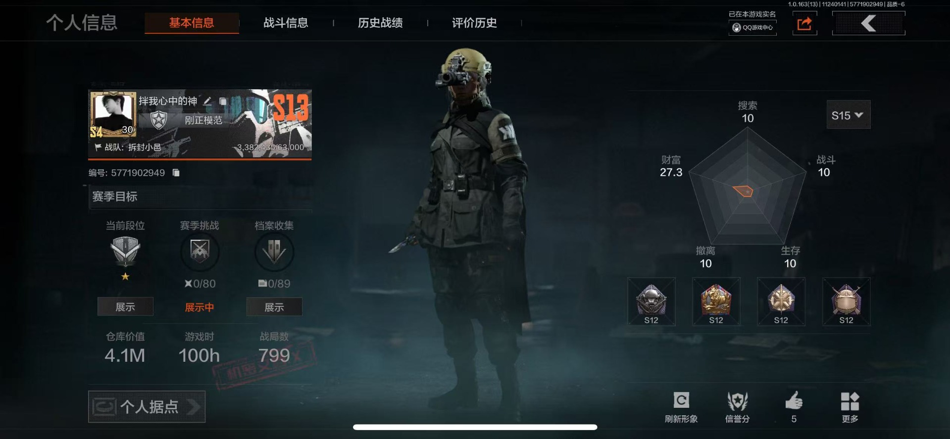 [13925592]库存价值80.6 3近战武器 3金枪皮 可修改实名 【柯恩币数量】:3358 【近战武器】:S-07折刀,热能武器·补牢,工兵铲 【金色枪皮】:利齿风暴·MPX,旧王圣谕·QBZ191,旧王圣谕·VSS 【紫色枪皮】:火力倾泻·AKM,高塔之内·P90,高塔之内·VSS,典礼武备·S12K,典礼武备·14,鱼跃丹青·QBU191,武侍·SJ16,超越自我·Vector9,超越自我·AR30,竞技·M110,鱼跃丹青·DT MDR,骤羽尖啸·AK12,利齿风暴·T03,利齿风暴·T79,猩红羽翼·VSS,鱼跃丹青·MCX 【角色装扮(紫)】:金狮护身·转运套装,鎏金街头套装,都市夜影套装,王国卫队礼装暗区突围 - 安卓 -