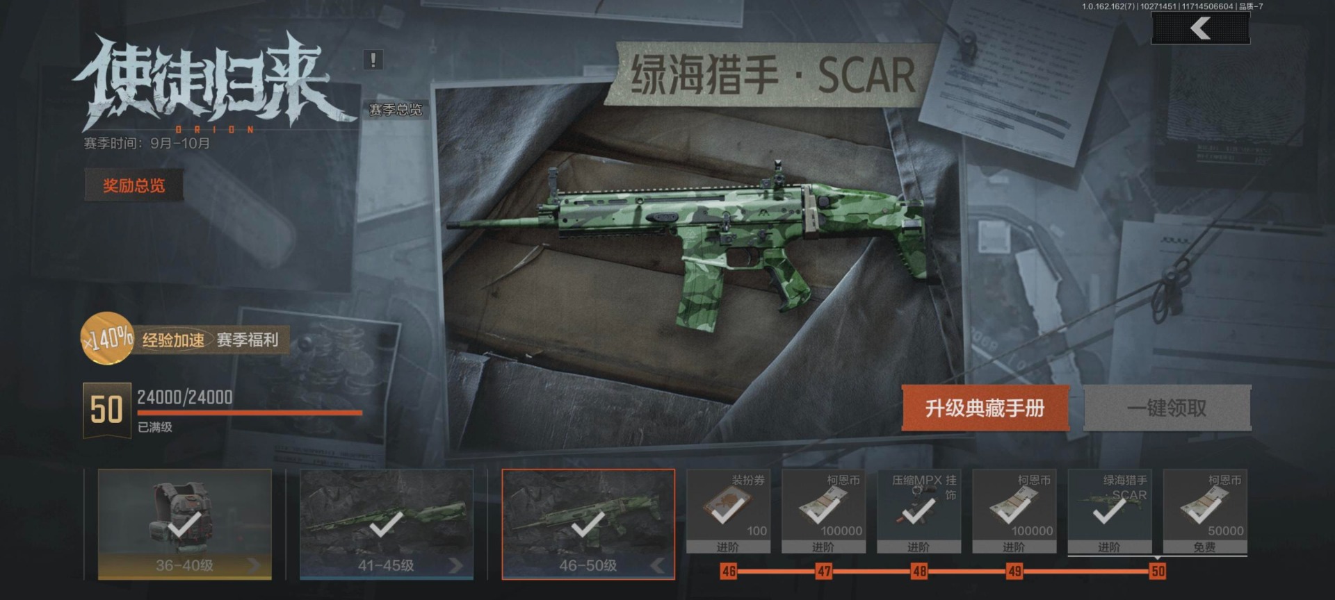 【金色枪皮】:利齿风暴·MPX,旧王圣谕·QBZ191,旧王圣谕·VSS,战术大师·AEK,包络战术·AKM,战术大师·AK102,水果·AR57