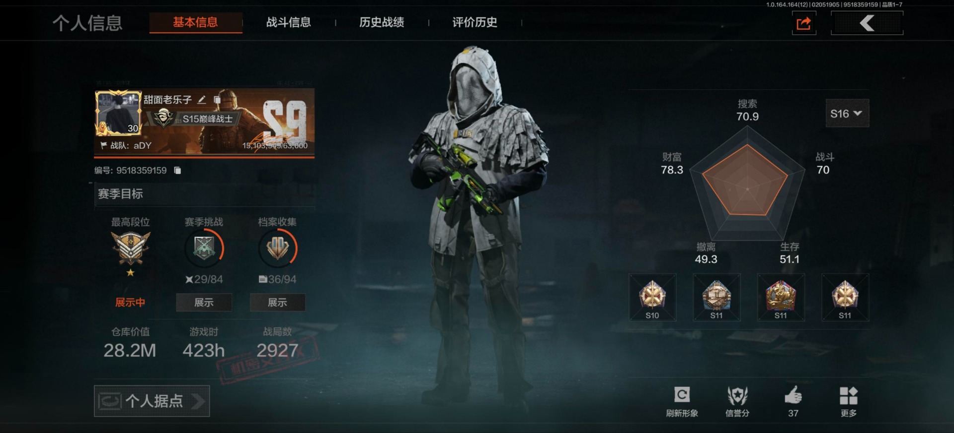 库存价值42.3 4近战武器 1金套装 1金枪皮 可修改实名 【柯恩币数量】2825k【角色装扮(金)】钢铁壁垒作战服【近战武器】热能武器·补牢,工兵铲,来战·开山刀,涂鸦利刃【金色枪皮】蓝色咆哮·H416【紫色枪皮】竞技·MDR,竞技·M110,鱼跃丹青·QBU191,鱼跃丹青·DT MDR,火力倾泻·AKM,高塔之内·VSS,骑士之剑·Groza,自喷网格·H416,涂鸦·MPX,涂鸦·AK102,竞技·M4A1,掌中盾·MP5,和平之手·FAL,动感舞步·ACE31【角色装扮(紫)】鎏金街头套装,都市夜影套装,财团之手作战套装暗区突围 - 安卓 -