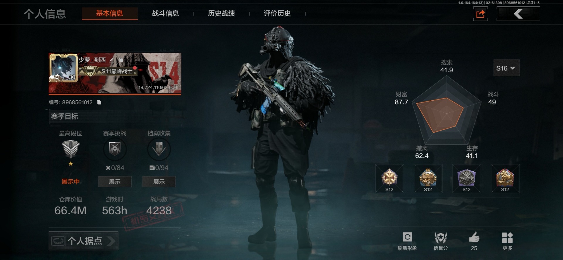 【AQQH756】段位:专家/仓库价值(百万):12/裁决手杖剑/工兵铲/来战开山刀/竞技FAL/镀火熔金H416/蓝色咆哮H416/秩序F2000/告丧夜曲AR57/旧王圣谕QBZ191/冰河碎影MK14