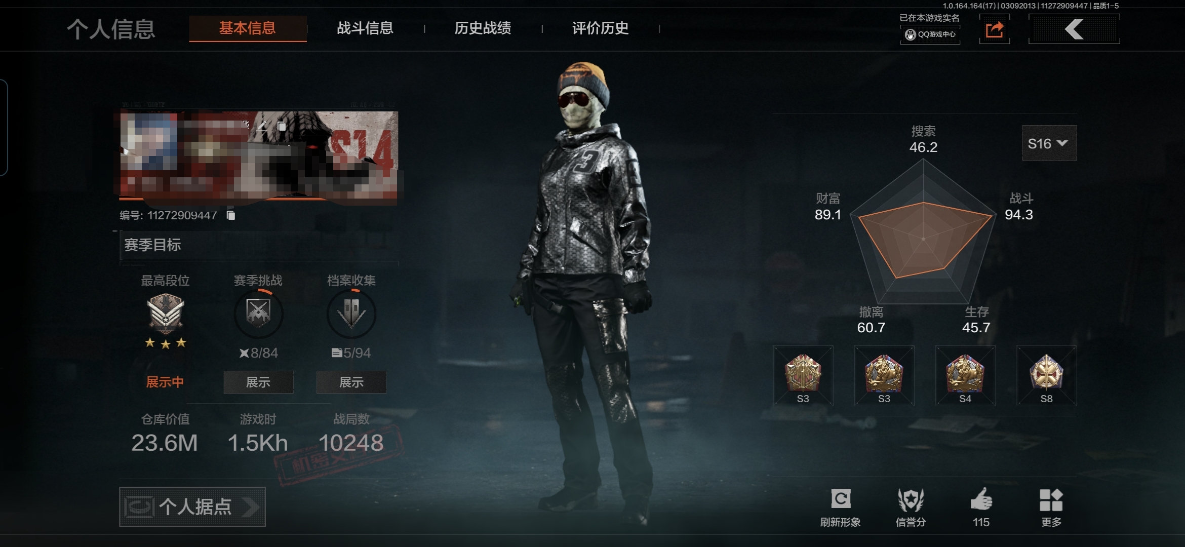 【AQZG1621】等级:30/段位:暗区传说/仓库价值(百万):94.4/柯恩币:59400000/涂鸦利刃/下弦月/冰河碎影MK14