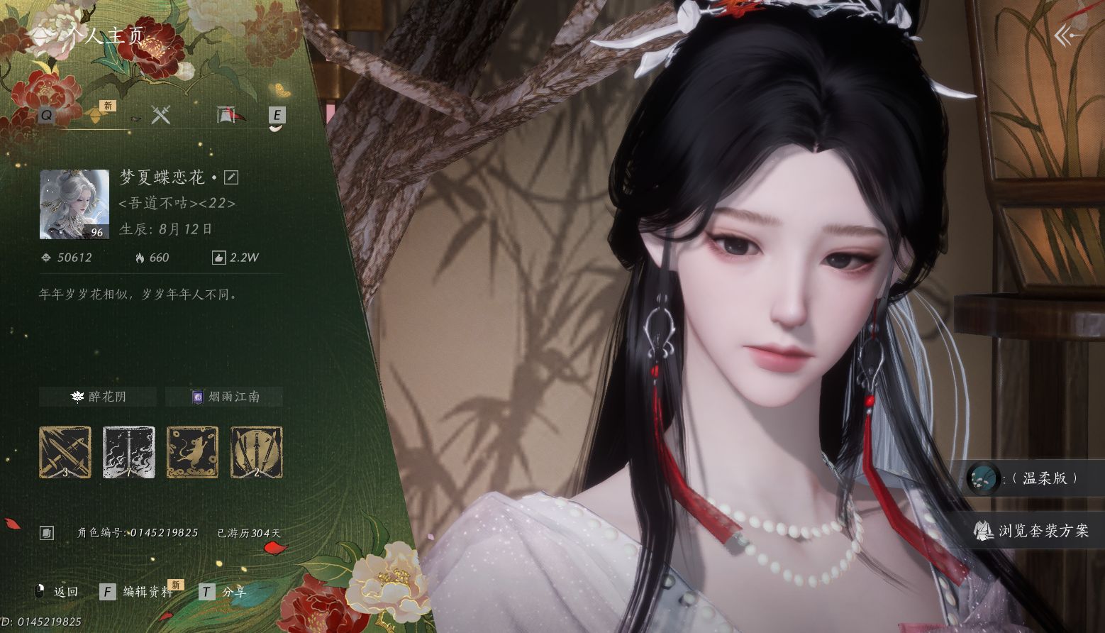 WQY611938 【7790w宝钱,氪金3.2w】 风华值74954 武林造诣(鹅)34620 已用八音窍数量12 角色性别【文本】男 【无换绑CD】 【绝境】 【无冷却】 【未绑定或可换绑】 【是】 【男】 【无】 【邮箱帐号】 【网易邮箱账号】 【ios】 稀有套装7 稀有发型5 稀有武器外观1 稀有武学奇术2 其他武器外观12 稀有套装:天上白玉京,风吟彼岸,葬花吟,问春何苦,晏平生,青丘千岁,瑞鹤仙; 稀有发型:芙蓉泣露,云深归处,锦瑟华年,玉霜翎,弄清影; 稀有武器外观:藏音·韶光四极; 稀有武学奇术:蝶引寒星,蝶舞飞花; 其他武器外观:出竹意,霜枫横,霜枫诀,月中诗,木棍,葱葱那年,大满贯,霜枫寒,霜枫眠,霜枫舞,霜枫愁,霜枫尽;