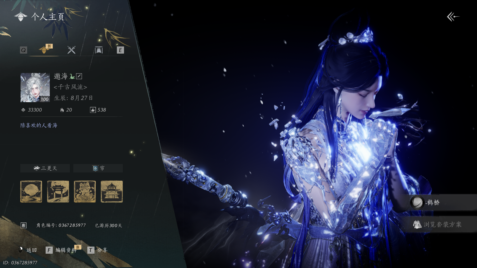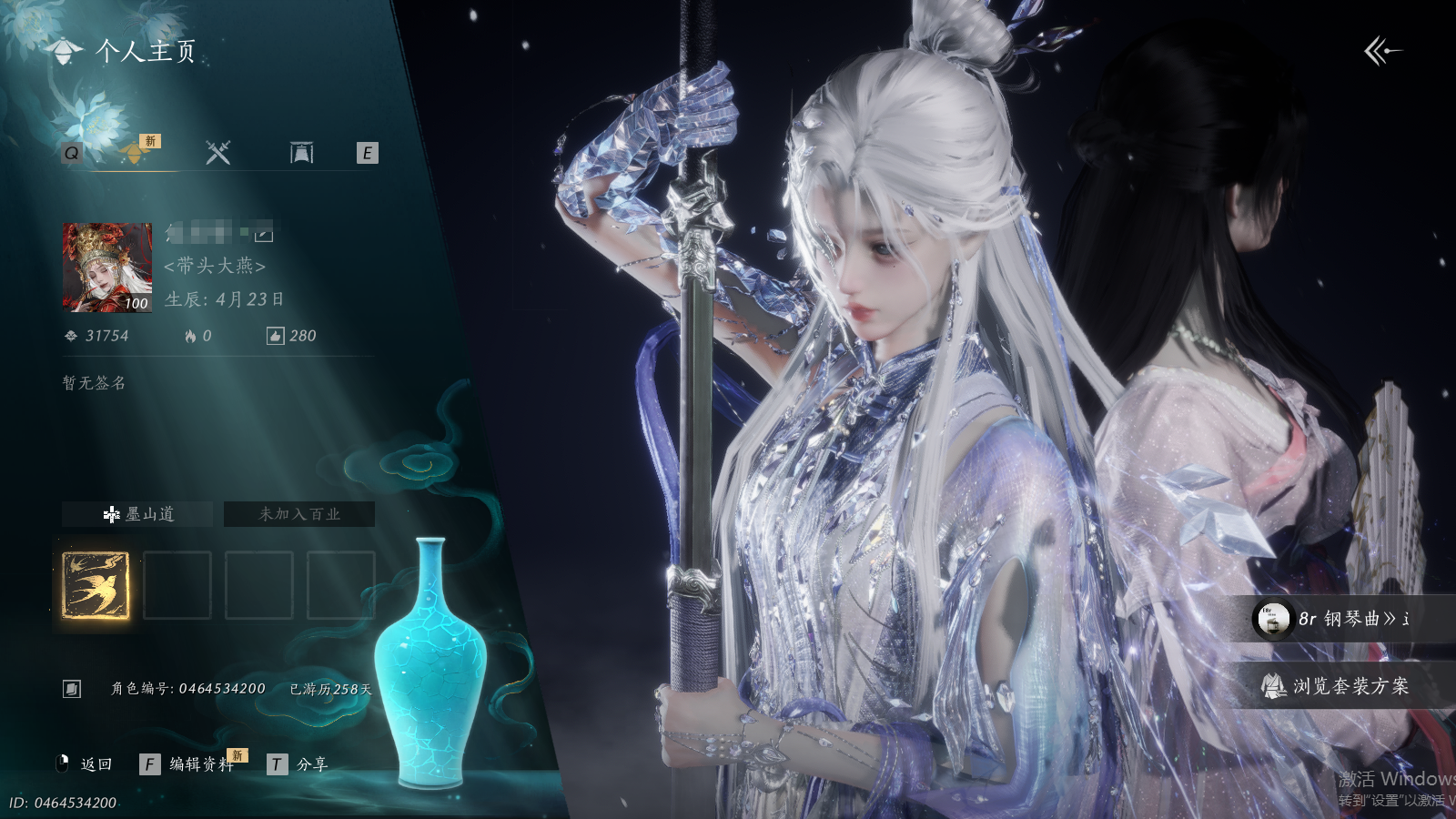 XY-076645677 弓箭和五金扇是绑定 四金伞和五金伞可封装 商城外观清空风华值124321 武林造诣(鹅)34230 已用八音窍数量17 等级100 角色性别【文本】女 【绝境】 【无换绑CD】 【未绑定或可换绑】 【未注册】 【不支持人脸包赔】 【女】 【无】 【安卓】 【是】 【是】 【是】 稀有套装4 稀有发型7 稀有武器外观4 稀有武学奇术2 稀有坐骑1 套装3 稀有套装:天上白玉京,问春何苦,晏平生,瑞鹤仙; 稀有发型:弄清影,云深归处,玉霜翎,栖彤霞,笑倚东风,瀚海千山,朔风雪; 稀有武器外观:藏音·凤凰于飞,藏音·北溟有鱼,藏音·北溟有鱼(五金),藏音·韶光四极(五金); 稀有武学奇术:青鸾望月,蝶舞飞花; 稀有坐骑:倚鹿顺风; 套装:剑影藏心,风花雾,瑞鹤仙;燕云十六声 - 官服 -