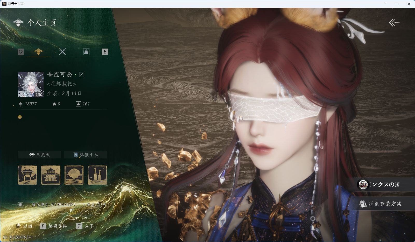 风华值61395 武林造诣(鹅)35727 已用八音窍数量6 等级100 角色性别【文本】男 【绝境】 【无换绑CD】 【未绑定或可换绑】 【不支持人脸包赔】 【男】 【无】 【是】 【是】 稀有套装7 稀有发型2 稀有武学奇术2 特殊道具1 套装14 武器外观6 坐骑3 稀有套装:天上白玉京,无间无相,将星入命,问春何苦,葬花吟,乌纱红漪,晏平生; 稀有发型:云深归处,栖彤霞; 稀有武学奇术:一斩绛天,万剑归宗; 特殊道具:阴阳易形丹; 套装:句芒,啸月,白龙,落花闻诏,纵横,幽明既通,青草原,九间当铺,剑影藏心,赤沙,金鳞阙,龙凤缠,西凉鬼啸,蜀戏春; 武器外观:木棍,葱葱那年,无锋,无鸣,出竹意,霜枫横; 坐骑:白义,盗骊,飞毛腿;燕云十六声 - 官服 -