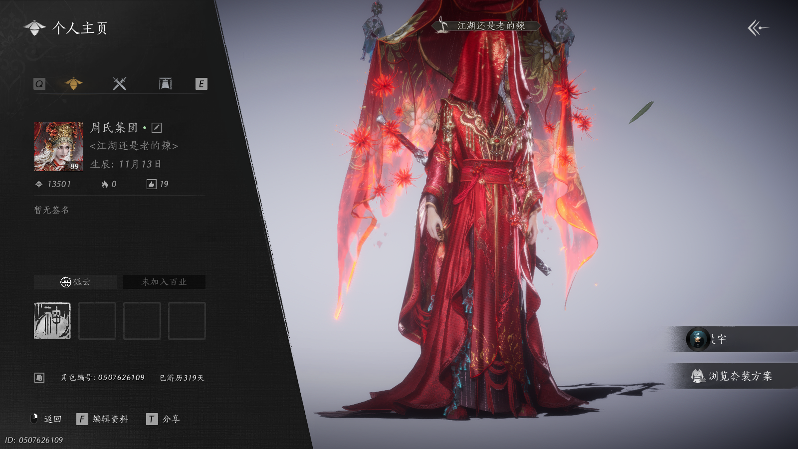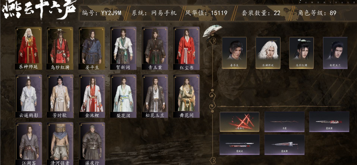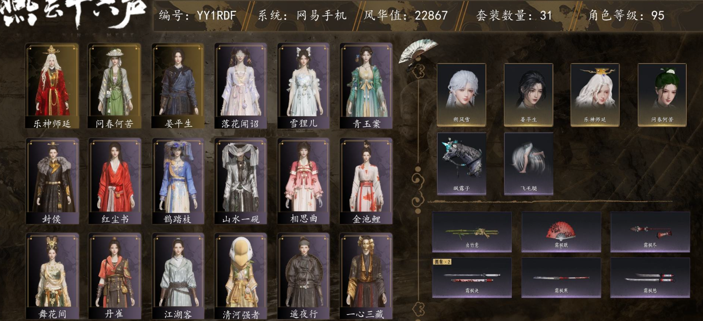 风华值36963 武林造诣(鹅)34980 已用八音窍数量3 未用八音窍数量0 等级100 角色性别【文本】女 【绝境】 【无换绑CD】 【未绑定或可换绑】 【未注册】 【不支持人脸包赔】 【女】 【无】 【是】 【是】 稀有套装4 稀有发型1 套装40 武器外观8 坐骑3 其他武器外观4 稀有套装:问春何苦,晏平生,青丘千岁,瑞鹤仙; 稀有发型:鹊桥仙; 套装:云中锦书,青玉案,山水一砚,剑影藏心,鹊踏枝,清音晓,贺新词,雁还乡,红尘书,花问春言,芳时歇,午风清,南风熏,一心三藏,逐红花,遥夜行,江湖客,上青云,花月天真,舞花间,松花玉兰,墨沉丹朱,白龙,青阳,赤沙,丹雀,射虎南山,金池鲤,瑞鹤仙,翠羽顾,雪狸儿,梨花泪,清河强者,西凉鬼啸,鹊衔夜,蜀戏春,龙凤缠,九间当铺,驰走西风,百花应诏; 武器外观:霜枫愁,木棍,葱葱那年,月中诗,霜枫诀,霜枫眠,霜枫尽,霜枫横; 坐骑:飞毛腿,白义,飒露子; 其他武器外观:霜枫愁,木棍,葱葱那年,月中诗;燕云十六声 - 官服 -