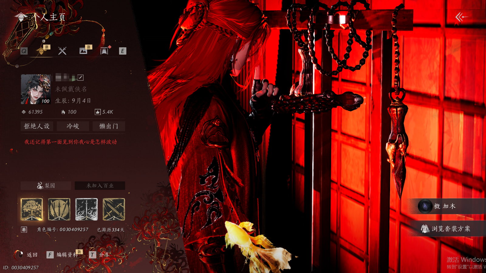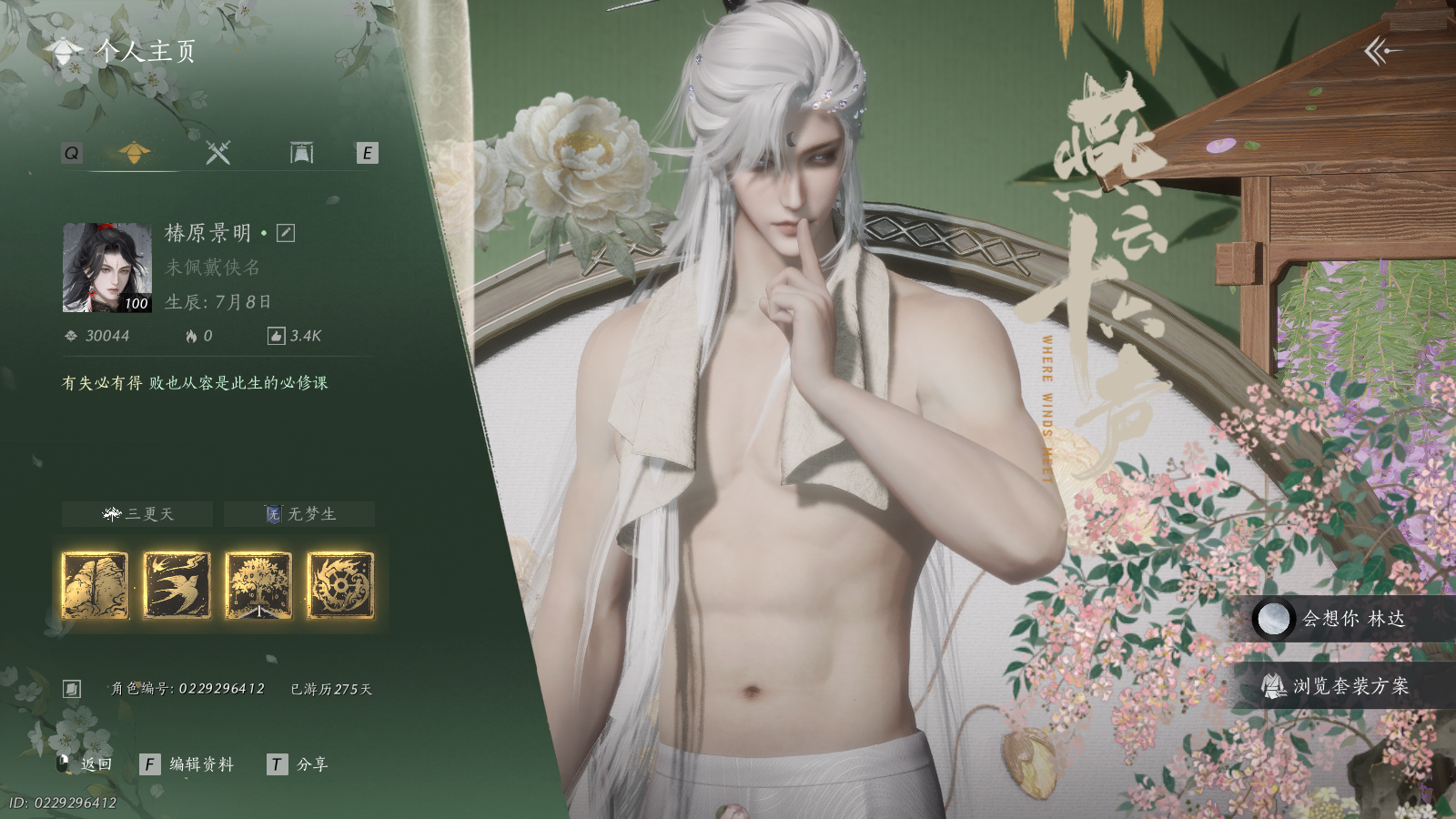 风华值61395 武林造诣(鹅)35727 已用八音窍数量6 等级100 角色性别【文本】男 【绝境】 【无换绑CD】 【未绑定或可换绑】 【不支持人脸包赔】 【男】 【无】 【是】 【是】 稀有套装7 稀有发型2 稀有武学奇术2 特殊道具1 套装14 武器外观6 坐骑3 稀有套装:天上白玉京,无间无相,将星入命,问春何苦,葬花吟,乌纱红漪,晏平生; 稀有发型:云深归处,栖彤霞; 稀有武学奇术:一斩绛天,万剑归宗; 特殊道具:阴阳易形丹; 套装:句芒,啸月,白龙,落花闻诏,纵横,幽明既通,青草原,九间当铺,剑影藏心,赤沙,金鳞阙,龙凤缠,西凉鬼啸,蜀戏春; 武器外观:木棍,葱葱那年,无锋,无鸣,出竹意,霜枫横; 坐骑:白义,盗骊,飞毛腿;