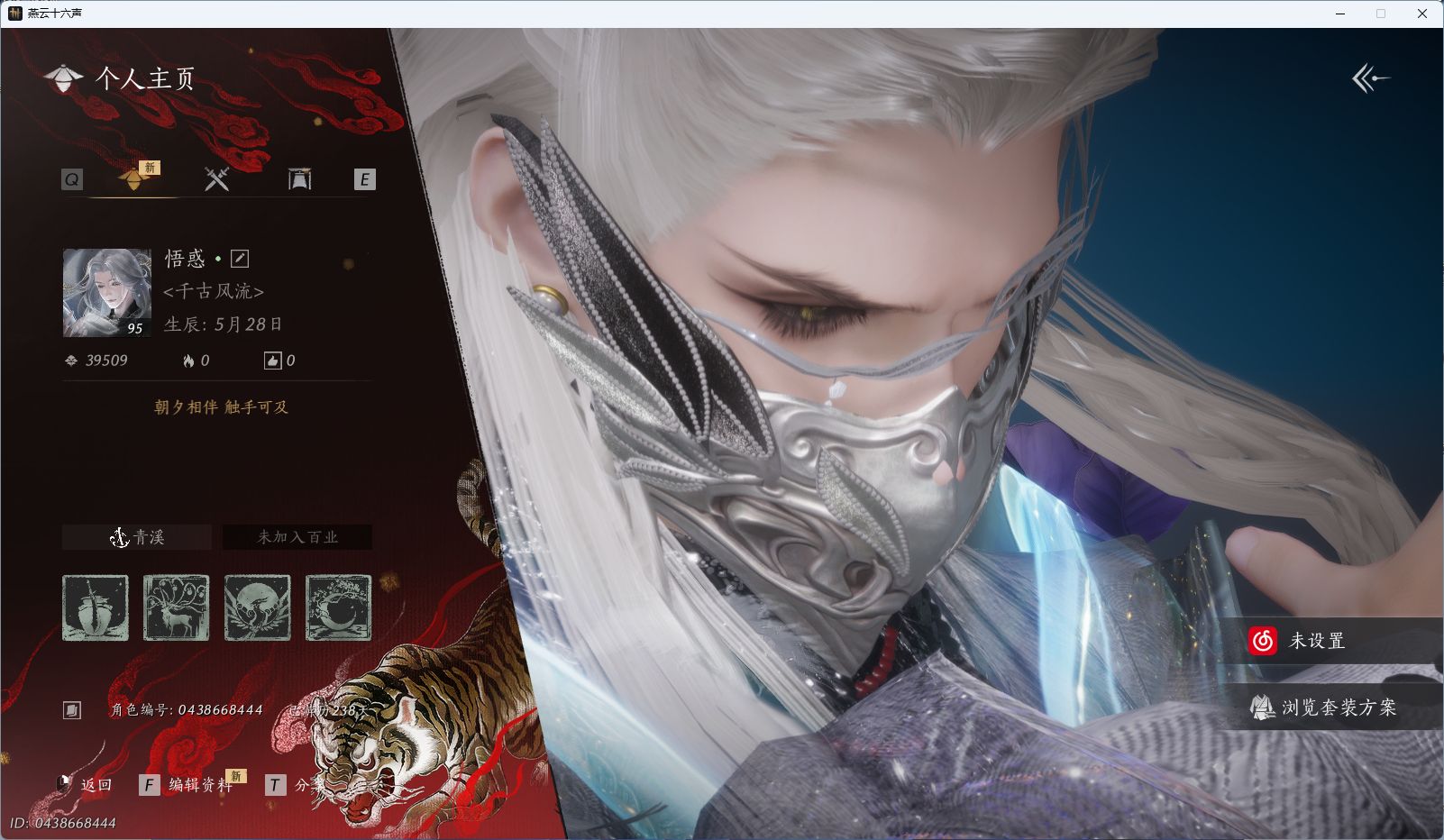 WQY-043643543 【金阙翼回配饰,风吟彼岸,瑞鹤仙,云深归处,栖彤霞,蝶梦水云武学】 风华值46160 武林造诣(鹅)32590 已用八音窍数量5 未用八音窍数量0 等级100 角色等级100 角色性别【文本】男 【无换绑CD】 【绝境】 【无冷却】 【未绑定或可换绑】 【密保手机】 【未注册】 【不支持人脸包赔】 【是】 【男】 【无】 【手机帐号】 【网易手机账号】 【ios】 【是】 【是】 【未拥有】 【已知晓】 【自己上传】 【否】燕云十六声 - 官服 -
