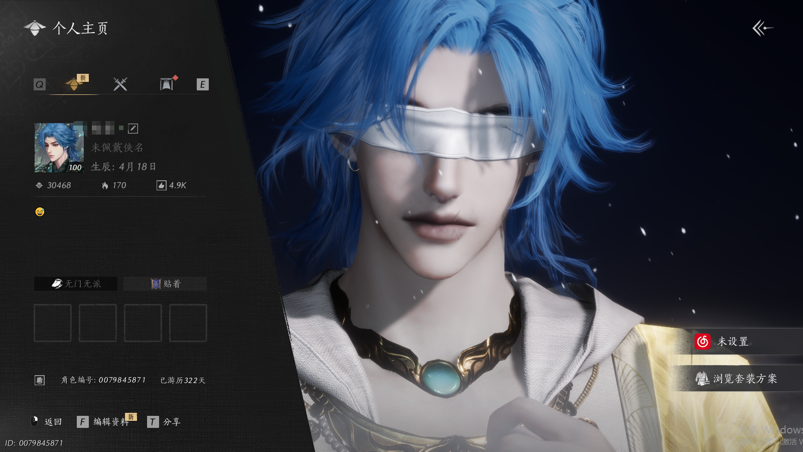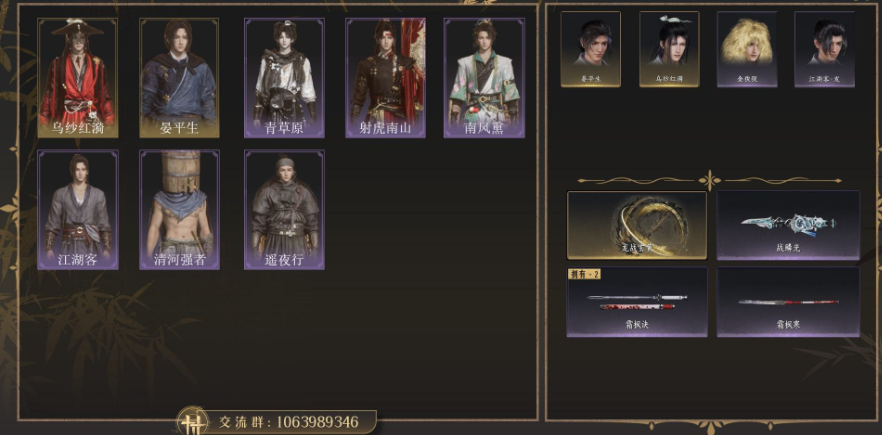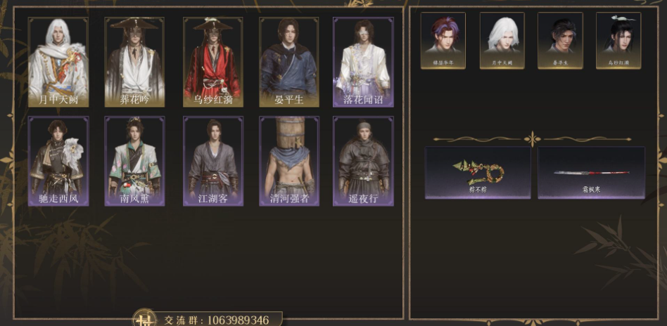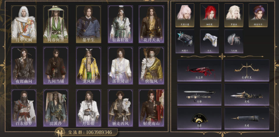 风华值30468 武林造诣(鹅)33822 已用八音窍数量2 等级100 角色性别【文本】男 【绝境】 【无换绑CD】 【未绑定或可换绑】 【不支持人脸包赔】 【男】 【无】 【是】 【是】 稀有套装2 稀有发型1 稀有武器外观1 套装8 武器外观1 坐骑4 其他武器外观1 稀有套装:乌纱红漪,晏平生; 稀有发型:天志明鬼; 稀有武器外观:藏音·北溟有鱼; 套装:啸月,阮郎归,蝎心蛟影,落花闻诏,青草原,龙凤缠,蜀戏春,云中锦书; 武器外观:霜枫舞; 坐骑:飒露子,飞毛腿,盗骊,白义; 其他武器外观:霜枫愁;