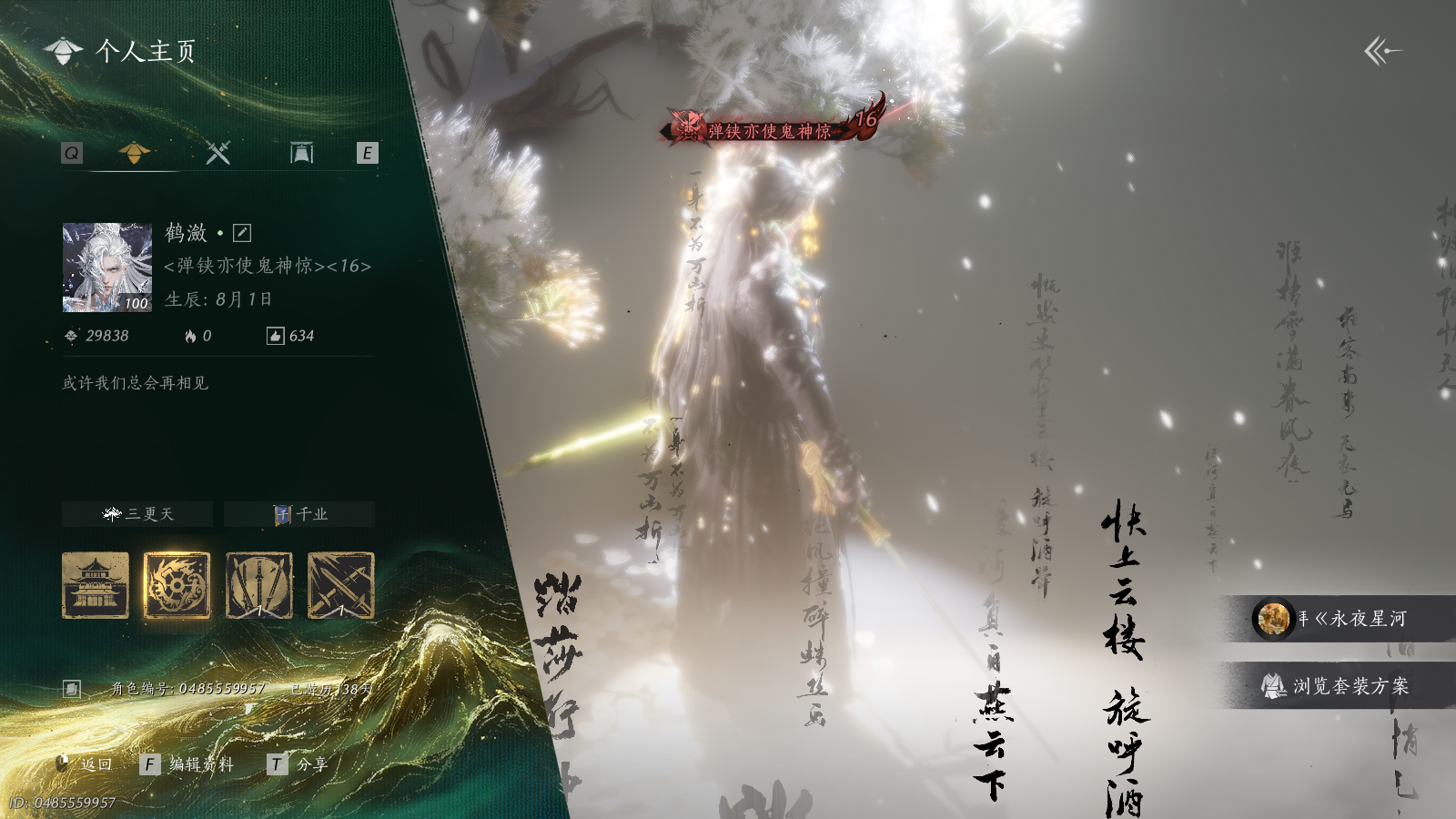 【ll如碎霜天,醉蓬莱,云深归处,5套258时装,心法6666】 风华值30473 武林造诣(鹅)35835 已用八音窍数量3 未用八音窍数量0 等级100 角色性别【文本】男 【绝境】 【无换绑CD】 【未绑定或可换绑】 【未注册】 【不支持人脸包赔】 【男】 【无】 【ios】 【是】 【是】 【否】 稀有套装3 套装27 稀有套装:葬花吟,晏平生,如碎霜天; 套装:葬花吟,云中锦书,山君啸林,南风熏,剑影藏心,风入画,逐红花,遥夜行,江湖客,雨停荷,醉蓬莱,舞花间,松花玉兰,青阳,白龙,纵横,射虎南山,金池鲤,鲤传尺素,翠羽顾,雪狸儿,梨花泪,清河强者,蜀戏春,夜郎幽问,龙凤缠,驰走西风;