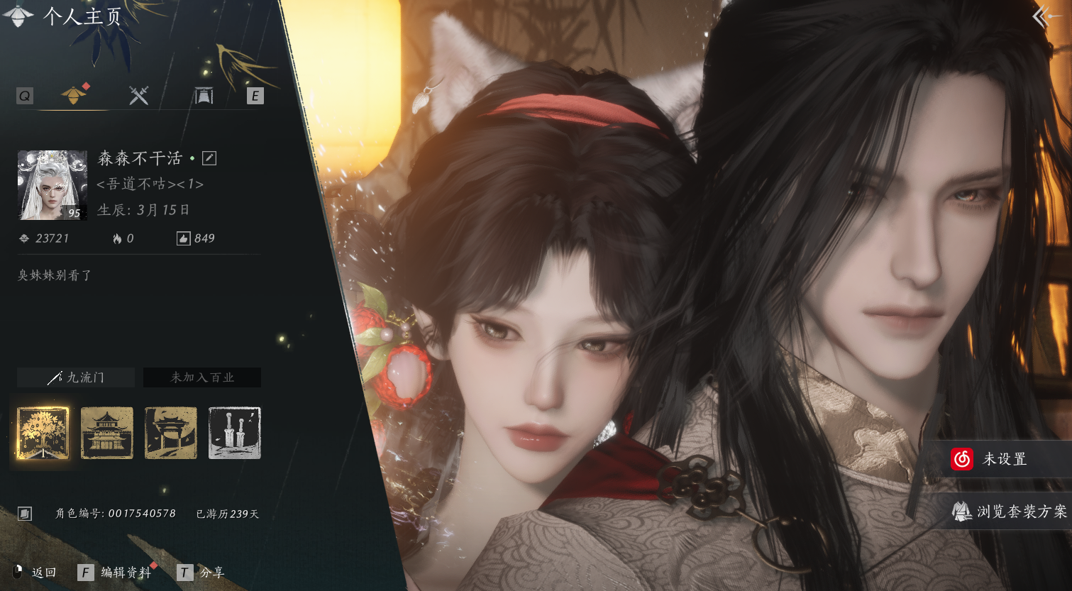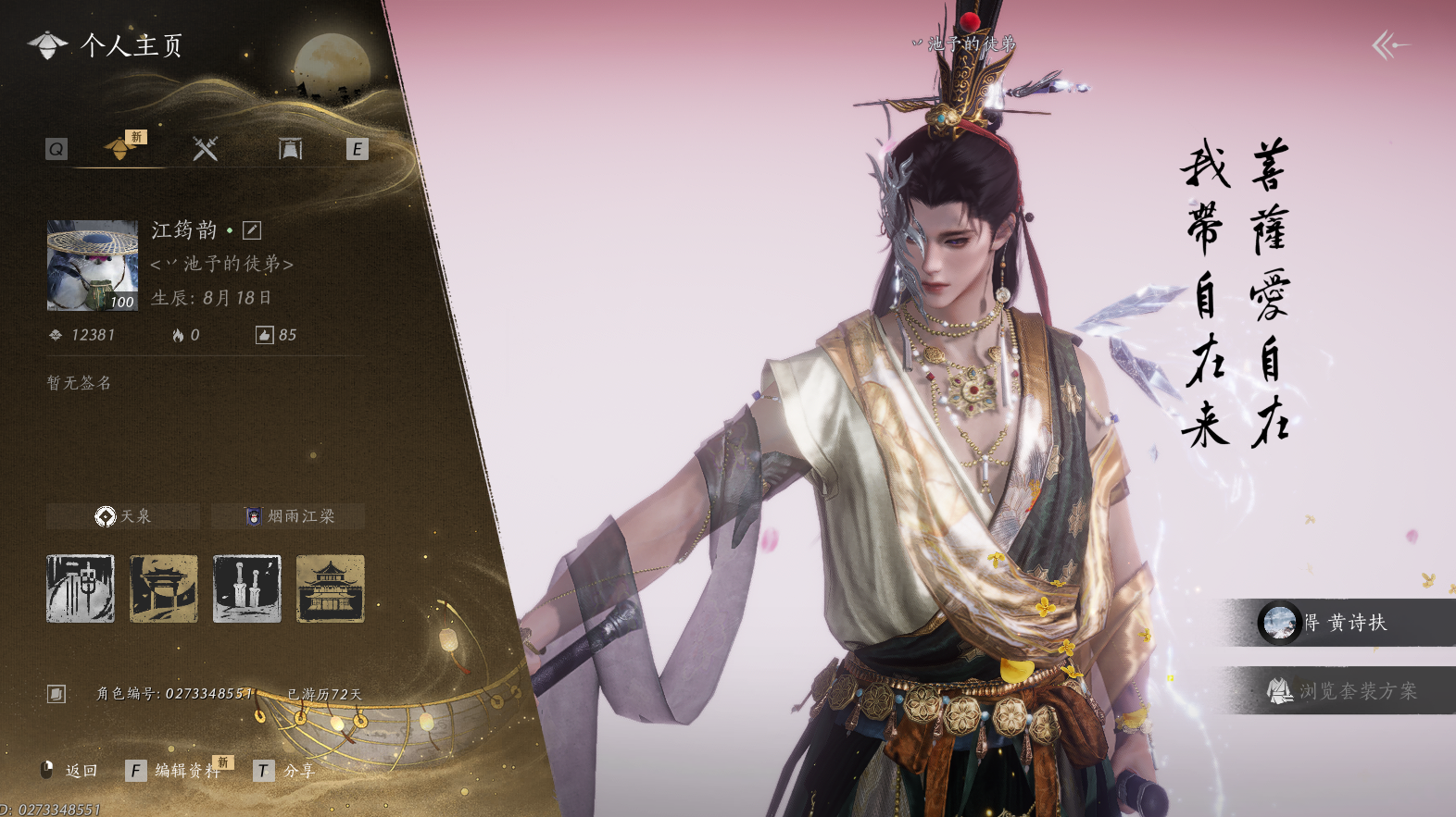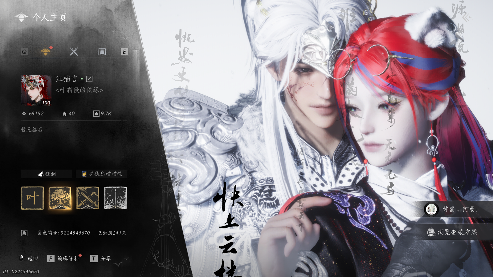 XY-076653948 风华值80835 武林造诣(鹅)36060 已用八音窍数量13 等级100 角色性别【文本】女 【绝境】 【无换绑CD】 【未绑定或可换绑】 【未注册】 【不支持人脸包赔】 【女】 【防沉迷】 【安卓】 【是】 【是】 【否】 稀有套装4 稀有发型3 稀有武器外观2 稀有武学奇术3 套装6 稀有套装:葬花吟,月中天阙,风吟彼岸,青丘千岁; 稀有发型:芙蓉泣露,栖彤霞,瀚海千山; 稀有武器外观:藏音·韶光四极(五金),藏音·北溟有鱼(五金); 稀有武学奇术:青鸾望月,龙战千山,天龙舞火; 套装:剑影藏心,金池鲤,阮郎归,夜郎幽问,蜀戏春,九间当铺;燕云十六声 - 官服 -