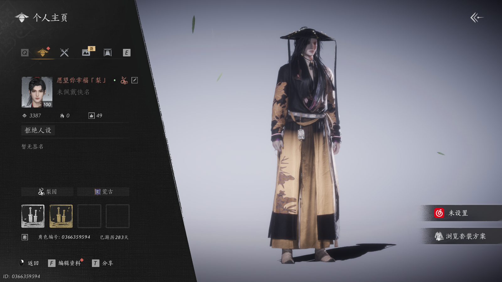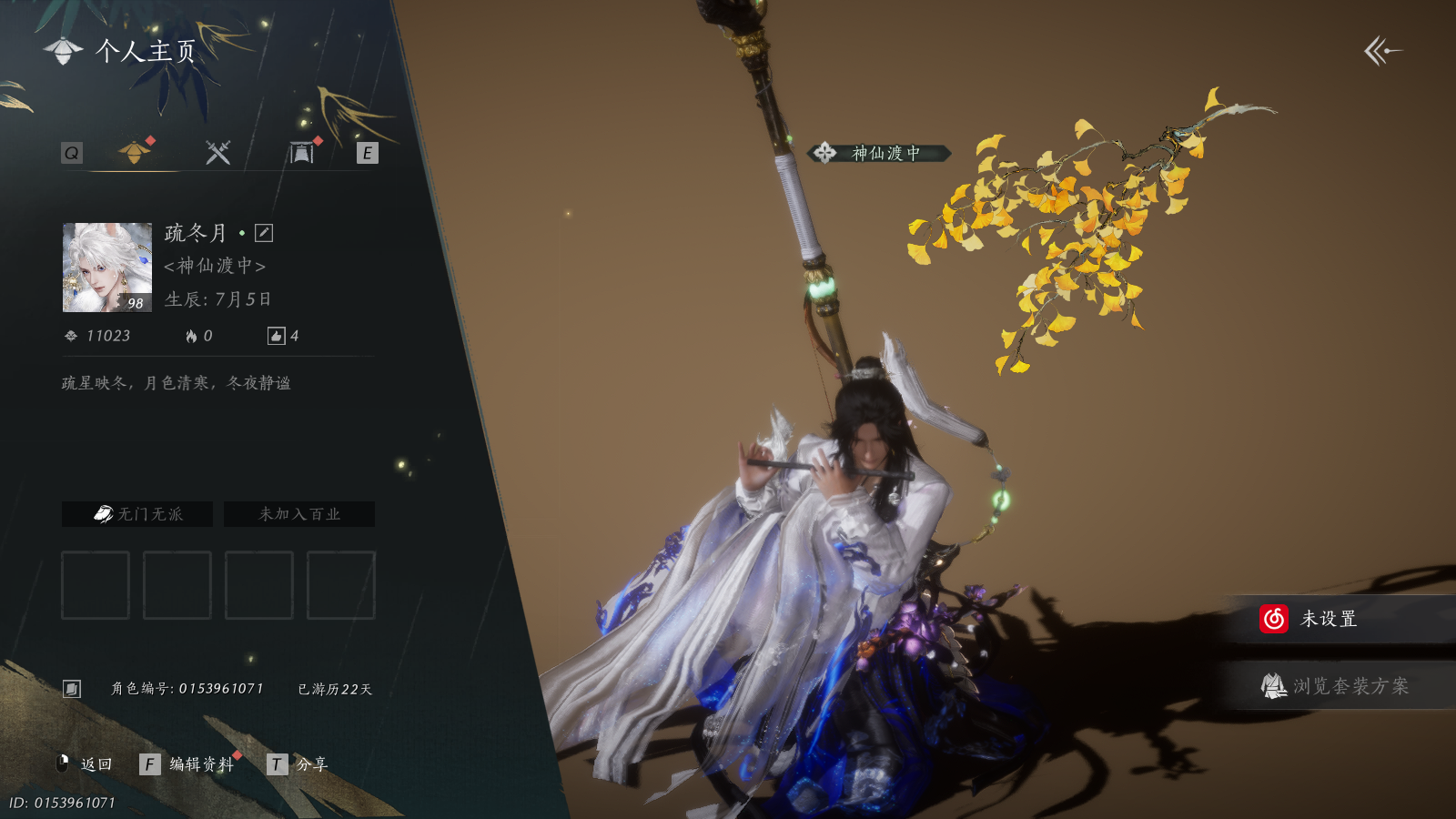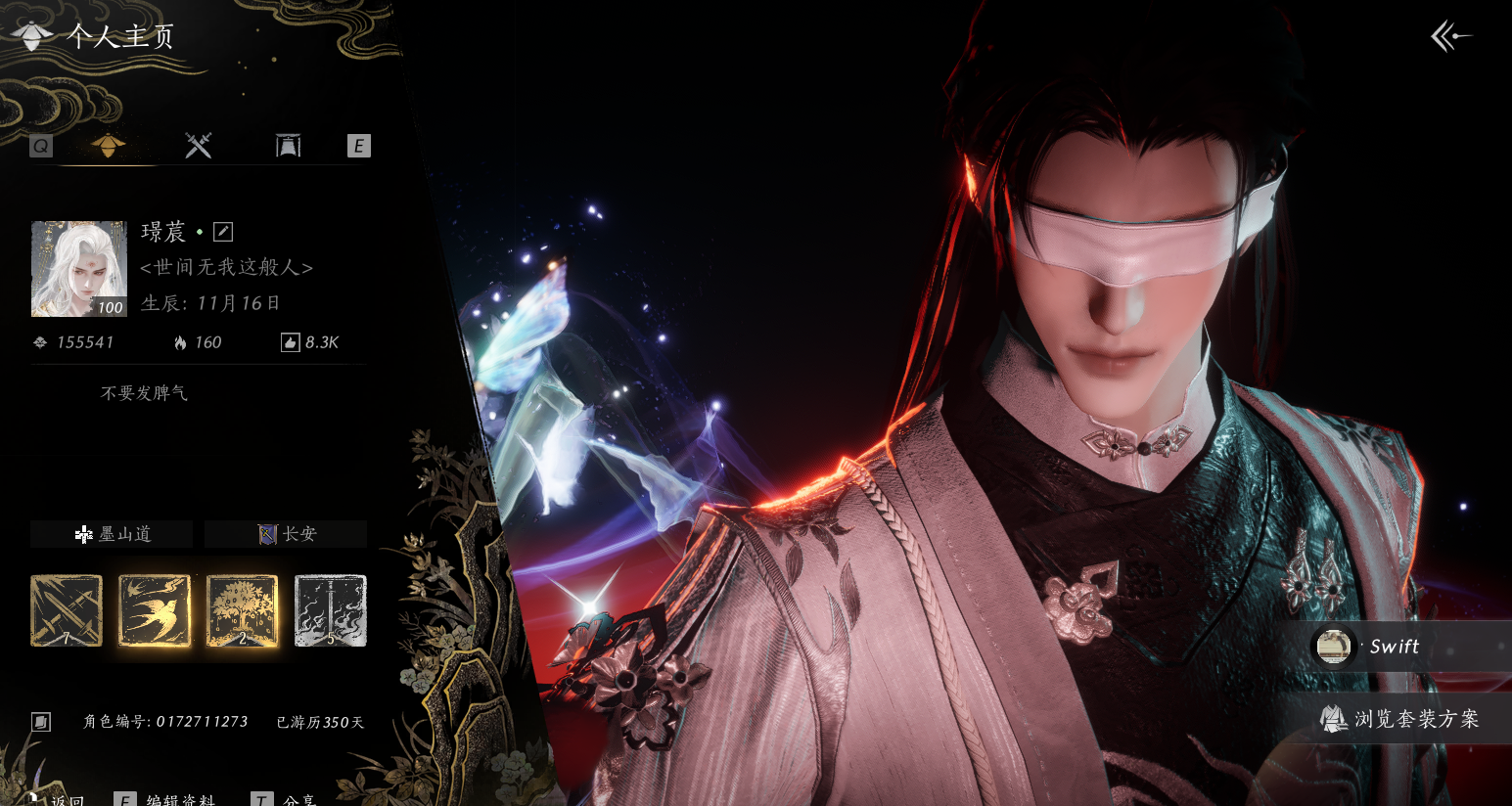 【有狐绥绥小号】 风华值11023 武林造诣(鹅)19610 已用八音窍数量2 未用八音窍数量0 等级100 角色性别【文本】男 【绝境】 【无换绑CD】 【未绑定或可换绑】 【未注册】 【不支持人脸包赔】 【男】 【无】 【是】 【是】 稀有套装3 套装7 武器外观1 坐骑1 稀有套装:晏平生,葬花吟,有狐绥绥; 套装:山君啸林,红尘书,遥夜行,江湖客,舞花间,清河强者,金池鲤; 武器外观:霜枫横; 坐骑:琼林客;