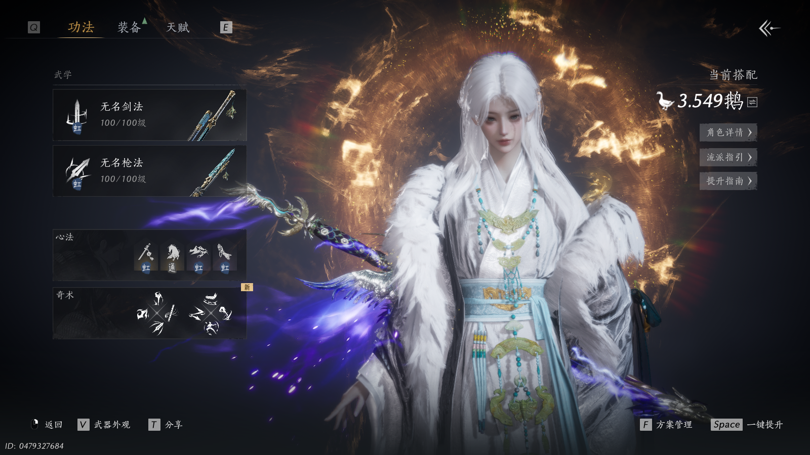 XY-076664691 【五金惊霆剑(可封装)+五金荧惑枪(不可封装)】 风华值46294 武林造诣(鹅)35490 已用八音窍数量6 等级100 角色性别【文本】女 【绝境】 【无换绑CD】 【未绑定或可换绑】 【未注册】 【不支持人脸包赔】 【女】 【无】 【安卓】 【是】 【是】 【否】 稀有套装2 稀有武器外观2 稀有武学奇术2 套装1 稀有套装:无间无相,沧海龙吟; 稀有武器外观:藏音·昆山玉碎(五荧惑),藏音·千古断云(五惊霆); 稀有武学奇术:万剑归宗,龙腾九霄; 套装:剑影藏心;燕云十六声 - 官服 -