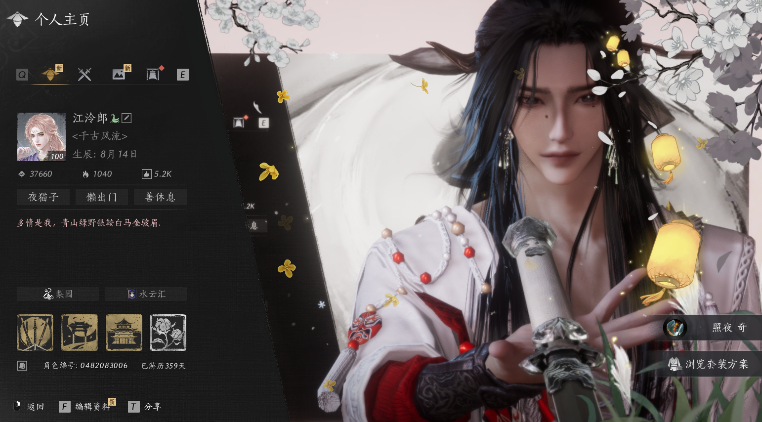 XY-076653948 风华值80835 武林造诣(鹅)36060 已用八音窍数量13 等级100 角色性别【文本】女 【绝境】 【无换绑CD】 【未绑定或可换绑】 【未注册】 【不支持人脸包赔】 【女】 【防沉迷】 【安卓】 【是】 【是】 【否】 稀有套装4 稀有发型3 稀有武器外观2 稀有武学奇术3 套装6 稀有套装:葬花吟,月中天阙,风吟彼岸,青丘千岁; 稀有发型:芙蓉泣露,栖彤霞,瀚海千山; 稀有武器外观:藏音·韶光四极(五金),藏音·北溟有鱼(五金); 稀有武学奇术:青鸾望月,龙战千山,天龙舞火; 套装:剑影藏心,金池鲤,阮郎归,夜郎幽问,蜀戏春,九间当铺;