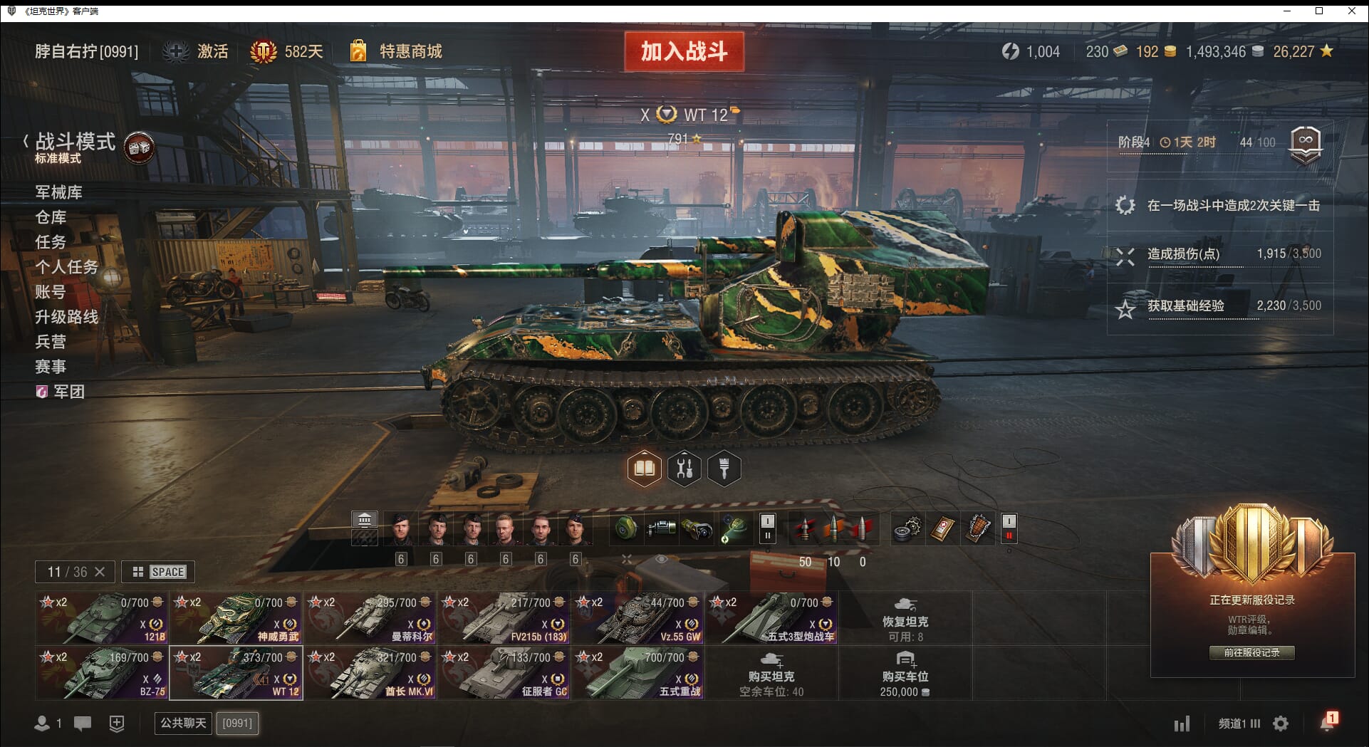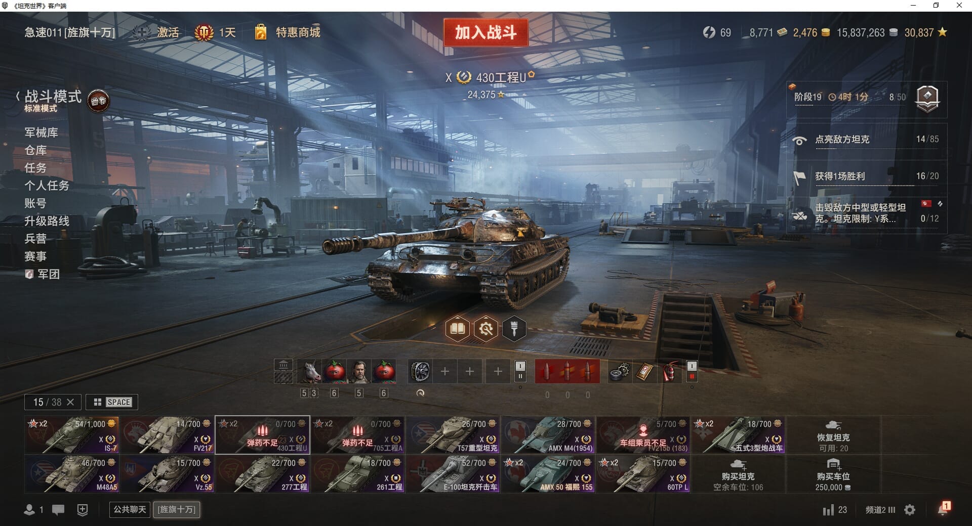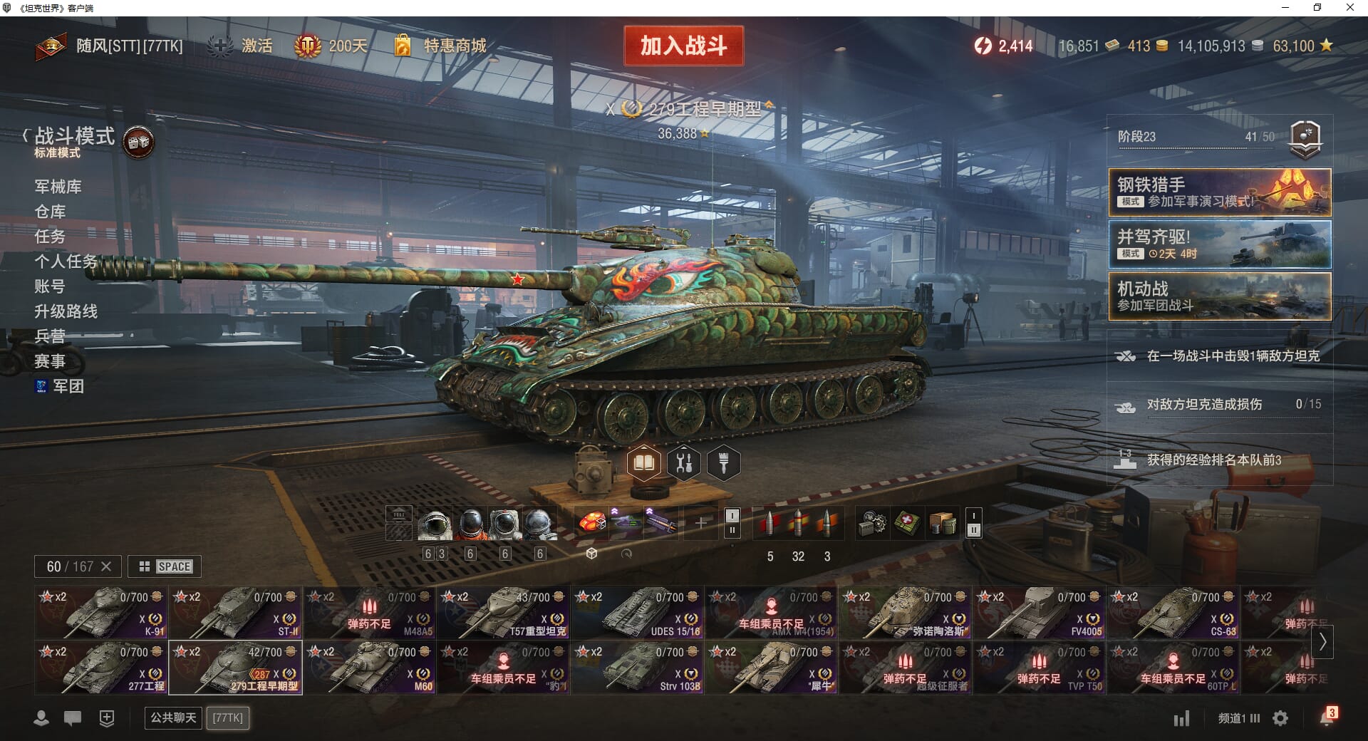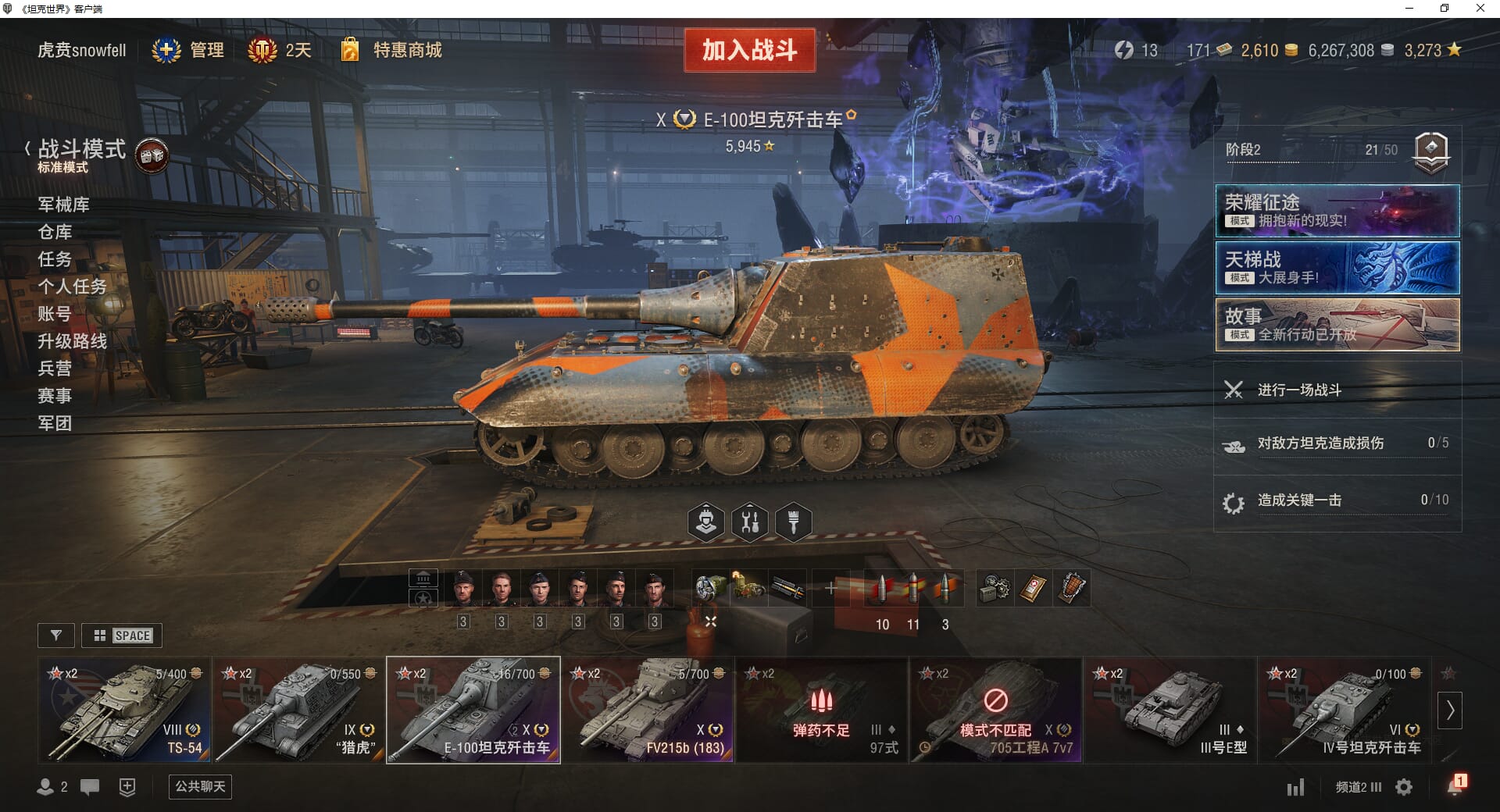 TE905/全部坦克38/10级坦克15/9级坦克3/8级坦克8/10级/IS-7/M48A5/FV217/Vz.55/430工程U/277工程/705工程A/261工程/T57重型坦克/E-100坦克歼击车/AMXM4{1954}/AMXM4福熙155/FV215b183/60TPL/五式3型炮战车/债券8771/金币2476/银币1580万/全局30837/乘员178/