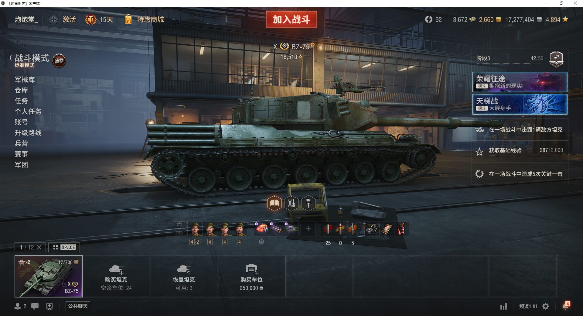 TD1286/无绑定-绝对安全/全部坦克8/金币坦克1/10级1/BZ-75/乘员55/债券3672/金币2660/银币1727w/全局4894坦克世界 - 360国服 -