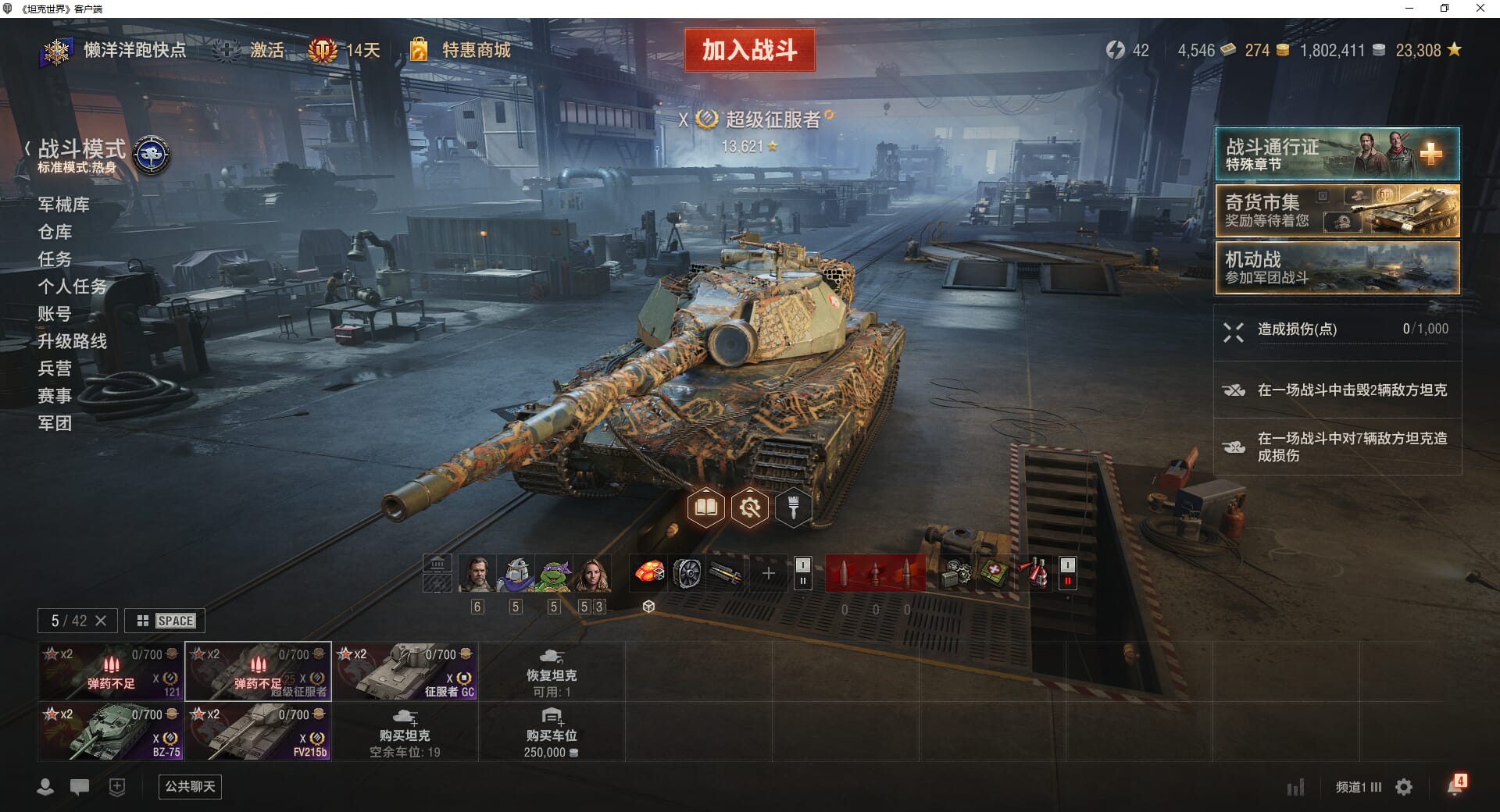 TE897/全部坦克42/十级坦克5/金币坦克13/8级坦克9/暴风/查狄伦12t/9级坦克4/AE一期/10级/121/BZ-75/超级征服者/FV215b/征服者GC/债券4546/金币274/银币180万/全局223308/乘员159/