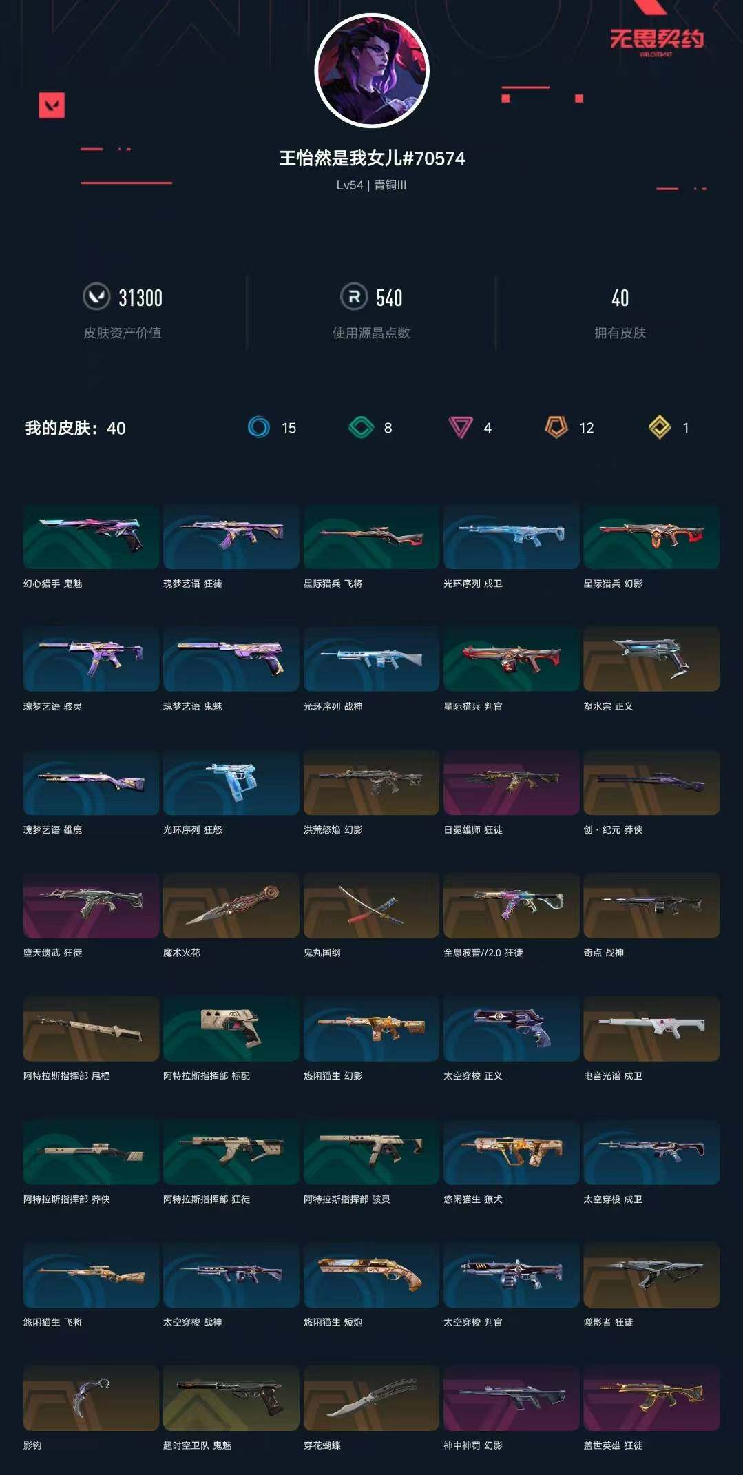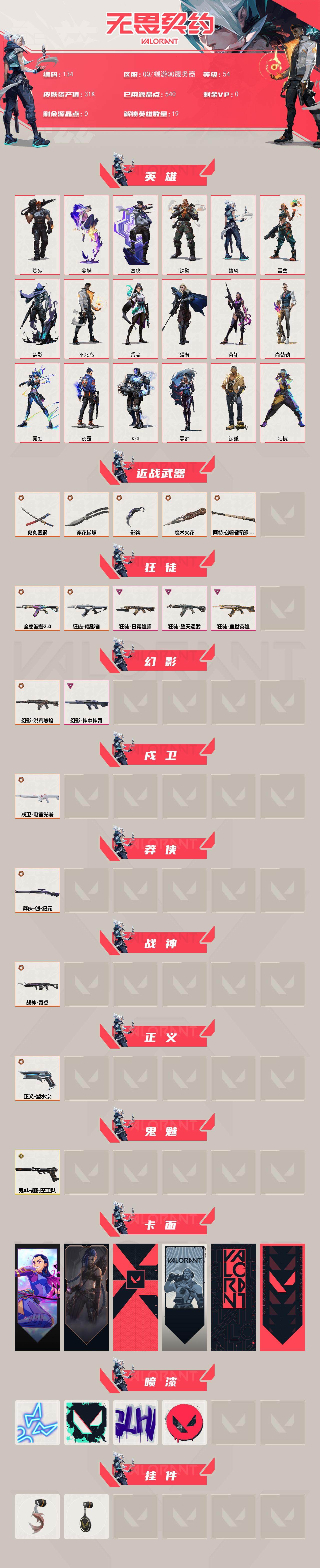 【WWC577】卓越*2/皮肤*4/等级*31/段位:白银/炼狱/维斯/暮蝶/捷风/幽影/不死鸟/贤者/猎枭/零/芮娜/狂徒-日冕雄师/骇灵-无限竞技/正义-离子武器/钢弓与箭弦 卡面/钢锁工牌 卡面/无畏契约GO!第一卷:零 卡面/钢锁vs盖可 卡面/代号红色 卡面/新兵报到 卡面/V契约 卡面/无畏契约 卡面/买装还是存钱 喷漆/胜利属于无畏契约 喷漆/GLHF 喷漆/无畏契约 喷漆/无畏契约GO!第一卷 零 挂饰/天外飞客 挂饰/无畏契约 纪念币 挂饰