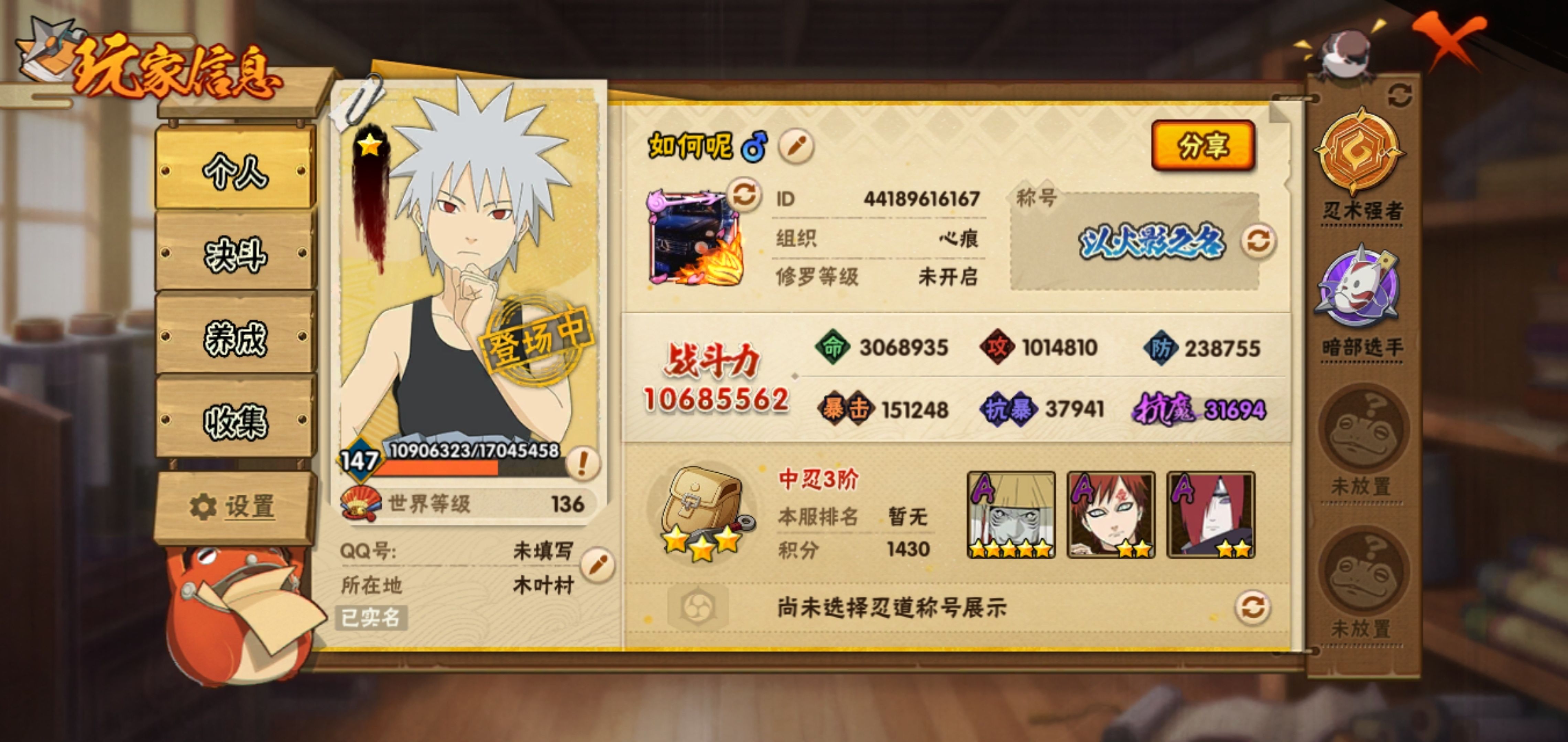 苹果Q309区:可二次实名 VIP13,战力:13070313,S忍者数量:39,A忍者数量:58,本服排名:187,战区排名:未上榜,通灵兽数量:22,时装数:18,段位:暗部1阶,忍者星数:68711s❤20A佩恩 「天道」;大蛇丸;千手扉间;纲手;自来也;千手柱间;长门 「秽土转生」;艾 「四