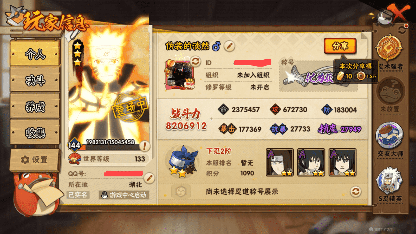 苹果Q309区:可二次实名 VIP13,战力:13070313,S忍者数量:39,A忍者数量:58,本服排名:187,战区排名:未上榜,通灵兽数量:22,时装数:18,段位:暗部1阶,忍者星数:68711s❤20A佩恩 「天道」;大蛇丸;千手扉间;纲手;自来也;千手柱间;长门 「秽土转生」;艾 「四