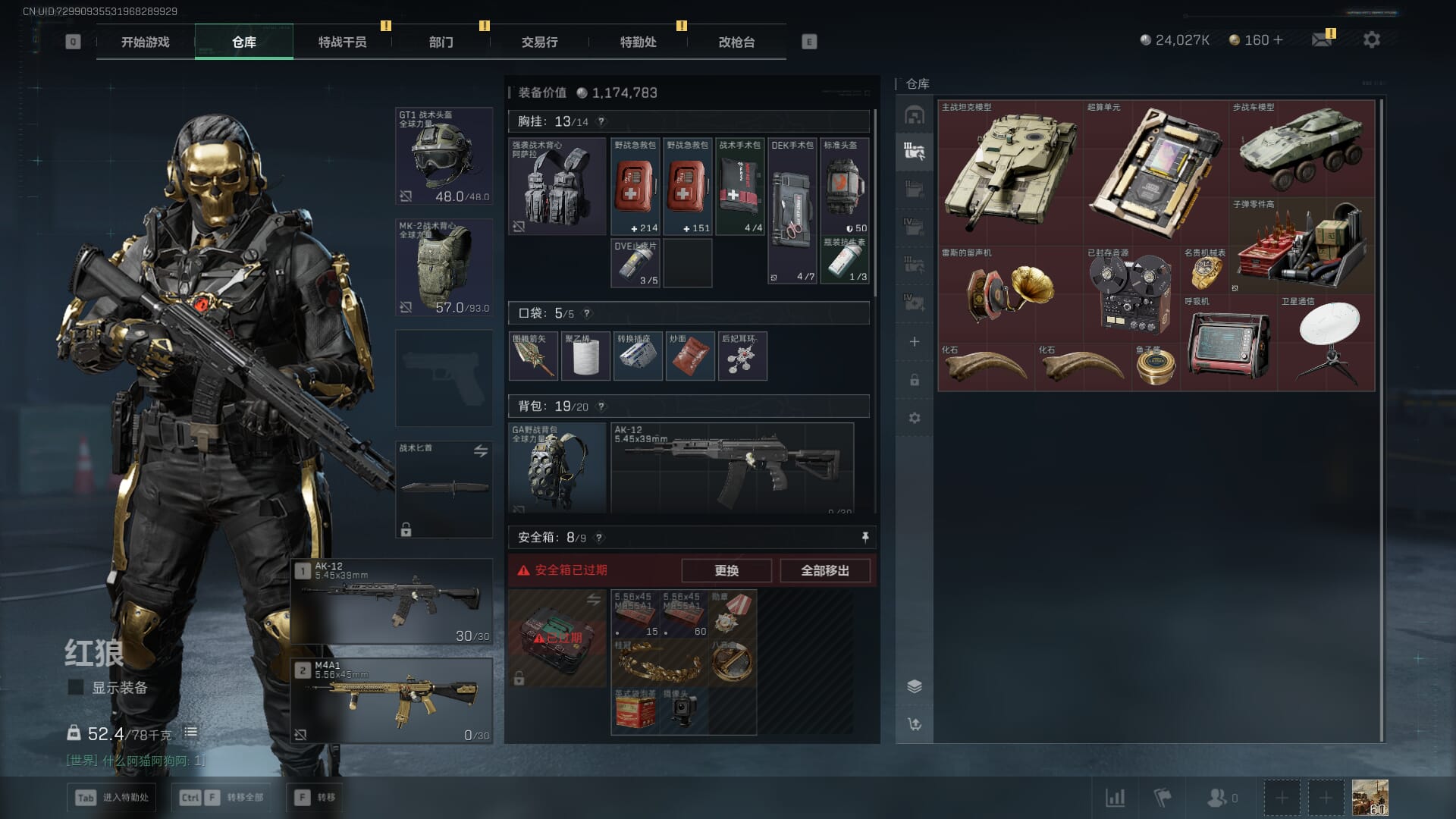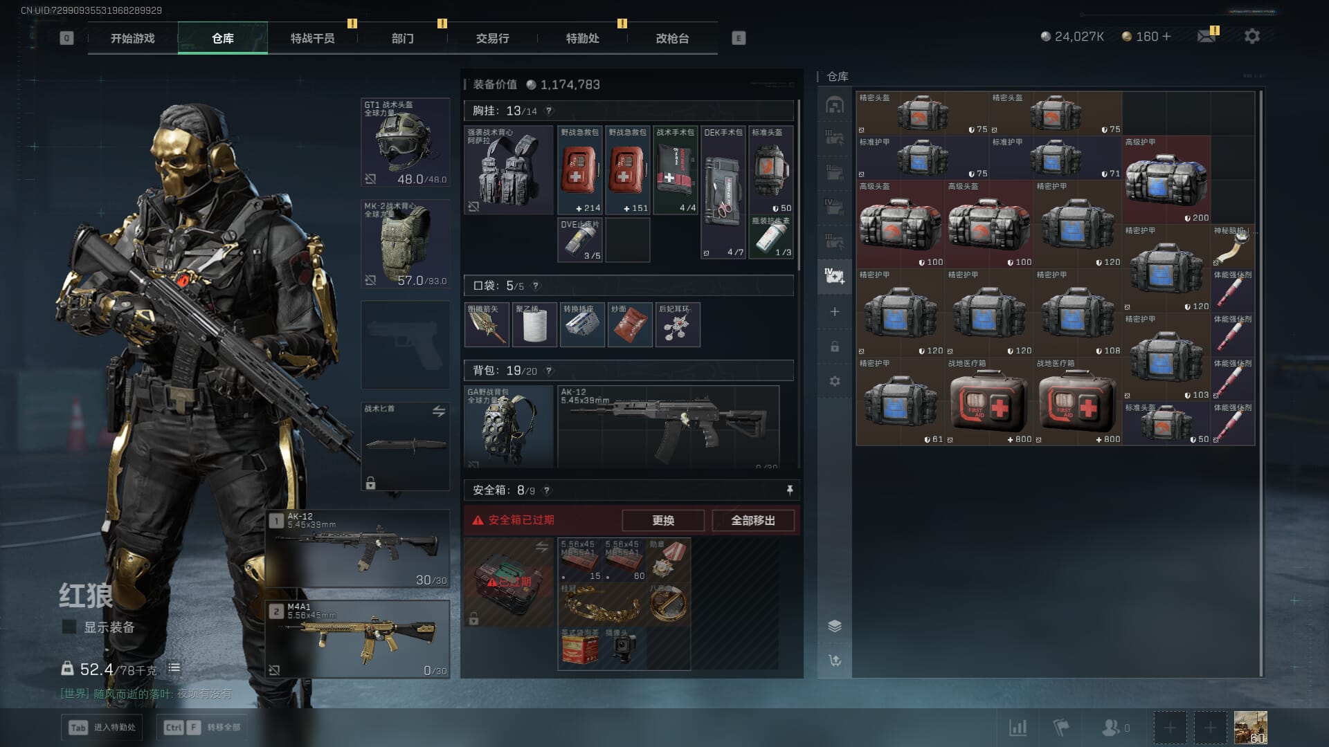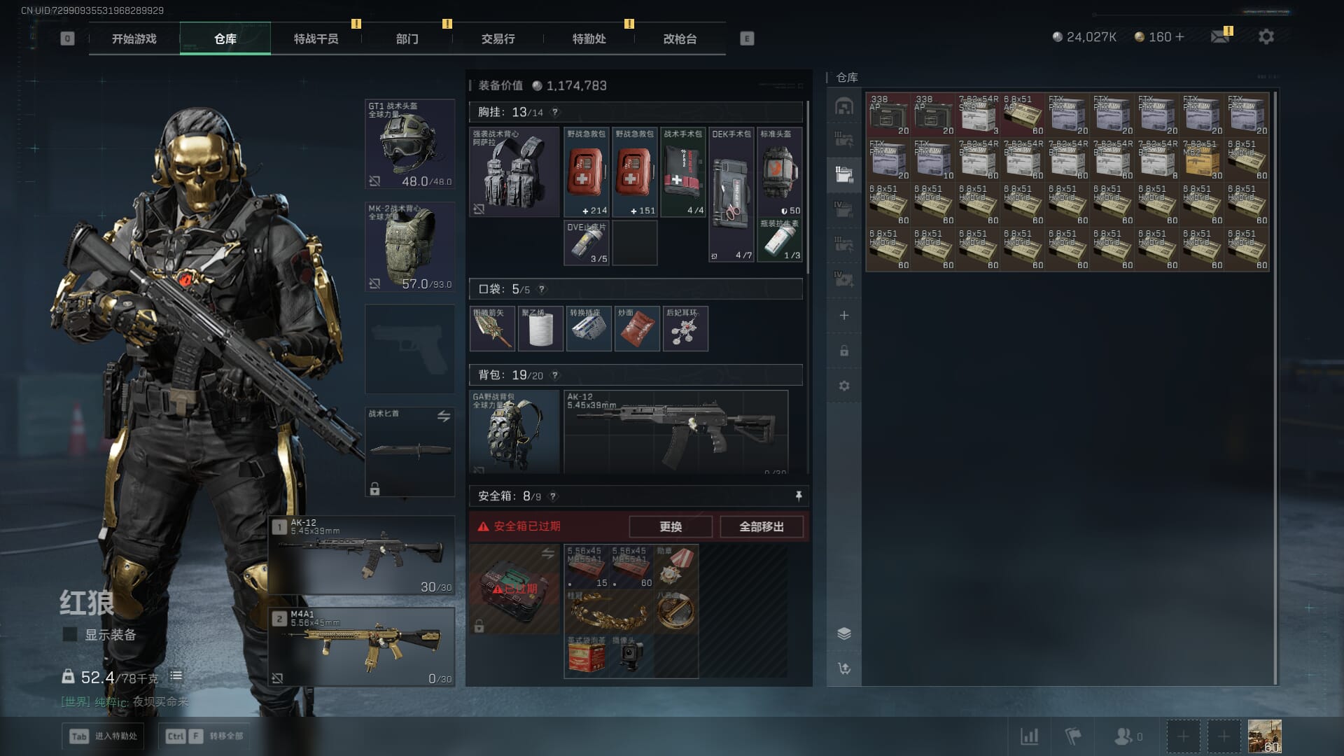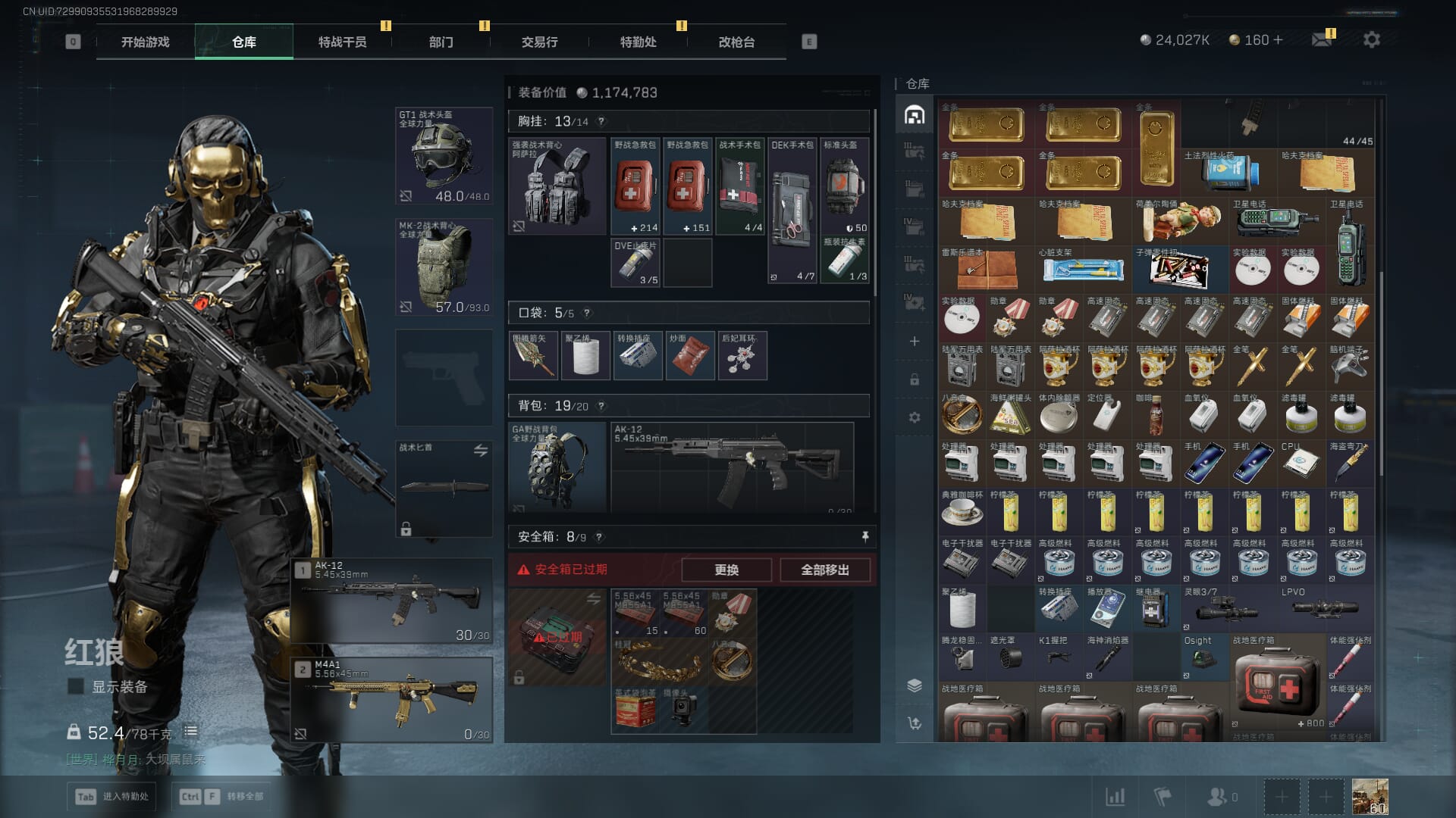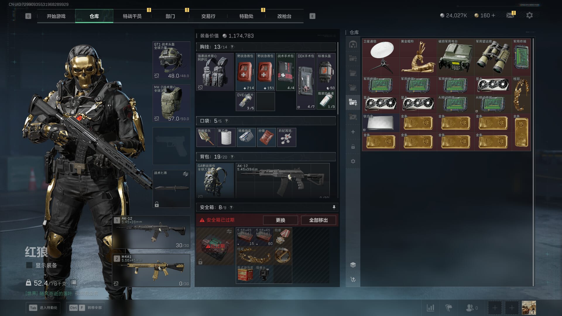 | TD10778/QQ区/可二次/钱包注销/【总资产:134.7M+红狼蚀金玫瑰+红狼电锯惊魂】哈夫币:2402W,武器皮肤35;烽火60级:钻石Ⅴ,战场:暂无段位,【安全箱】S7顶级安全箱;【特勤处等级】仓库LV.7,靶场LV.4,训练中心LV.6;【捆绑包3】鹅鸭杀捆绑包,蚀金玫瑰捆绑包,电锯惊魂干员捆绑包;【干员皮肤2】红狼蚀金玫瑰,红狼电锯惊魂;【近战皮肤】近战武器-黑鹰;【步枪皮肤】M4A1突击步枪-蚀金玫瑰,ASh-12战斗步枪-鹅鸭杀,SCAR-H战斗步枪-启航,KC17突击步枪-电锯惊魂;【冲锋枪皮肤】QCQ171冲锋枪-鹅鸭杀,MP5冲锋枪-战术竞备,勇士冲锋枪-工业狂潮;【狙击步枪皮肤】R93狙击步枪-维什戴尔;【轻机枪皮肤】QJB201轻机枪-鹅鸭杀;【挂饰9】挂饰-蚀金玫瑰,挂饰-维什戴尔,挂饰-大白鹅,挂饰-启程,诡影狙击兵,诡影喷火兵,崩岩重炮;【载具4】轮式突击炮-荣耀,突击直升机-原始伪装,M1A4坦克-护林人,突击车-寒梅;【货币】160三角卷 |