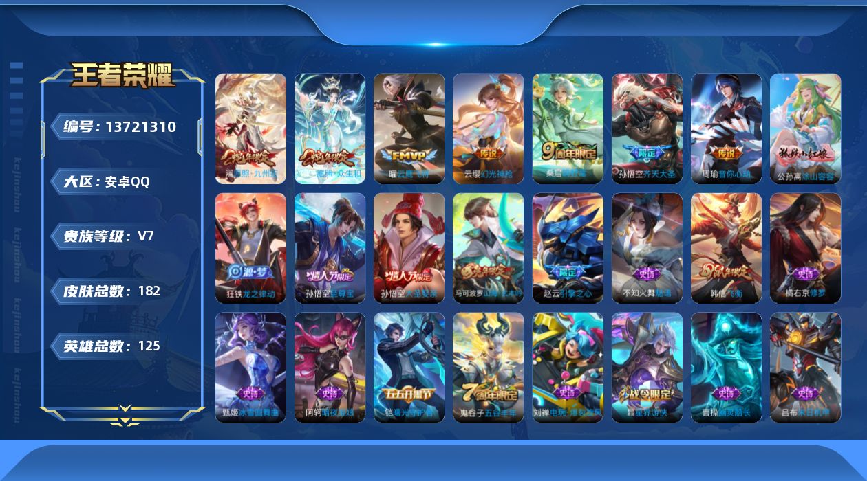 商品描述:[13721310]Xr44183-安卓-Q区-无二次-V7-永恒钻石III段位-125英雄-182皮肤-8传说-40史诗【英雄全皮】:孙权全皮【传说皮肤】:后羿神树通天,妲己愿照众生和,澜愿照九州拓,云缨幻光神枪,桑启鸣野蒿,孙悟空齐天大圣,周瑜音你心动,曜云鹰飞将【限定皮肤】:狄仁杰阴阳师,赵云皇家上将,赵云引擎之心,孙尚香蔷薇恋人,钟无艳超时空战士,扁鹊奇幻香踪,白起夜都怪侠,芈月幻夜卜梦,甄姬落雪兰心,马可波罗山海玄木吟,狄仁杰魔术师,狄仁杰万华元夜,项羽海滩派对,韩信飞衡,兰陵王金庭之子,孙悟空至尊宝,孙悟空大圣娶亲,孙悟空齐天大圣,李元芳云中旅人,杨戬潮玩骑兵,鬼谷子原初探秘者,鬼谷子五谷丰年,沈梦溪大漠名商,裴擒虎擒涛扼浪,云中君纤云弄巧,嫦娥暖冬兔眠,西施玲珑珍味,鲁班大师探海日志,桑启海盐诗旅,暃星界游侠,张良古海寻踪,高渐离燃音魔法,妲己灵卜魔法,鬼谷子天穹祈灯,沈梦溪龙舞盛年,刘邦剑破天穹,刘备异域游侠【年限皮肤】:韩信飞衡,马可波罗山海玄木吟【赛季限定】:狄仁杰万华元夜,兰陵王金庭之子,张良古海寻踪,李元芳云中旅人,鬼谷子原初探秘者,沈梦溪大漠名商,裴擒虎擒涛扼浪,鲁班大师探海日志,桑启海盐诗旅,鬼谷子天穹祈灯,刘邦剑破天穹【战令限定】:钟无艳超时空战士,扁鹊奇幻香踪,白起夜都怪侠,芈月幻夜卜梦,甄姬落雪兰心,杨戬潮玩骑兵,嫦娥暖冬兔眠,西施玲珑珍味,暃星界游侠,高渐离燃音魔法,妲己灵卜魔法【史诗皮肤】:阿轲暗夜猫娘,赵云皇家上将,甄姬冰雪圆舞曲,狄仁杰魔术师,宫本武藏鬼剑武藏,孙尚香蔷薇恋人,孙尚香水果甜心,嬴政暗夜贵公子,墨子金属风暴,吕布圣诞狂欢,曹操幽灵船长,吕布末日机甲,孙悟空至尊宝,赵云引擎之心,刘邦德古拉伯爵,夏侯惇乘风破浪,小乔缤纷独角兽,兰陵王暗隐猎兽者,雅典娜冰冠公主,百里守约特工魅影,铠曙光守护者,白起星夜王子,孙悟空大圣娶亲,伽罗箭羽风息,狄仁杰鹰眼统帅,韩信飞衡,不知火舞魅语,橘右京修罗,云中君纤云弄巧,钟无艳超时空战士,鬼谷子五谷丰年,暃星界游侠,马可波罗山海玄木吟,扁鹊奇幻香踪,刘禅电玩爆裂旋风,妲己灵卜魔法,高渐离燃音魔法,弈星万物之道,狂铁龙之律动,公孙离涂山容容,少司缘巫礼祀神【其他皮肤】:项羽海滩派对,韩信教廷特使,韩信街头霸王,达摩大发明家,赵云白执事,赵云忍炎影,白起白色死神,武则天东方不败,扁鹊化身博