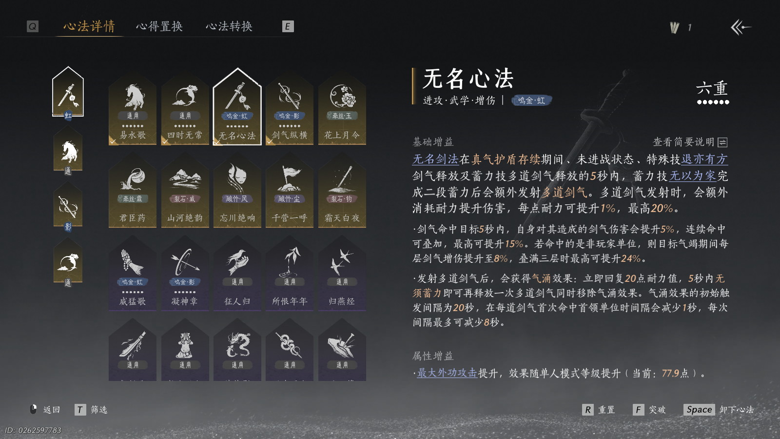 XY-076647880 风华值17875 武林造诣(鹅)30320 已用八音窍数量3 未用八音窍数量1 角色性别【文本】男 【绝境】 【无换绑CD】 【未绑定或可换绑】 【未注册】 【不支持人脸包赔】 【男】 【无】 【安卓】 【是】 【是】 稀有发型1 稀有武学奇术2 稀有发型:扶光; 稀有武学奇术:鱼龙焰舞,一雷惊蛰;