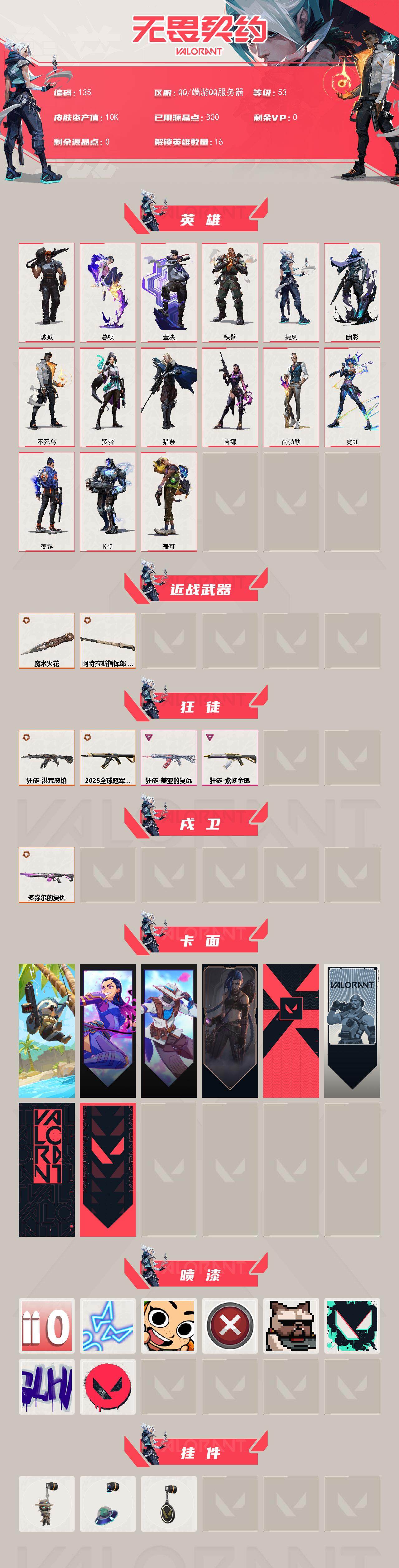 商品描述:[13721430]【英雄】:炼狱,暮蝶,壹决,铁臂,捷风,幽影,不死鸟,贤者,猎枭,芮娜,尚勃勒,霓虹,夜露,K/O,盖可【近战 武器】:近战武器-魔术火花,近战武器-阿特拉斯指挥部 甩棍,近战武器-魔术火花【狂徒】:狂徒-2025全球冠军赛,狂徒-洪荒怒焰,狂徒-盖亚的复仇,狂徒-紫阙金琅【戍卫】:戍卫-多弥尔的复仇【卡面】:树懒大作战 卡面,无畏契约GO!第一卷:芮娜 卡面,无畏契约GO!第一卷:零 卡面,《双城之战》金克丝 卡面,代号红色 卡面,新兵报到 卡面,V契约 卡面,无畏契约 卡面【喷漆】:拼一枪 喷漆,霓光四射 喷漆,要喝完噢! 喷漆,买装还是存钱 喷漆,关门放狗 喷漆,胜利属于无畏契约 喷漆,GLHF 喷漆,无畏契约 喷漆【挂饰】:无畏契约GO!第一卷 零 挂饰,天外飞客 挂饰,无畏契约 纪念币 挂饰