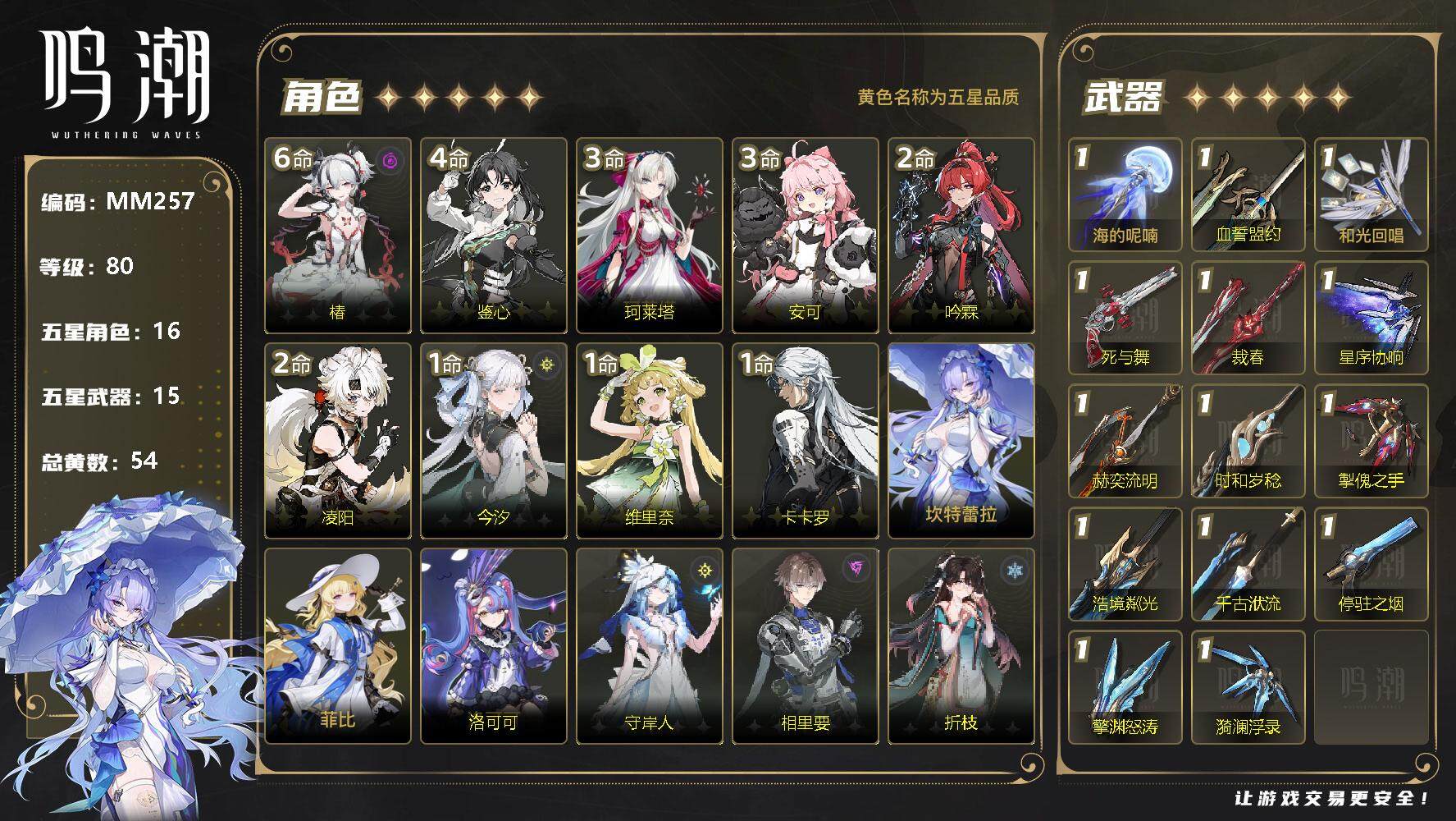 [9995997]【MM257】【MF3887 散华皮肤 +300珊瑚 7.11月卡余95天 6+1椿 3+1珂莱塔 1+1今汐 0+1菲比 0+1长离 0+1守岸人 0+1坎特蕾拉 2+1吟霖 洛可可 相里要 折枝】80级/54黄/女主/16个五星角色/15个五星武器未绑定,坎特蕾拉,菲比,珂莱塔,洛可可,椿,守岸人,相里要,折枝,长离,今汐,吟霖,维里奈,鉴心,卡卡罗,安可,凌阳,海的呢喃,血誓盟约,和光回唱,死与舞,裁春,星序协响,赫奕流明,时和岁稔,掣傀之手,浩境粼光,千古洑流,停驻之烟,擎渊怒涛,漪澜浮录,满命椿,4命鉴心,3命珂莱塔,3命安可,2命吟霖,2命凌阳,1命今汐,1命维里奈,1命卡卡罗,0命坎特蕾拉,0命菲比,0命洛可可,0命守岸人,0命相里要,0命折枝,0命长离,精1海的呢喃,精1血誓盟约,精1和光回唱,精1死与舞,精1裁春,精1星序协响,精1赫奕流明,精1时和岁稔,精1掣傀之手,精1浩境粼光,精1千古洑流,精1停驻之烟,精1擎渊怒涛,精1漪澜浮录