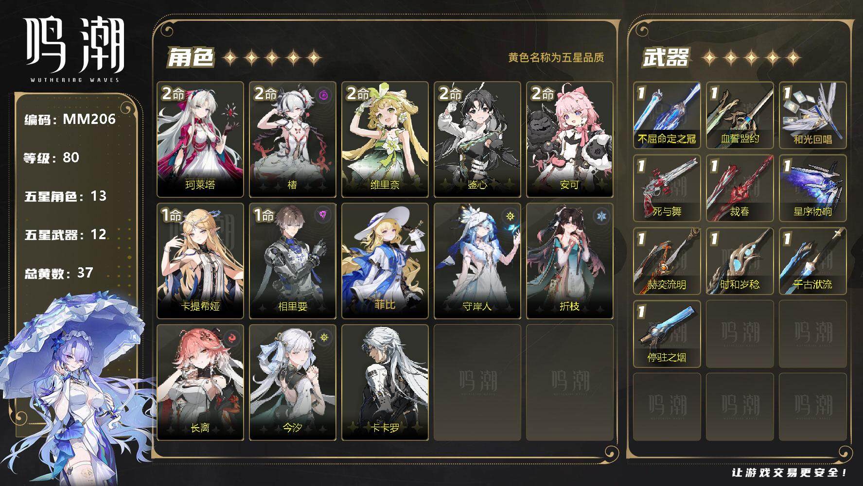 [11395612]【MM3115】【MF2108】80级/30黄/女主/11个五星角色/9个五星武器未绑定,坎特蕾拉,菲比,珂莱塔,洛可可,椿,长离,今汐,吟霖,维里奈,鉴心,卡卡罗,和光回唱,悲喜剧,死与舞,裁春,时和岁稔,掣傀之手,千古洑流,擎渊怒涛,4命鉴心,3命维里奈,1命椿,1命吟霖,1命卡卡罗,0命坎特蕾拉,0命菲比,0命珂莱塔,0命洛可可,0命长离,0命今汐,精1和光回唱,精1悲喜剧,精1死与舞,精1裁春,精1时和岁稔,精1掣傀之手,精1千古洑流,精1擎渊怒涛