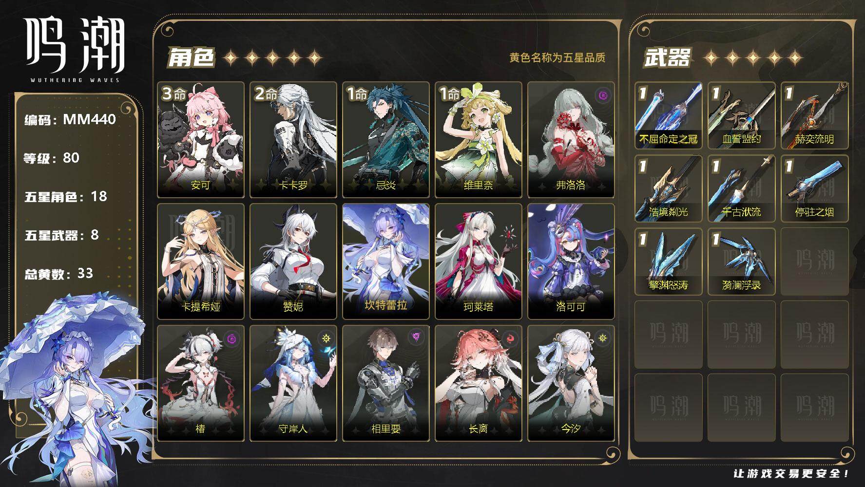 [10197002]【MM440】【MF4088送30浮金波纹】80级/33黄/女主/18个五星角色/8个五星武器未绑定,弗洛洛,卡提希娅,赞妮,坎特蕾拉,珂莱塔,洛可可,椿,守岸人,相里要,长离,今汐,吟霖,忌炎,维里奈,鉴心,卡卡罗,安可,凌阳,不屈命定之冠,血誓盟约,赫奕流明,浩境粼光,千古洑流,停驻之烟,擎渊怒涛,漪澜浮录,3命安可,2命卡卡罗,1命忌炎,1命维里奈,0命弗洛洛,0命卡提希娅,0命赞妮,0命坎特蕾拉,0命珂莱塔,0命洛可可,0命椿,0命守岸人,0命相里要,0命长离,0命今汐,0命吟霖,0命鉴心,0命凌阳,精1不屈命定之冠,精1血誓盟约,精1赫奕流明,精1浩境粼光,精1千古洑流,精1停驻之烟,精1擎渊怒涛,精1漪澜浮录