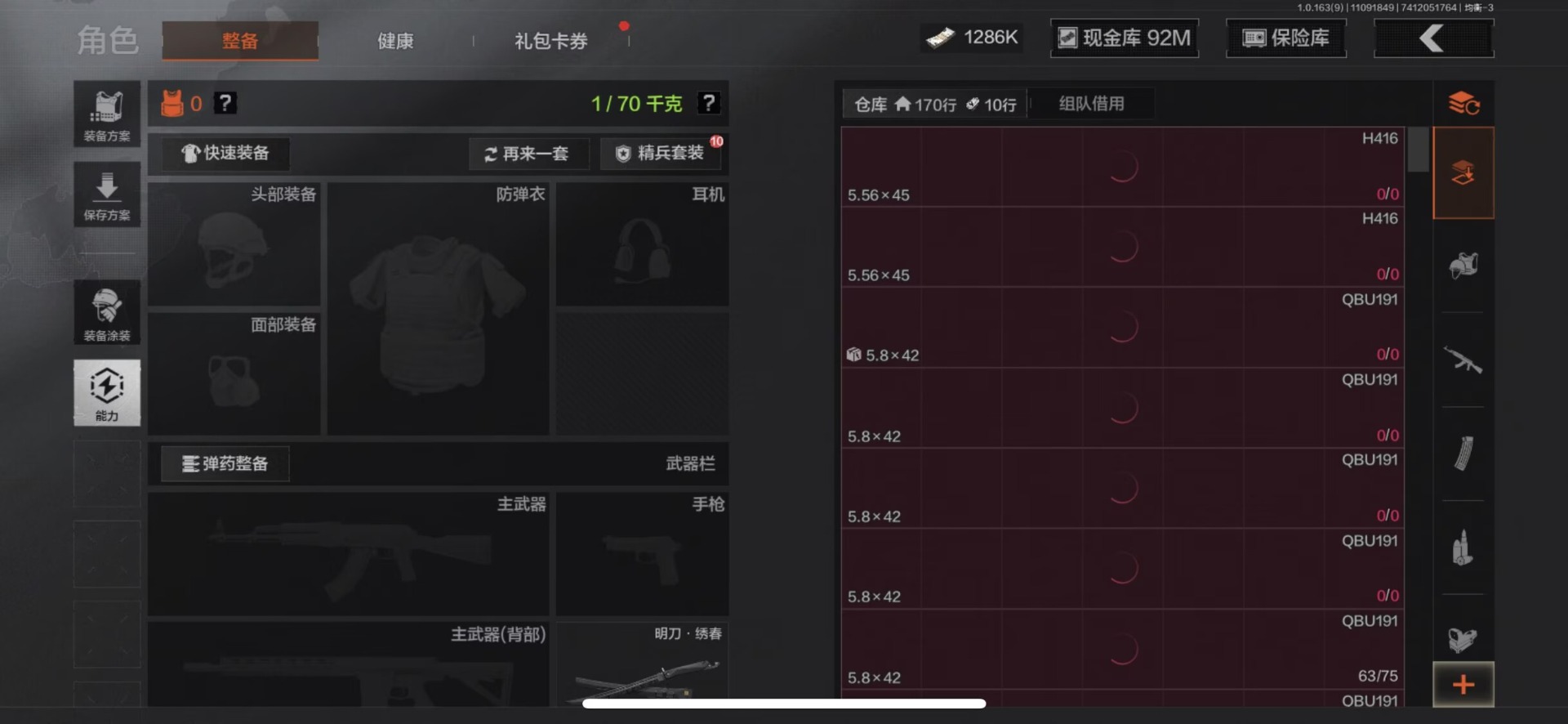 库存价值9.9 5近战武器 1金套装 1金枪皮 可修改实名 【柯恩币数量】:57345【角色装扮(金)】:火绒·塔莉娅【近战武器】:来战·开山刀,瀚星斩铁,工兵铲,涂鸦利刃,裁决手杖剑【金色枪皮】:竞技·FAL【紫色枪皮】:火绒·AK12,棱光裂变·AKM,无畏·USAS12,骑士之剑·SJ16,百锻寒芒·T03,百锻寒芒·T951,竞技·AUG,V·SKS,竞技·MDR,掌中盾·MP5,自喷网格·H416,来战·AK74N,德尔塔小队·M4A1,玄戈梨花·MPX,07式林地迷彩·QBZ191,全地形数码·M110【角色装扮(紫)】:都市夜影套装
