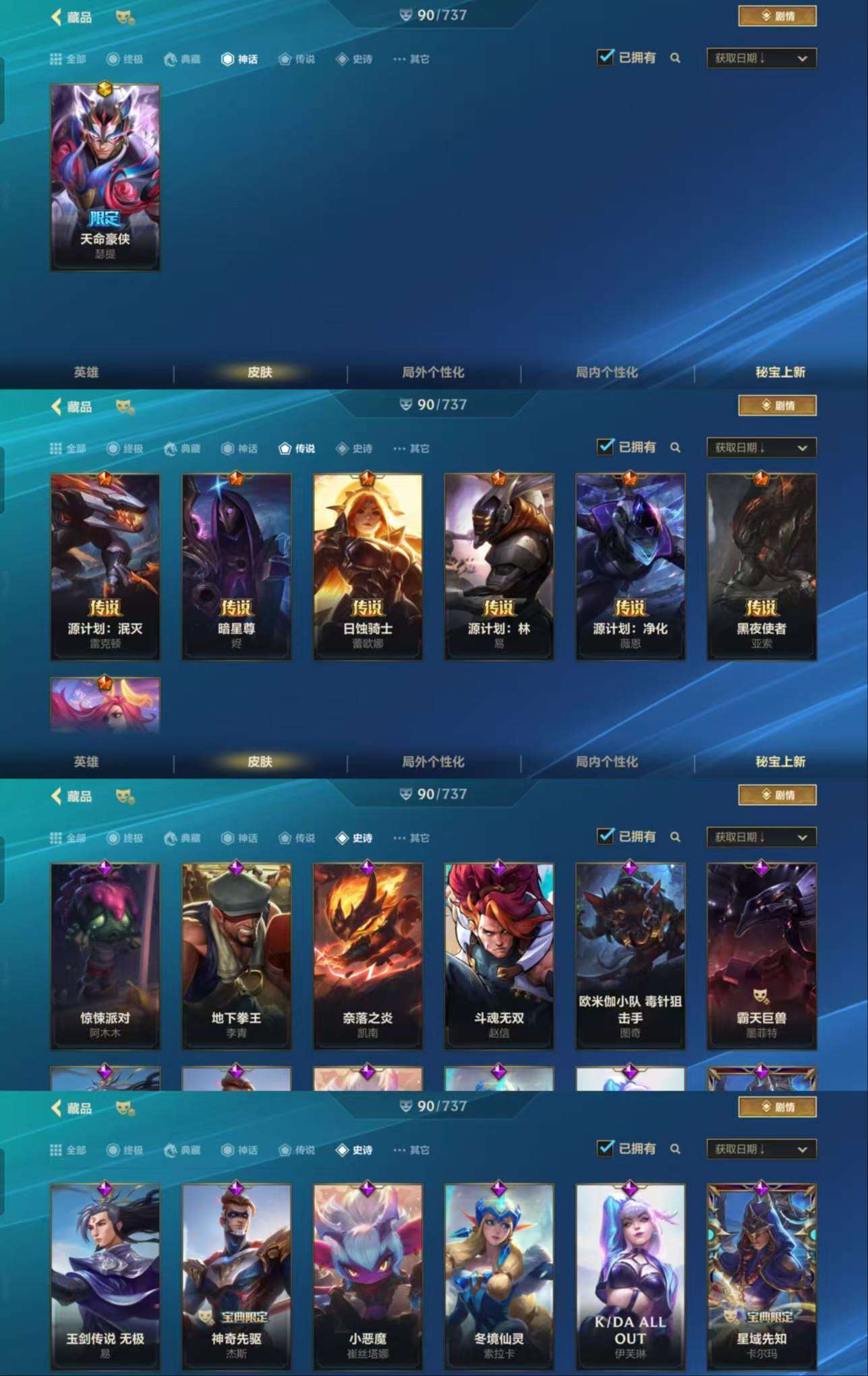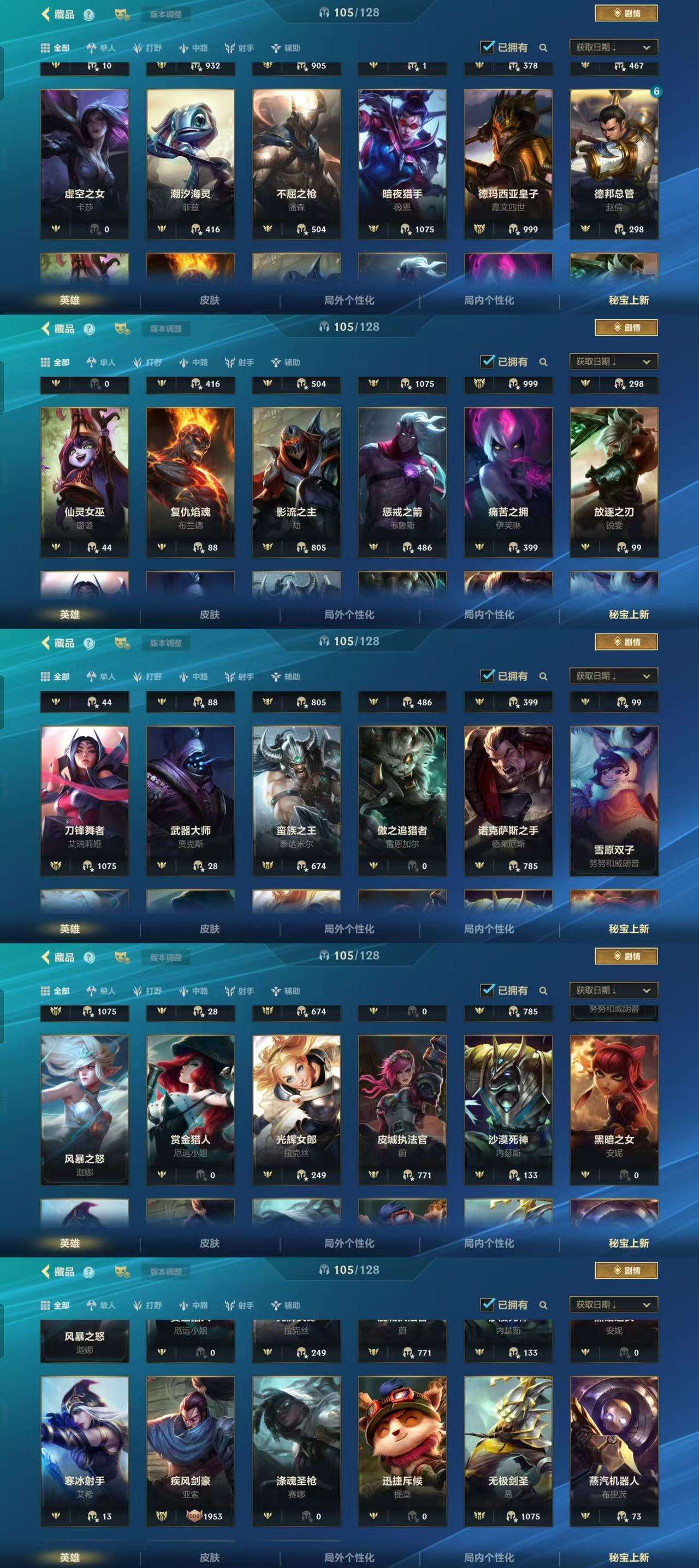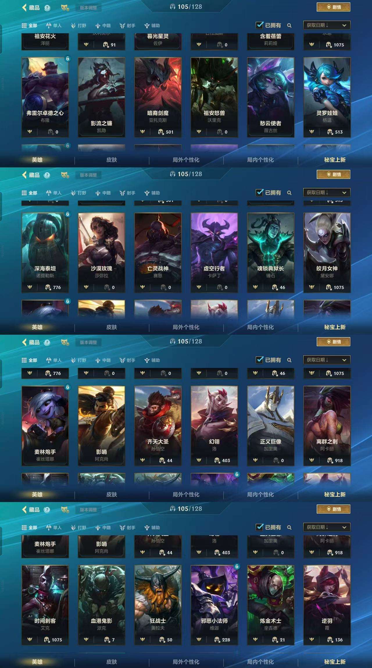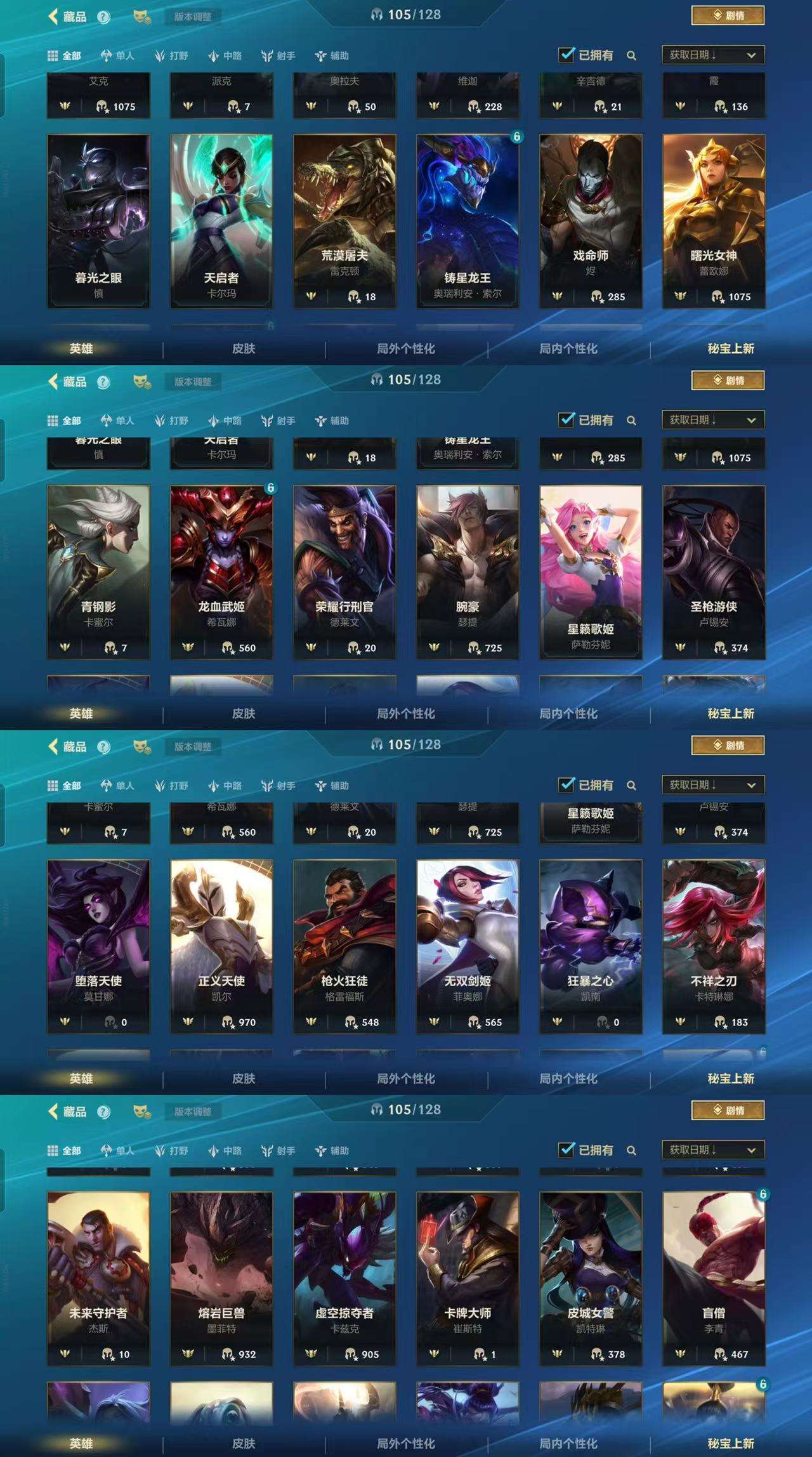 【LS480】109英雄/97皮肤/1神话/3传说/荣耀黄金/龙的传人 李青/战斗学院 白金学长 伊泽瑞尔/水晶玫瑰 娑娜/源计划:净化 薇恩/黑夜使者 亚索/天煞 劫/律政大亨 蒙多医生/福牛守护者 厄运小姐/钢铁军团 盖伦/丧尸 努努和威朗普/暗星 卡兹克/末路管家 布隆/猛虎 布隆/圣诞老人 布隆/源计划:升华 烬/神龙尊者 玉境灵龙 卡莎/猎龙勇士 潘森/铁血女忍 阿卡丽/福牛守护者 菲奥娜/银河魔装机神 安妮/死亡誓约 劫/武神 贾克斯/欧米伽小队 魔鬼伞兵 崔丝塔娜/小恶魔 崔丝塔娜/大魔王 提莫/小蜜蜂 提莫/驯龙女巫 璐璐/破败军团 希瓦娜/源计划:裁决 蔚/福牛守护者 嘉文