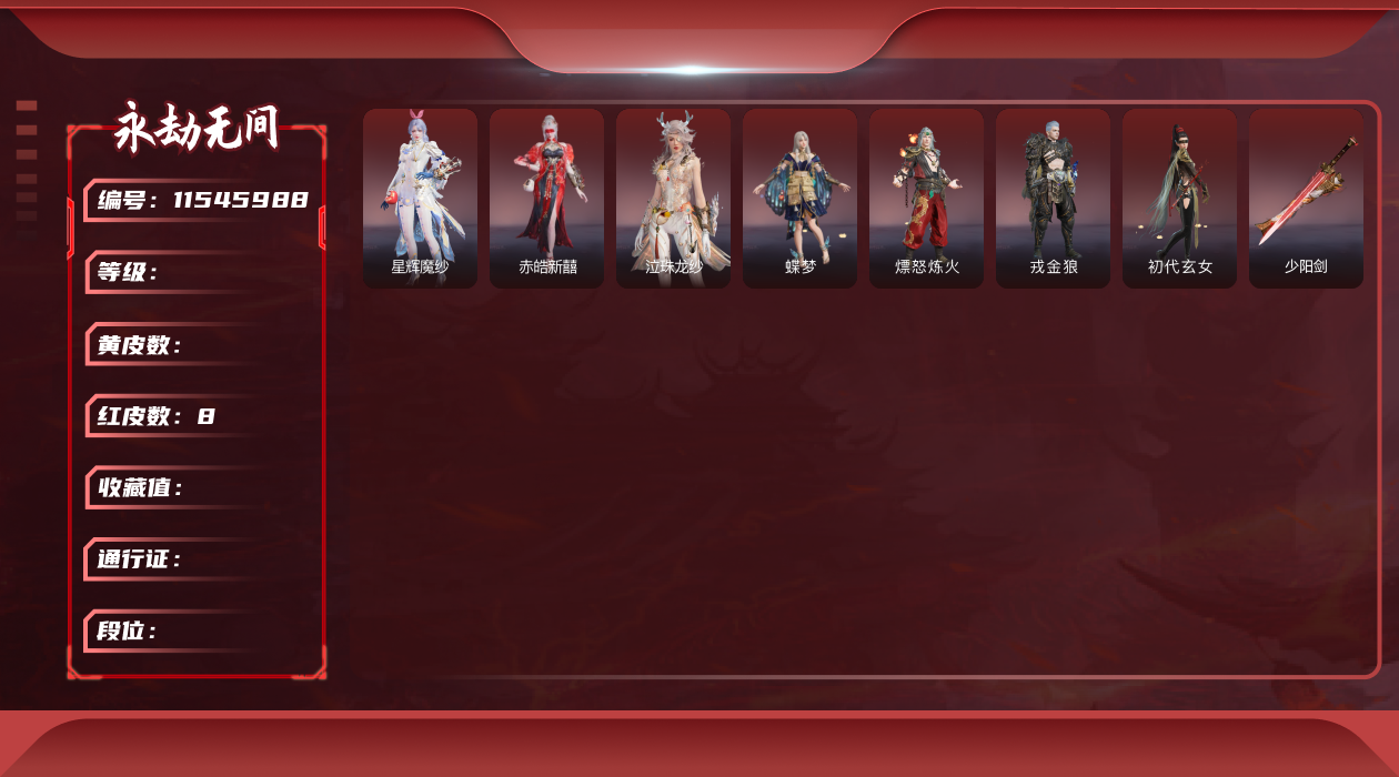 [11991630]WJ1675,steam端游,可换绑,三人段位蚀月5,声望等级11,19红622金,等级735,幻丝916040,金砖1510,通行证Lv.100,变身器,荆魂,千秋匠心凶虎,红色神品,赤皓新囍,初代玄女,星辉魔纱,化生明王,戎金狼,熛怒炼火,樱云天女,墨离,泣珠龙纱,绝代风华,监兵凶神,天罚,麒麟魄,2674九阴,龙雀,狼主,飞将戟,西行劫如意金箍棒,狂龙,角色金色皮肤,昆仑之主,观山海相柳,夜华朝,耀世魂花,玄豹姿,紫金玉女,碧水青天,昆仑圣女,P5R奥村春NOIR,云溪仙子,绿野守护悠竹萌客,楚韵九歌山鬼,绮云衫,絮云衣,九骊之君,武道无穷少林,若水尊者,九州遗珍福寿仙,智绘萍之缘,沐昭,新倩女幽魂流纨裙,怪诞狂想红蓝狂想,护世四法多闻天王,银狼裘,噬月天狼,追猎,长歌诗韵鹧鸪天,巫师3杰洛特,巨阙,龙心炽焰,孽炎祸斗,立天地,游四海,长歌诗韵遣唐使,辉烨少女,春桃笑,御宅罗梦,清雅少女,贵胄少女,妖刀姬,汐泪,绿野守护暗沼摩罗,阿娜希塔,楚韵九歌湘夫人,巨鲸客,赤雾烟霞,蛰龙吟,开辟鸿蒙金戈止,复制体尼尔,百战破荆者,弘毅袍,龙之影过江龙,梨园传奇柳生,封神录申公豹,司天命,幽篁山鬼,朝闻道,金沙梦蜀,若谷,禄运玉霄,藏雨阁主,畲族凤凰装,赤丹朱湛,寒英素雪,烈武者,花之倾奇,苍雷丸,倒反阴阳凛冬,千秋匠心玉叶景,长歌诗韵胡旋女,观山海青鸟,神鹰之女,惊云羽,福瑞天泽,观山海秋神蓐收,行空裘,炽火照夜,干将莫邪,观山海冬神玄冥,春不敛,日影花阴,黄昏巫主,夜绸袍,长歌诗韵念奴娇,寿竹云春,赤诚心,绿野守护山漠狞影,雪铃绮歌,活动中心手机绑定无法解绑,找回包赔[8565404]精品18红皮号悍虎斩+精武魂+炎烈珠+赛季外观任选礼一个!!!18红531金 【网易邮箱】 红皮: 初代玄女(宁红叶皮肤),戎金狼(特木尔皮肤),绝代风华(迦南皮肤),沙漠香风(迦南皮肤),熛怒炼火(季沧海皮肤),蝶梦(胡桃皮肤),青龙将星(岳山皮肤),香雪水兰(顾清寒皮肤),狼主(阔刀皮肤),少阳剑(长剑皮肤),化生明王(天海皮肤),泣珠龙纱(崔三娘皮肤),涯角(枪皮肤),飞将戟(斩马刀皮肤),星辉魔纱(沈妙皮肤),悍虎斩(斩马刀皮肤) 收藏值:338740幻丝:15008 精品服饰及变身器奥义:龙之影·精武魂+自动人形·A2+2674·千机喵+夏日派对·半夏晚风+御祥云+炎烈珠+灵狐耳 段位因赛季原因发生变化,以上号为准,头像、发饰、挂饰、魂玉及其他皮肤请看截图