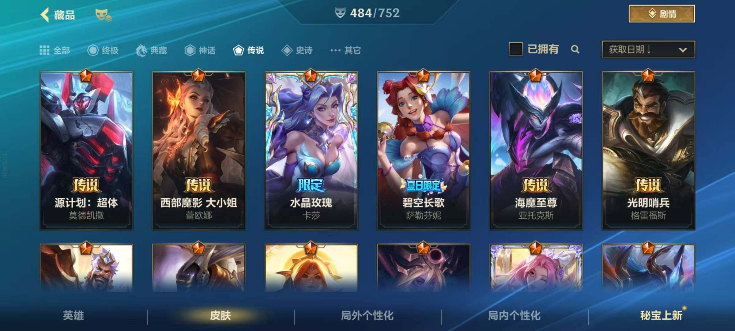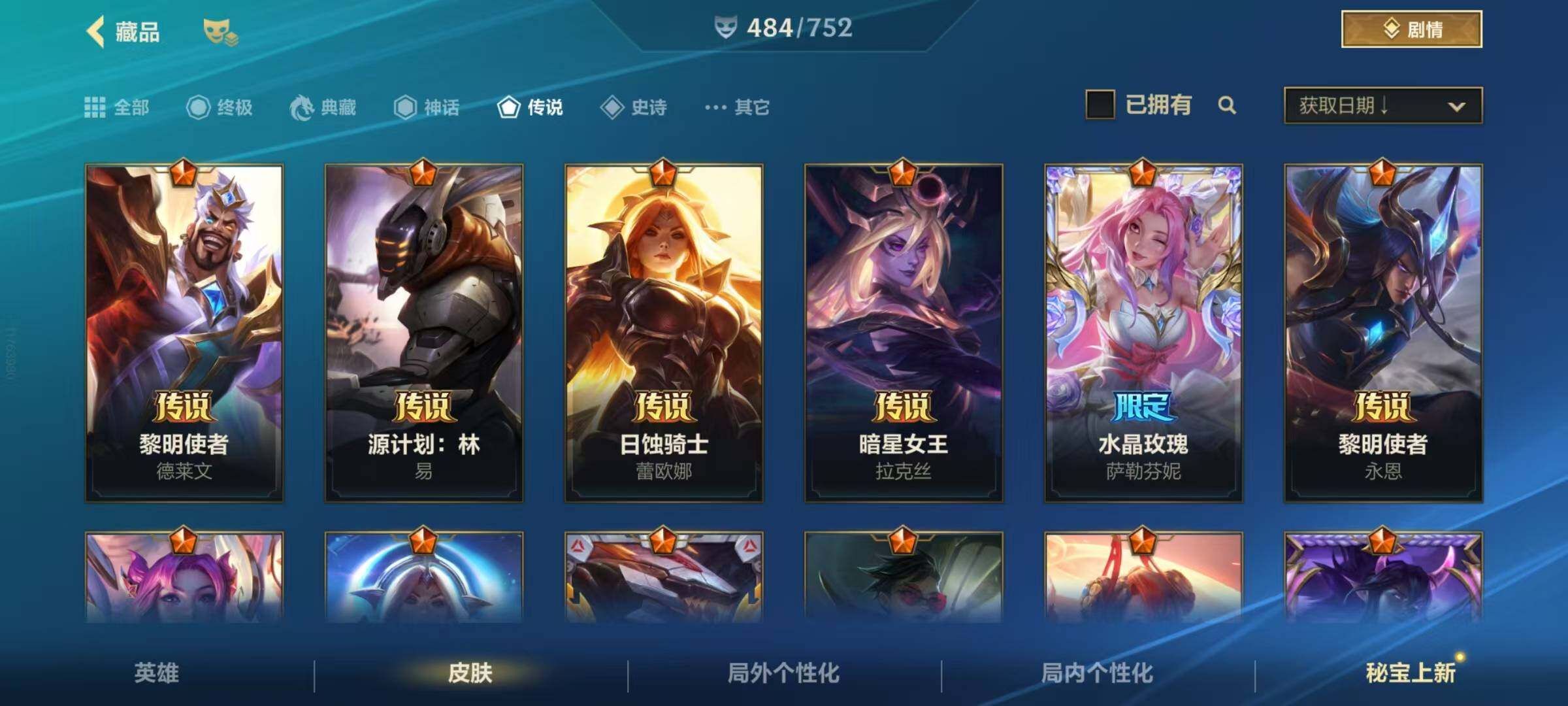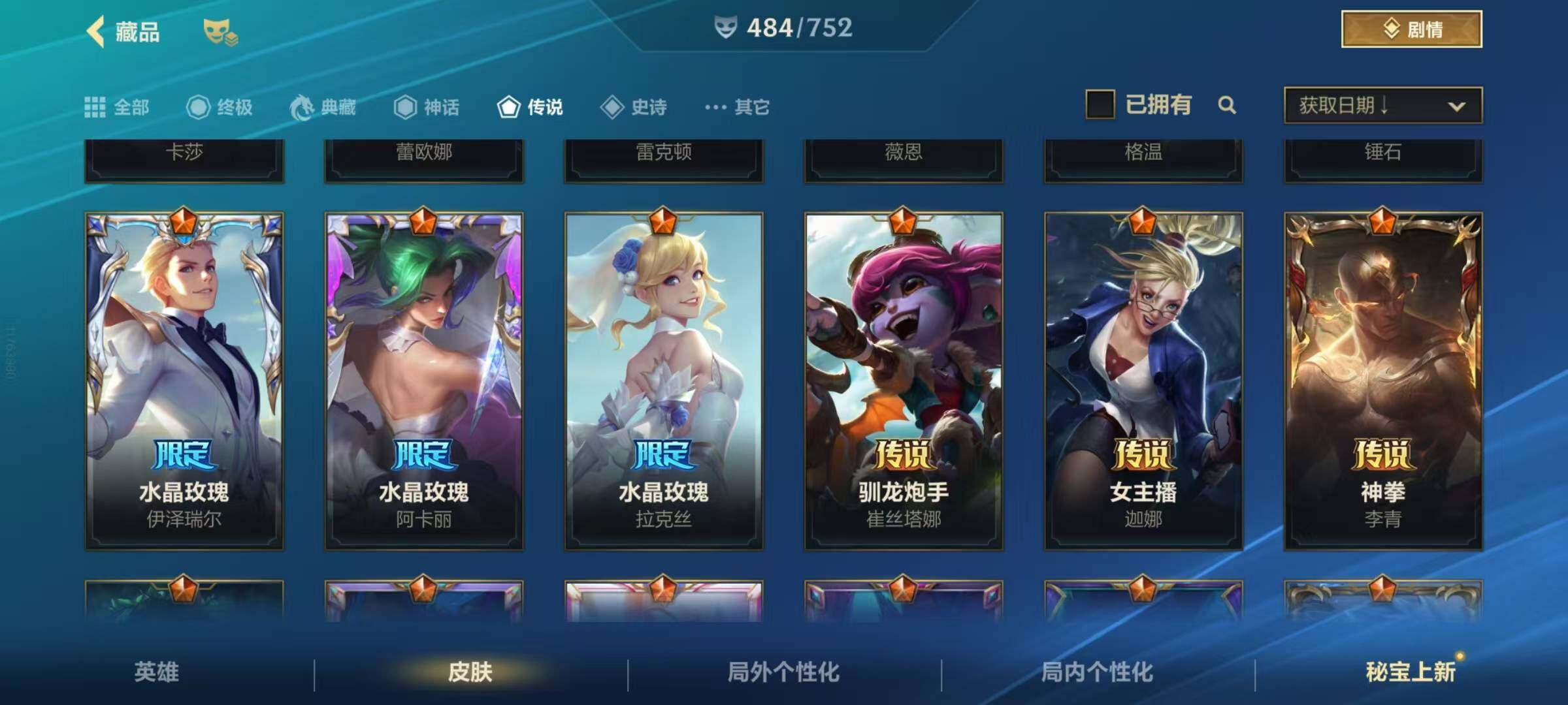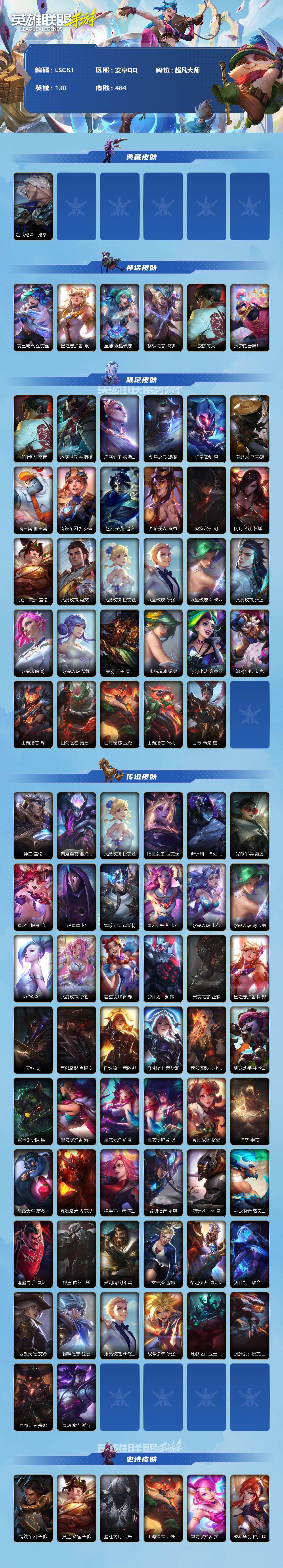 【LSC83】130英雄/484皮肤/1典藏/7神话/50传说/279史诗/超凡大师/超武乾坤:孤拳 瑟提/夜星流火 金克丝/星之守护者 永绽盛芒 阿狸/至臻 水晶玫瑰 格温/黎明使者 破晓之殇 佛耶戈/龙的传人 李青/巡游踏云霄! 墨菲特/地底世界 崔斯特/广寒仙子 嫦娥 黛安娜/创星之灵 璐璐/斩星魔剑 易/养蜂人 辛吉德/鸡里奥 加里奥/钢铁军团 拉克丝/赵云 子龙 赵信/烈焰美人 薇恩/虎痴之拳 蔚/闭月之颜 貂蝉 卡特琳娜/张辽 文远 盖伦/水晶玫瑰 嘉文四世/水晶玫瑰 拉克丝/水晶玫瑰 伊泽瑞尔/水晶玫瑰 阿卡丽/水晶玫瑰 永恩/水晶玫瑰 蔚/水晶玫瑰 娑娜/关羽 云长 泰达米尔