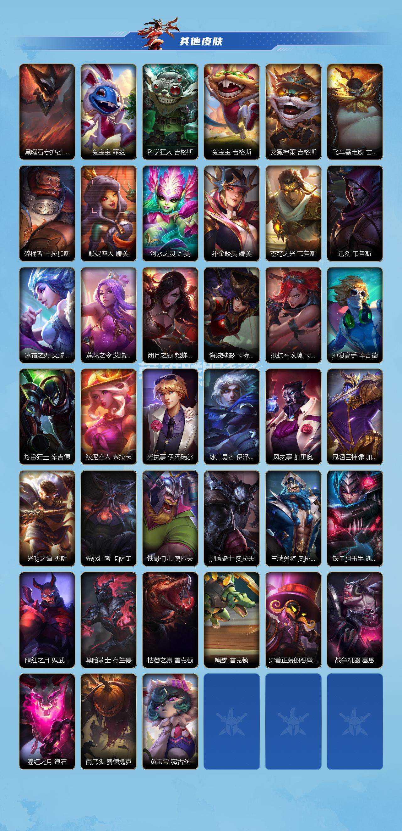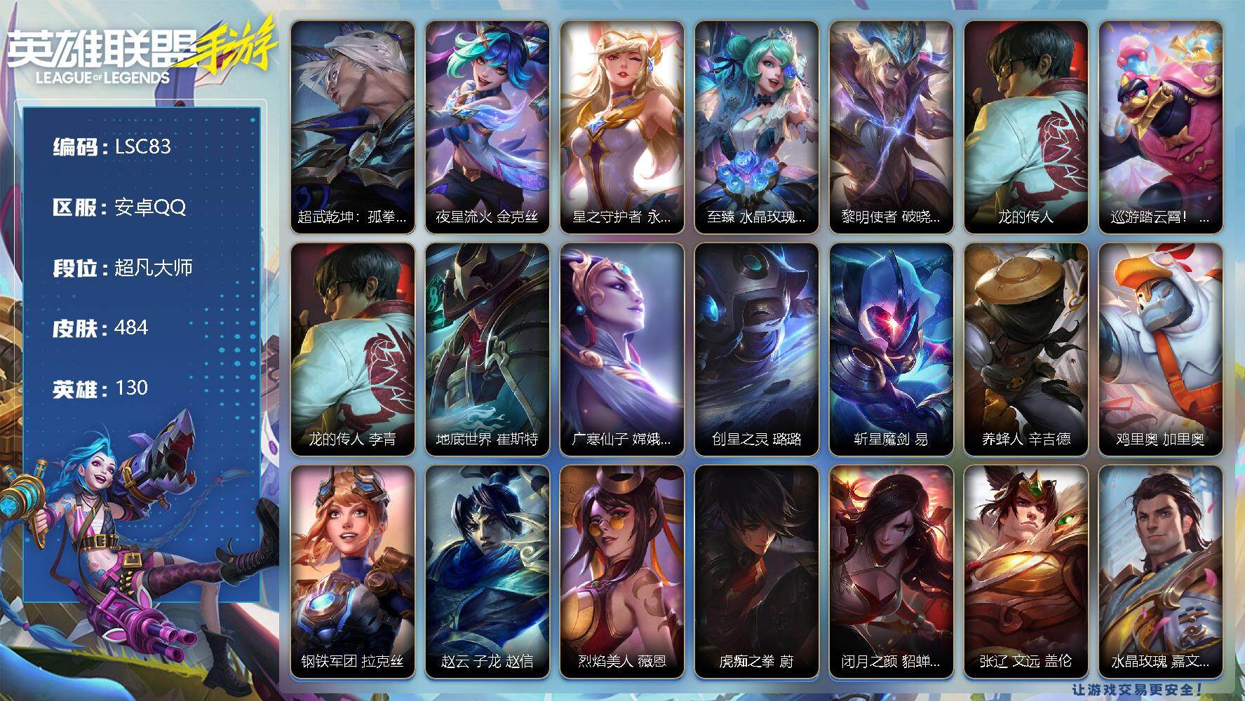【LSC58】129英雄/529皮肤/超凡大师/超武乾坤:虹影 劫/摄魂使者 薇恩/夜星流火 金克丝/龙的传人 李青/乘龙破渊 李青/斗魂耀世 德莱文/战斗学院 白金学长 伊泽瑞尔/蝶恋春 凯特琳/灰烬骑士 派克/穿星魔锋 赵信/创星之灵 璐璐/掠星魔刃 卡萨丁/御星魔矢 艾希/斩星魔剑 易/鸡里奥 加里奥/赵云 子龙 赵信/耀星女神 拉克丝/烈焰美人 薇恩/神龙烈焰 金克丝/闭月之颜 貂蝉 卡特琳娜/美猴王 孙悟空/水晶玫瑰 拉克丝/水晶玫瑰 永恩/水晶玫瑰 蔚/关羽 云长 泰达米尔/涂鸦小队 莎弥拉/涂鸦小队 艾克/山海绘卷 烬/山海绘卷 亚托克斯/山海绘卷 沃利贝尔/吕布 奉先 嘉文四【LS461】130英雄/506皮肤/4典藏/7神话/55传说/293史诗/最强王者/超武乾坤:虹影 劫/超武乾坤:孤拳 瑟提/超武乾坤:裁决 德莱厄斯/超武乾坤:征服 莎弥拉/摄魂使者 薇恩/夜星流火 金克丝/至臻 水晶玫瑰 格温/龙的传人 李青/至臻 灵魂莲华 易/灰烬骑士 派克/地底世界 崔斯特/穿星魔锋 赵信/创星之灵 璐璐/掠星魔刃 卡萨丁/御星魔矢 艾希/斩星魔剑 易/赵云 子龙 赵信/耀星女神 拉克丝/神龙烈焰 金克丝/虎痴之拳 蔚/张辽 文远 盖伦/水晶玫瑰 嘉文四世/美猴王 孙悟空/水晶玫瑰 阿卡丽/水晶玫瑰 永恩/水晶玫瑰 娑娜/关羽 云长 泰达米尔/水晶玫瑰 锐雯/涂鸦