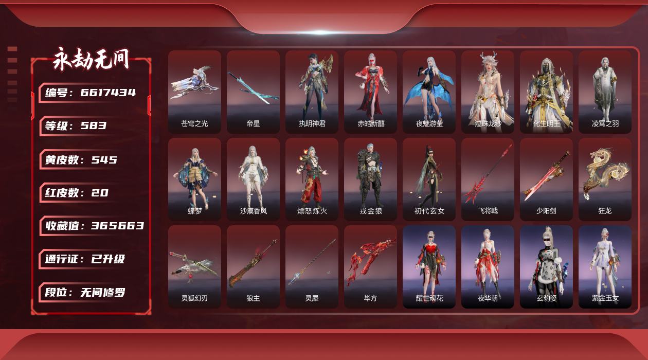 [6617434]帝星+毕方+灵狐幻刃等众多热门红皮精品账号!!!【网易邮箱】20红545金 杨戬+神武造像+御祥云+尼尔红皮: 初代玄女(宁红叶皮肤),戎金狼(特木尔皮肤),沙漠香风(迦南皮肤),熛怒炼火(季沧海皮肤),蝶梦(胡桃皮肤),凌霄之羽(无尘皮肤),灵狐幻刃(太刀皮肤),狼主(阔刀皮肤),灵犀(长枪皮肤),毕方(弓箭皮肤),狂龙(双节棍皮肤),化生明王(天海皮肤),泣珠龙纱(崔三娘皮肤),夜魅游莹(季莹莹皮肤),赤皓新囍(宁红夜皮肤),执明神君(魏轻皮肤)帝星(横刀皮肤)飞将戟(斩马刀皮肤)苍穹之光(五眼铳皮肤)少阳剑(长剑皮肤) 段位因赛季原因发生变化,以上号为准,头像、发饰、挂饰、魂玉及其他皮肤请看截图