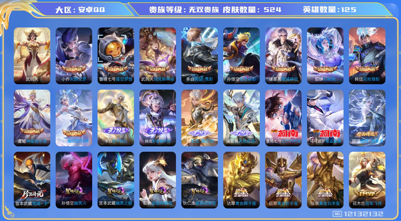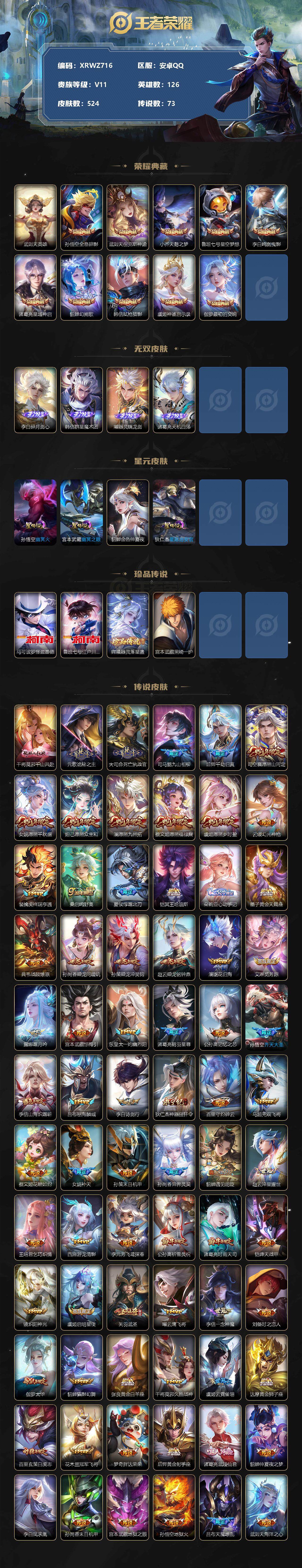 商品描述:[12132132]Xr41477-安卓Q-V11-最强王者段位-126英雄-524皮肤-10典藏-4无双-4珍品传说-4星元-73传说-158史诗【荣耀典藏】:武则天英雄,孙悟空全息碎影,武则天倪克斯神谕,小乔天鹅之梦,鲁班七号星空梦想,李白鸣剑曳影,诸葛亮星域神启,貂蝉幻阙歌,韩信弑枪猎影,虞姬神鉴启示录,伽罗最初的交响【无双皮肤】:李白碎月剑心,韩信群星魔术团,曜器灵螭龙剑,诸葛亮天机白泽【珍品传说】:马可波罗怪盗基德,鲁班七号江户川柯南,嫦娥器灵落星盏,宫本武藏黑崎一护【传说皮肤】:干将莫邪千山共赴,元歌诡秘之主,大司命死亡执政官,司马懿九山相柳,后羿千劫归真,司空震愿照山河定,女娲愿照千秋盛,妲己愿照众生和,澜愿照九州拓,蔡文姬愿照福禄聚,虞姬愿照岁时盈,云缨幻光神枪,裴擒虎祥瑞亨通,桑启鸣野蒿,夏侯惇霜北刀,铠冥王哈迪斯,朵莉亚心动手记,墨子黄金天蝎座,典韦战鼓燎原,孙尚香乘龙问璇玑,孙策乘龙淬吴钩,赵云乘龙铭钟鼎,澜逐花归海,艾琳觅芳踪,露娜霜月吟,宫本武藏惊梅引,东皇太一灼幽烈阳,诸葛亮鹤羽星尊,公孙离记忆之芯,孙悟空齐天大圣,李信山海炽霜斩,吕布怒海麟威,李白诗剑行,狄仁杰神器狴犴令,百里守约碎云,马超无双飞将,蔡文姬花朝如约,女娲补天,孙策末日机甲,孙尚香异界灵契,貂蝉遇见胡旋,赵云淬星耀世,王昭君乞巧织情,西施游龙清影,李元芳飞鸢探春,公孙离祈雪灵祝,诸葛亮时雨天司,铠绛天战甲,镜炽阳神光,虞姬启明星使,关羽武圣,曜云鹰飞将,李信一念神魔,刘备时之恋人,伽罗太华,貂蝉猫影幻舞,张良黄金白羊座,干将莫邪久胜战神,虞姬云霓雀翎,达摩黄金狮子座,百里玄策白虎志,花木兰冠军飞将,梦奇胖达荣荣,后羿黄金射手座,诸葛亮武陵仙君,貂蝉仲夏夜之梦,李白凤求凰,孙尚香末日机甲,宫本武藏地狱之眼,孙悟空地狱火,吕布天魔缭乱,武则天海洋之心,狄仁杰超时空战士【限定皮肤】:白起狰,夏侯惇霜北刀,铠冥王哈迪斯,暃埋骨钱,蒙犽顽岩魄,蔡文姬夏日便利店,大乔绒语心约,虞姬夏日便利店,姜子牙天穹之誓,李白谪仙醉月,狄仁杰阴阳师,虞姬凯尔特女王,廉颇寅虎御盾,赵云皇家上将,赵云引擎之心,赵云龙胆,赵云百木心枪,墨子神迹守卫,嬴政优雅恋人,嬴政白昼王子,孙尚香异界灵契,鲁班七号狮舞东方,鲁班七号乒乒小将,庄周高山流水,高渐离死亡摇滚,高渐离玩趣恶龙,扁鹊奇幻香踪,白起夜都怪侠,芈月重明,