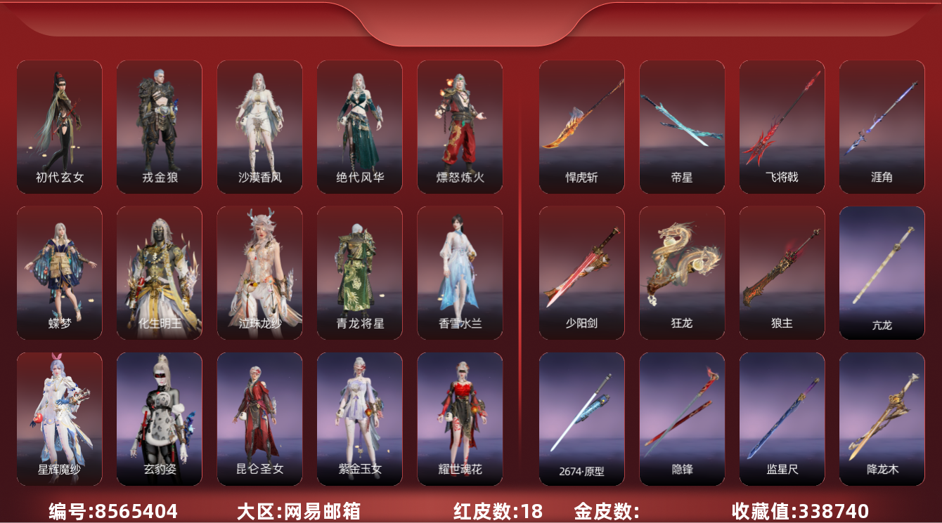 商品描述:[8565404]精品18红皮号悍虎斩+精武魂+炎烈珠+赛季外观任选礼一个!!!18红531金 【网易邮箱】 红皮: 初代玄女(宁红叶皮肤),戎金狼(特木尔皮肤),绝代风华(迦南皮肤),沙漠香风(迦南皮肤),熛怒炼火(季沧海皮肤),蝶梦(胡桃皮肤),青龙将星(岳山皮肤),香雪水兰(顾清寒皮肤),狼主(阔刀皮肤),少阳剑(长剑皮肤),化生明王(天海皮肤),泣珠龙纱(崔三娘皮肤),涯角(枪皮肤),飞将戟(斩马刀皮肤),星辉魔纱(沈妙皮肤),悍虎斩(斩马刀皮肤) 收藏值:338740幻丝:15008 精品服饰及变身器奥义:龙之影·精武魂+自动人形·A2+2674·千机喵+夏日派对·半夏晚风+御祥云+炎烈珠+灵狐耳 段位因赛季原因发生变化,以上号为准,头像、发饰、挂饰、魂玉及其他皮肤请看截图