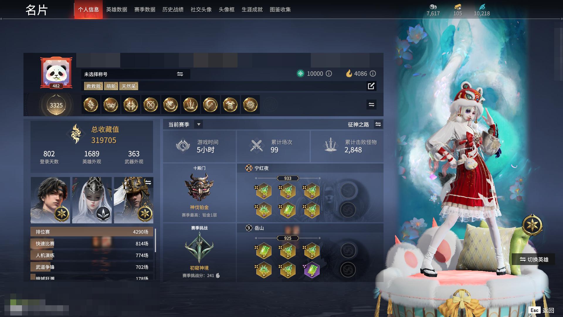 [11545988]双马尾女双马尾男!H10091.官服.8红304金, 技能奥义2, 总收藏值172274, 幻丝13833, 等级357, 三排黄金3, 通行证未升级Lv.1, 双马尾女双马尾男, 8红色神品: 赤皓新囍/初代玄女/星辉魔纱/戎金狼/熛怒炼火/蝶梦/泣珠龙纱/少阳剑【技能奥义】 炎烈珠/勾玉 宁红夜: 赤皓新囍/初代玄女/山川润/夜华朝/九阴圣女/碧水青天/泠川发/簪缨发/双马尾女 沈妙: 星辉魔纱/双马尾女 天海: 双马尾男 殷紫萍: 风雨谐/萍之缘/双马尾女 特木尔: 戎金狼/致命玩笑/唐三/海神发/双马尾男 季沧海: 熛怒炼火/食神/杰洛特/巨阙/信手斩龙/夏神祝融/腾烟发/江海发/烈火发/白狼发/含锋发/双马尾男 胡桃: 蝶梦/御宅花织/贵胄少女/月丹发/双马尾女 崔三娘: 泣珠龙纱/叶奈法/湘夫人/阿娜希塔/伏波龙女/术士发/双马尾女 岳山: 过江龙/双马尾男 无尘: 黄庭道/朝闻道/申公豹/双马尾男 顾清寒: 龙吉公主/紫微星命/禄运玉霄/仲夏霜华/绯霜发/红鸾星发/双马尾女 武田信中: 双马尾男 迦南: 玉叶景/浣烟纱/蜃楼魅影/琳琅发/双马尾女 胡为: 不败擂主/蛤蟆头领/福瑞天泽/桀骜发/双马尾男 季莹莹: 干将莫邪/缱绻发/双马尾女 玉玲珑: 妲己/广目天王/商月发/笼烟芍药发/双马尾女 哈迪: 夜绸袍/秀逸发/双马尾男 魏轻: 寿竹云春/玄冥发/双马尾女 刘炼: 金财聚辉/姜子牙/仙风发/双马尾男 张起灵: 双马尾男 席拉: 暧冬茶馨/雪铃绮歌/蜜语发/双马尾女 蓝梦: 双马尾女 拳刃: 天狐 长剑: 少阳剑/亢龙/含光承影/壶中日月/湖女之剑/炼/赤霄/隐锋/2674原型 太刀: 天劫/数珠丸/毅魂守/鎏金勺/鬼切/魂花晶 横刀: 烛泪 阔刀: 不祥绯刃/听涛_/雷王锯/青石猊/龙蟠 斩马刀: 三尖两刃刀/斩怨/潮/麒麟牙 枪: 建木/灵木角/长虹 棍: 倒马棍/学宫之杖/糖果棍/降魔 匕首: 仙舞/判官笔/曼提柯尔之牙/桡尺刀/马首刀 扇: 耀夜流华/腾云歌/舞扇 双截棍: 咯咯/嘶风/夔牛槌/精武 双刀: 怨憎/新月/破重云/蛋仔派对咸鱼/诡月链魂 双戟: 光影裁决 连弩: 千机弩/咕咕/天牛翼/御气弩/穿云燕 鸟铳: 引冰落/戏祥云 火炮: 兔华笼/钻山/雪国礼炮/龙息 五眼铳: 丹鹤/凝冰魄/机枪豌豆 弓箭: 乌木弓/仙毫/豹胎易筋弓 8红色神品: 赤皓新囍/初代玄女/星辉魔纱/戎金狼/熛怒炼火/蝶梦/泣珠龙纱/少阳剑 挂饰: 昆仑龙神冠/桃夭扇/委蛇朱冠/狐灵面/狐九尾/福虎帽/虎绒耳/窥鲸镜/大光相/桂花糕/几何钥/雁落笠/葫芦兄弟蛤蟆头/安乐冠/灵皇/团上头了/青龙盔/银雪/倾城/捕光镜/青铜神树/能源电池/封神榜/粽香远/羽扇/星斗扇/鬼玺/碎釜/癸卯_/鹿铃角/素心流光卷/琵琶梳/六角铜铃/明心/沐芳花篮/雪鹿雄角/竞无间男/探险家墨镜/糖心/曜石面具/脑子给我/红绒暖女/捆龙索/洪兽/梦棠/判官簿/安歌帽/风羽面/防风帽/甲辰龙/红绒暖男/叠嶂宝鉴/蛋仔派对条状眼镜/夜露帽/九阴鳞/婵娟/怜光满/鲛人角/癸卯兔/鎏金螭龙/阴阳灵狐/青莲唤云铃/金瑛冠/雪鹿雌角/冬棱/霞彩 飞索: 毒刺