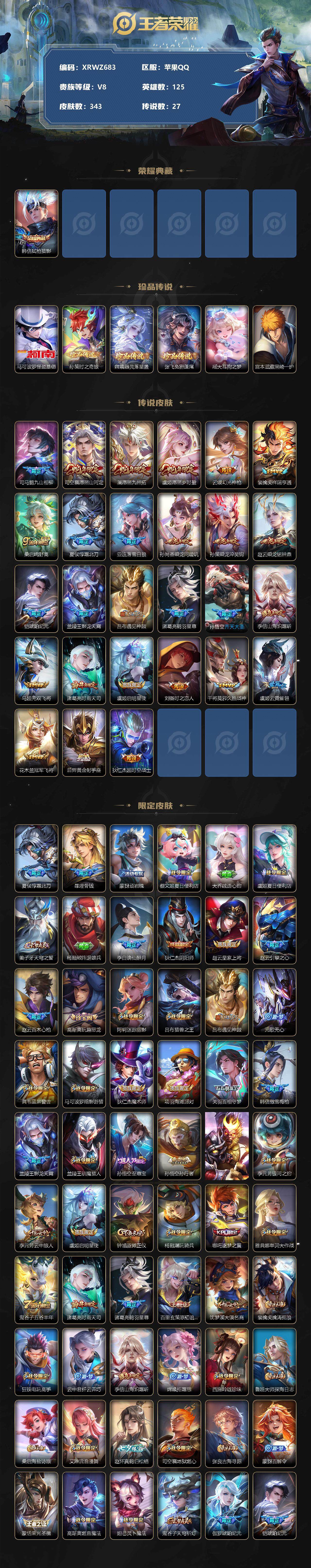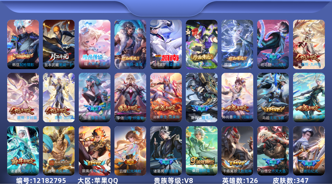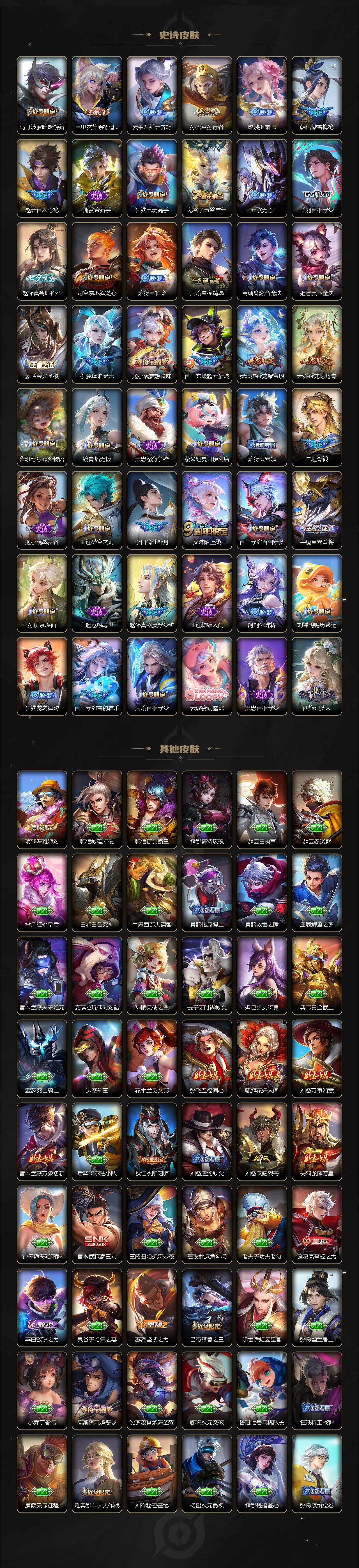 商品描述:[12182795]xr41351-苹果Q-V8-最强王者段位-125英雄-343皮肤-1典藏-0珍品无双-0无双-6珍品传说-27传说-83史诗 【荣耀典藏】:韩信弑枪猎影 【珍品传说】:马可波罗怪盗基德,孙策时之奇旅,嫦娥器灵落星盏,张飞兔狲蓬尾,瑶大耳狗之梦,宫本武藏黑崎一护 【传说皮肤】:司马懿九山相柳,司空震愿照山河定,澜愿照九州拓,虞姬愿照岁时盈,云缨幻光神枪,裴擒虎祥瑞亨通,桑启鸣野蒿,夏侯惇霜北刀,亚连落雪白狼,孙尚香乘龙问璇玑,孙策乘龙淬吴钩,赵云乘龙铭钟鼎,铠琥珀纪元,兰陵王影龙天霄,吕布遇见神鼓,诸葛亮鹤羽星尊,孙悟空齐天大圣,李信山海炽霜斩,马超无双飞将,诸葛亮时雨天司,虞姬启明星使,刘备时之恋人,干将莫邪久胜战神,虞姬云霓雀翎,花木兰冠军飞将,后羿黄金射手座,狄仁杰超时空战士 【限定皮肤】:夏侯惇霜北刀,暃埋骨钱,蒙犽顽岩魄,蔡文姬夏日便利店,大乔绒语心约,虞姬夏日便利店,姜子牙天穹之誓,杨戬破阵退雄兵,李白谪仙醉月,狄仁杰阴阳师,赵云皇家上将,赵云引擎之心,赵云百木心枪,高渐离玩趣恶龙,阿轲迷踪丽影,吕布猎兽之王,吕布遇见神鼓,元歌无心,典韦蓝屏警告,马可波罗暗影游猎,狄仁杰魔术师,项羽海滩派对,关羽百相守梦,韩信傲雪梅枪,兰陵王影龙天霄,兰陵王驯魔猎人,孙悟空至尊宝,孙悟空孙行者,孙悟空齐天大圣,李元芳银河之约,李元芳云中旅人,虞姬启明星使,钟馗驱傩正仪,杨戬潮玩骑兵,哪吒逐梦之翼,雅典娜单词大作战,鬼谷子五谷丰年,诸葛亮时雨天司,诸葛亮鹤羽星尊,百里玄策原初追逐者,沈梦溪大漠名商,裴擒虎擒涛扼浪,狂铁电玩高手,云中君纤云弄巧,李信山海炽霜斩,嫦娥拒霜思,西施玲珑珍味,鲁班大师探海日志,桑启海盐诗旅,艾琳流音漫舞,赵怀真鹤归松栖,司空震地狱燃心,张良古海寻踪,蒙犽百解令,蒙恬荣光圣徽,高渐离燃音魔法,妲己灵卜魔法,鬼谷子天穹祈灯,伽罗琥珀纪元,铠琥珀纪元,姬小满妄想食味,大乔乘龙忆丹青,安琪拉乘龙聚宝船,孙尚香乘龙问璇玑,孙策乘龙淬吴钩,赵云乘龙铭钟鼎,百里玄策超元猎域,亚连落雪白狼,沈梦溪龙舞盛年,鲁班七号蔬乡物语,李元芳蔬乡物语,刘邦剑破天穹,程咬金群星魔术团,镜青焰无极,项羽苍威无极,刘备异域游侠,周瑜熔金海岸 【年限皮肤】:诸葛亮时雨天司,李信山海炽霜斩,大乔乘龙忆丹青,安琪拉乘龙聚宝船,孙尚香乘龙问璇玑,孙策乘龙淬吴钩,赵云乘龙铭钟鼎 【赛季限