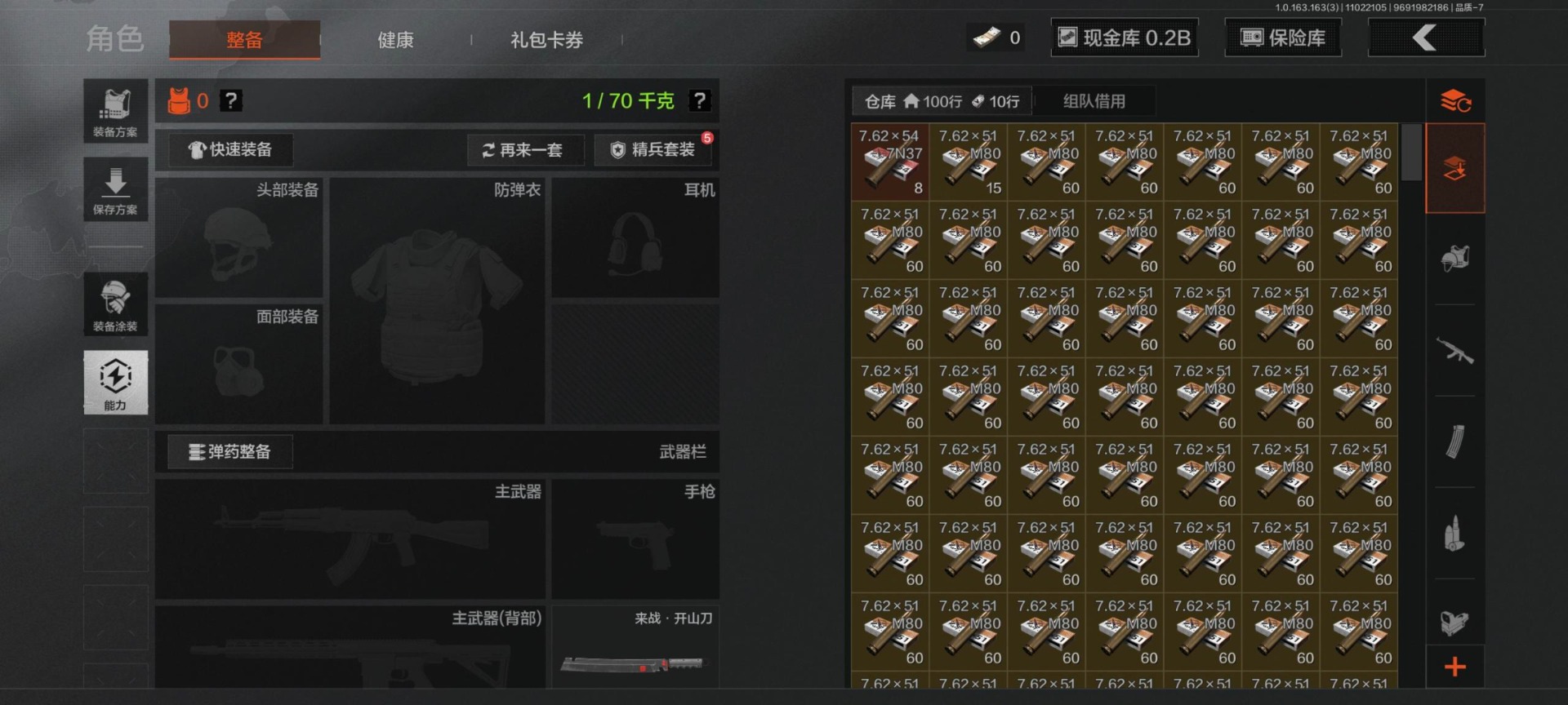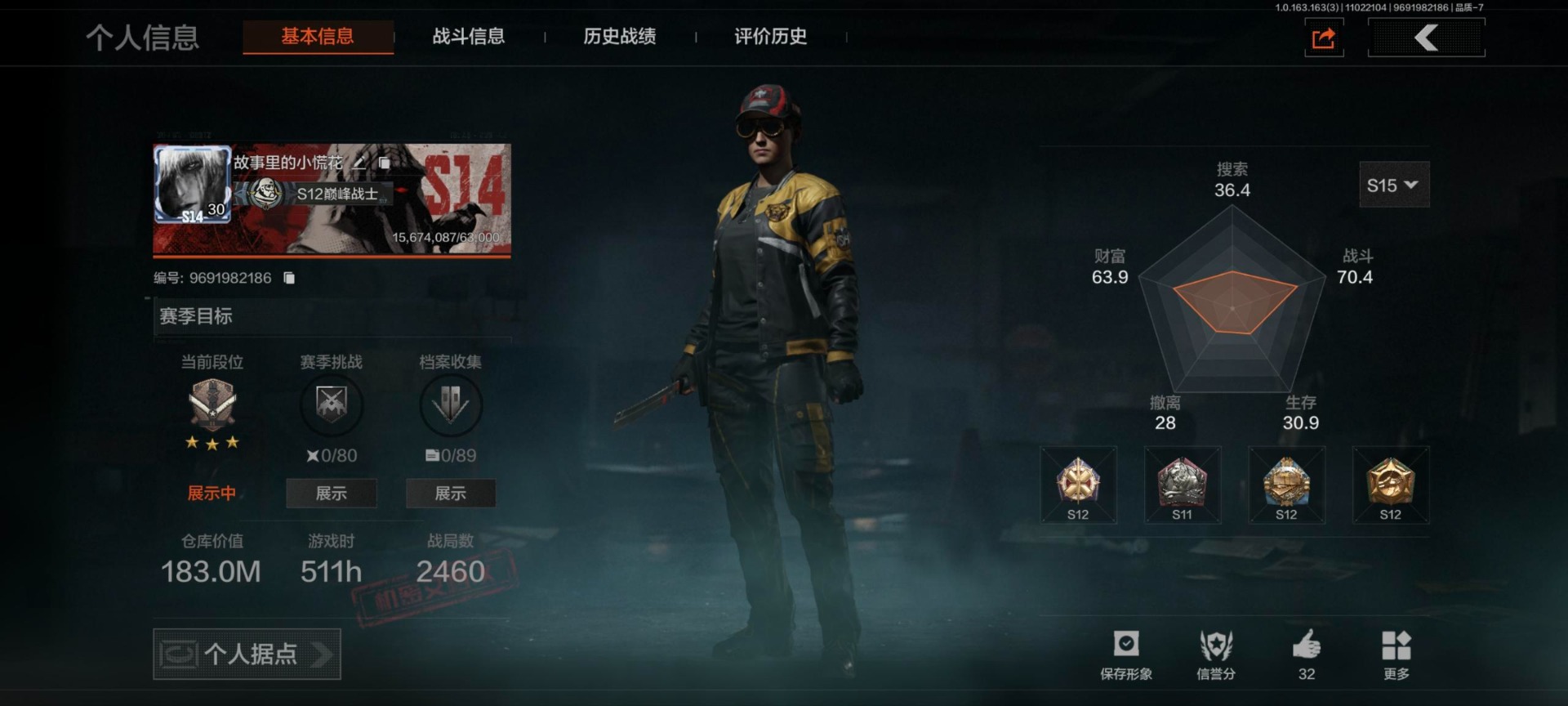 库存价值9.9 5近战武器 1金套装 1金枪皮 可修改实名 【柯恩币数量】:57345【角色装扮(金)】:火绒·塔莉娅【近战武器】:来战·开山刀,瀚星斩铁,工兵铲,涂鸦利刃,裁决手杖剑【金色枪皮】:竞技·FAL【紫色枪皮】:火绒·AK12,棱光裂变·AKM,无畏·USAS12,骑士之剑·SJ16,百锻寒芒·T03,百锻寒芒·T951,竞技·AUG,V·SKS,竞技·MDR,掌中盾·MP5,自喷网格·H416,来战·AK74N,德尔塔小队·M4A1,玄戈梨花·MPX,07式林地迷彩·QBZ191,全地形数码·M110【角色装扮(紫)】:都市夜影套装