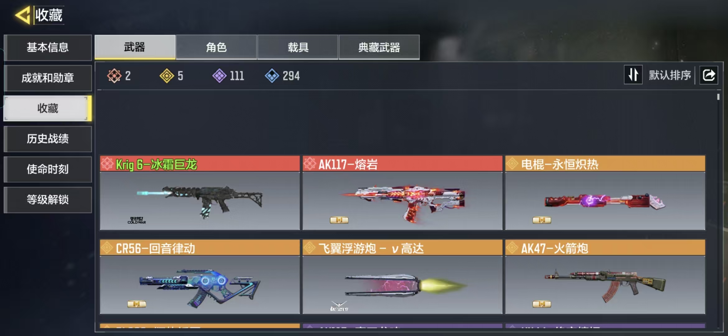 商品描述:MHZ2313【神话2 传说4】安卓Q-等级222-史诗枪械111【2神话】Krig6-冰霜巨龙 AK117-熔岩【4传说】 电棍-永恒炽热 AK47-火箭炮 飞翼浮游炮 - v高达 CR56-回音律动